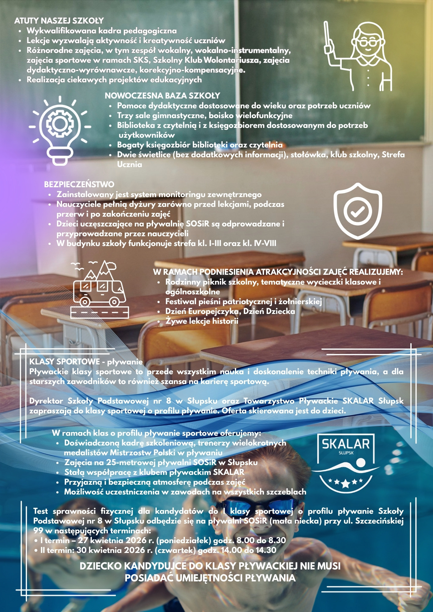Dodatkowo powinni posiadać kostium jednoczęściowy (dziewczęta), kąpielówki (chłopcy), czepek, okularki, ręcznik i klapki.