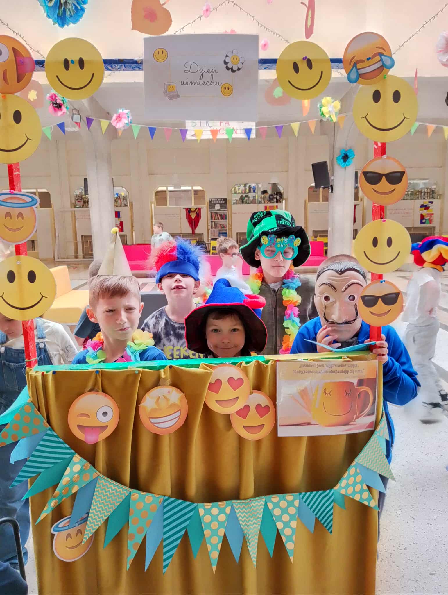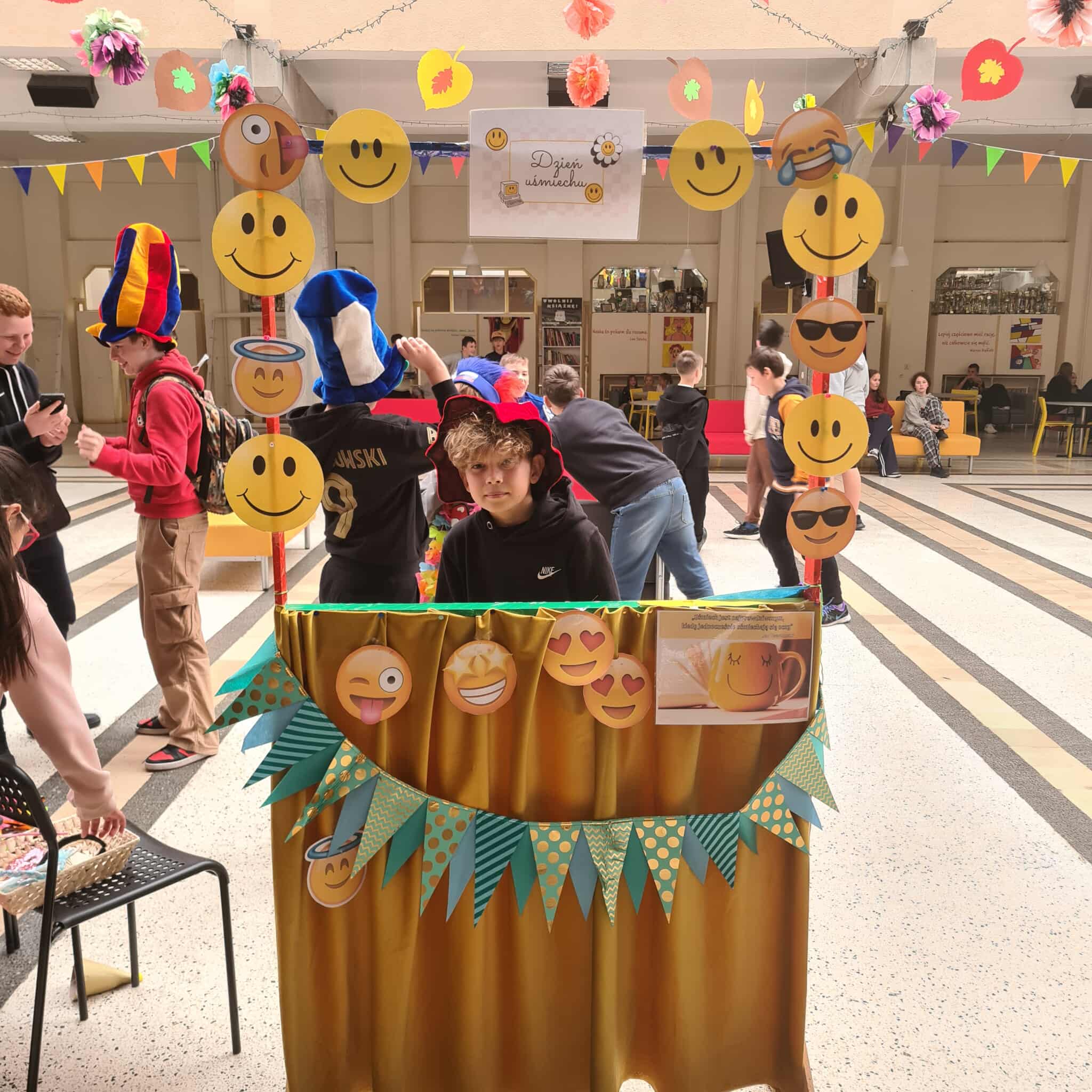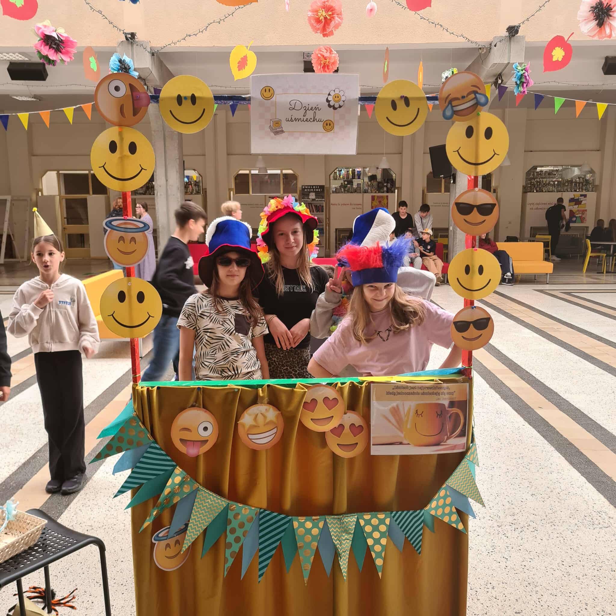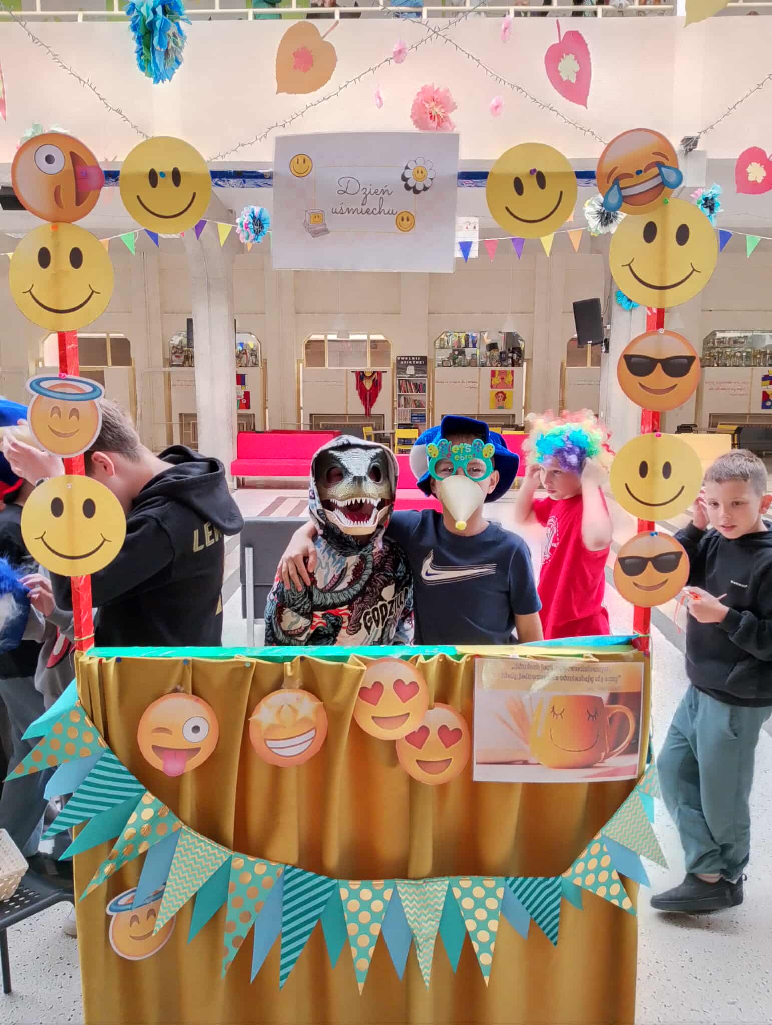 Dziś obchodziliśmy Światowy Dzień Uśmiechu. Z tej okazji w szkolnym holu ustawiona została radosna fotobudka z różnymi akcesoriami.