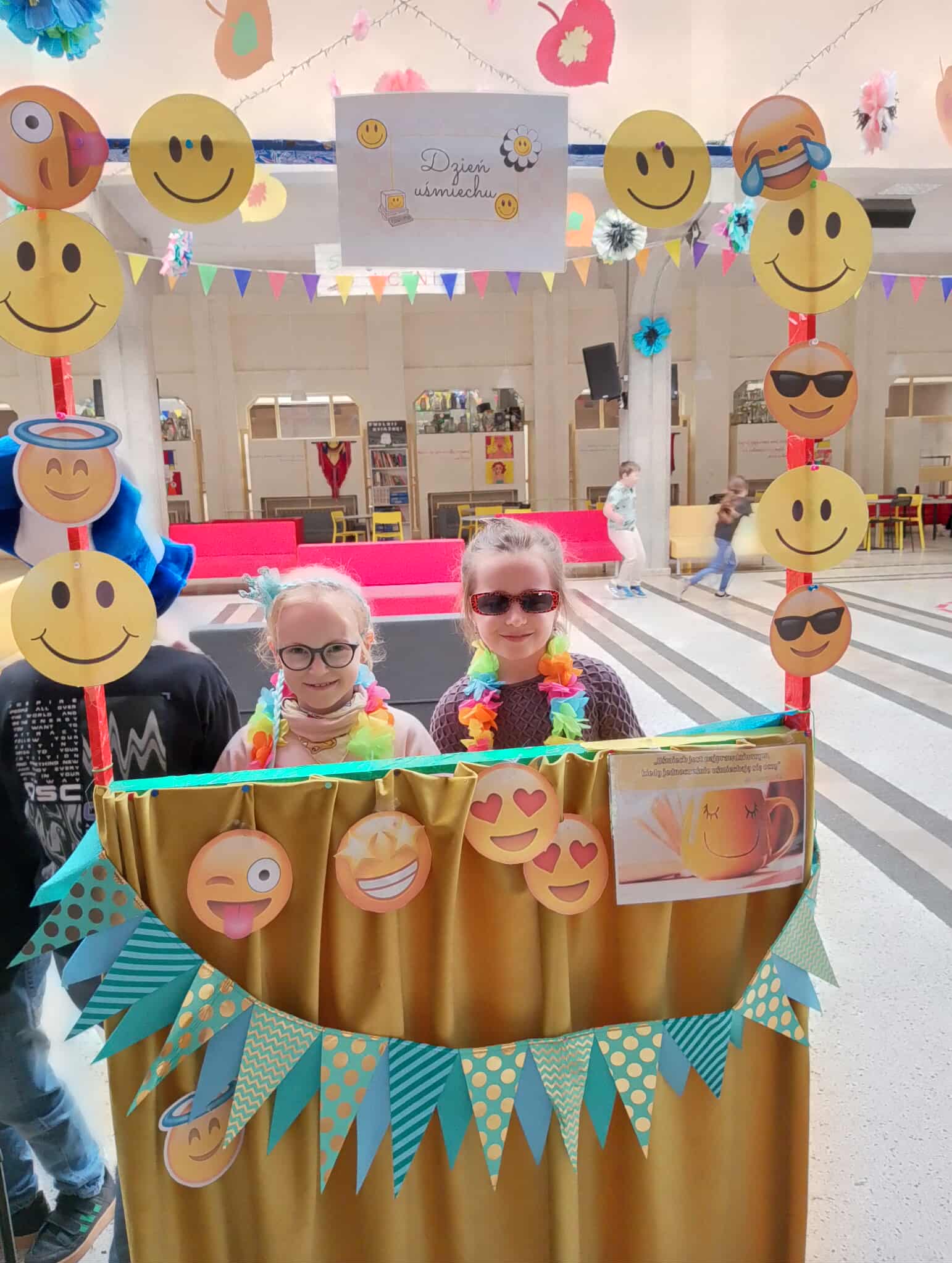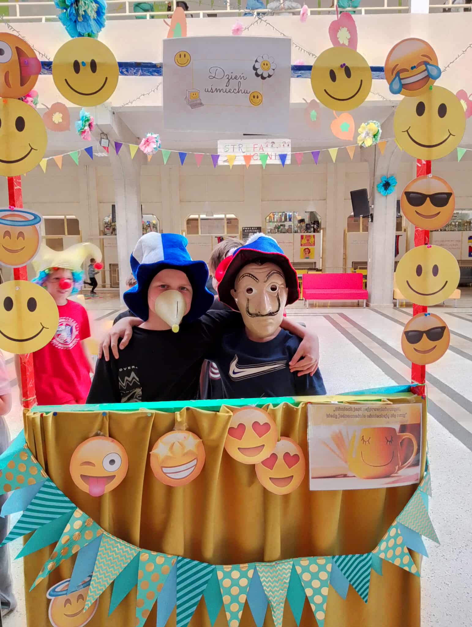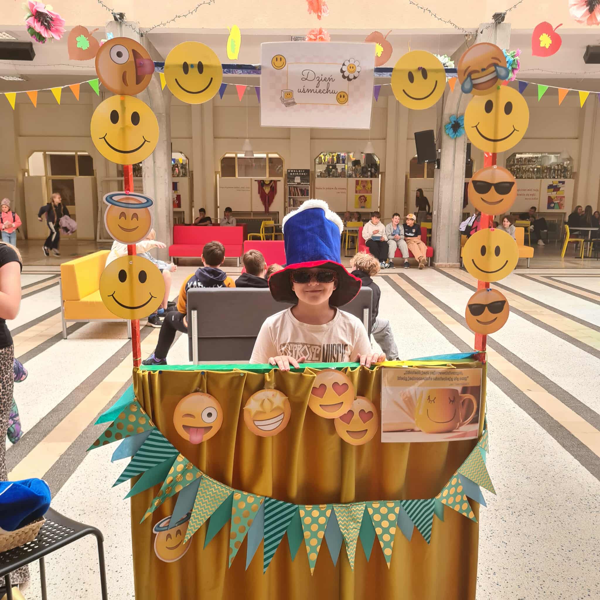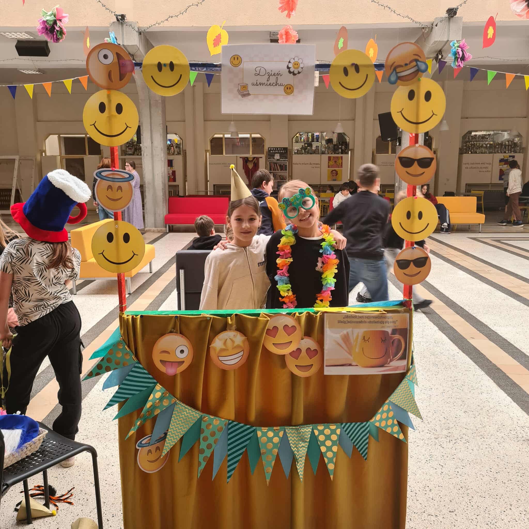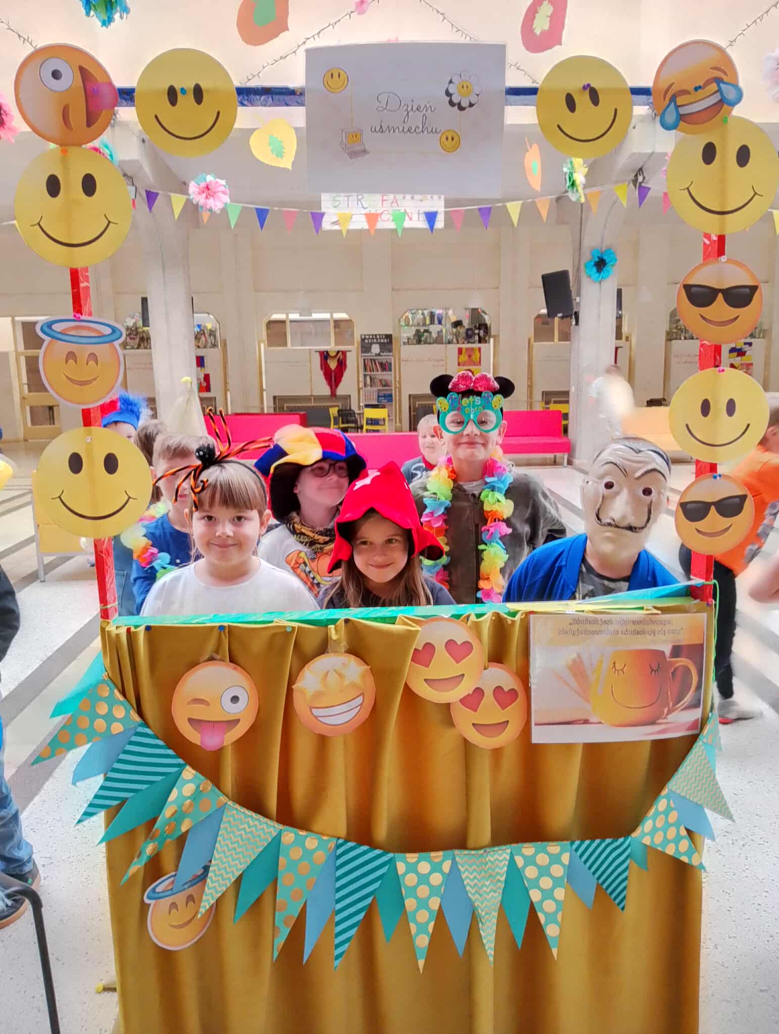 Dziś obchodziliśmy Światowy Dzień Uśmiechu. Z tej okazji w szkolnym holu ustawiona została radosna fotobudka z różnymi akcesoriami.