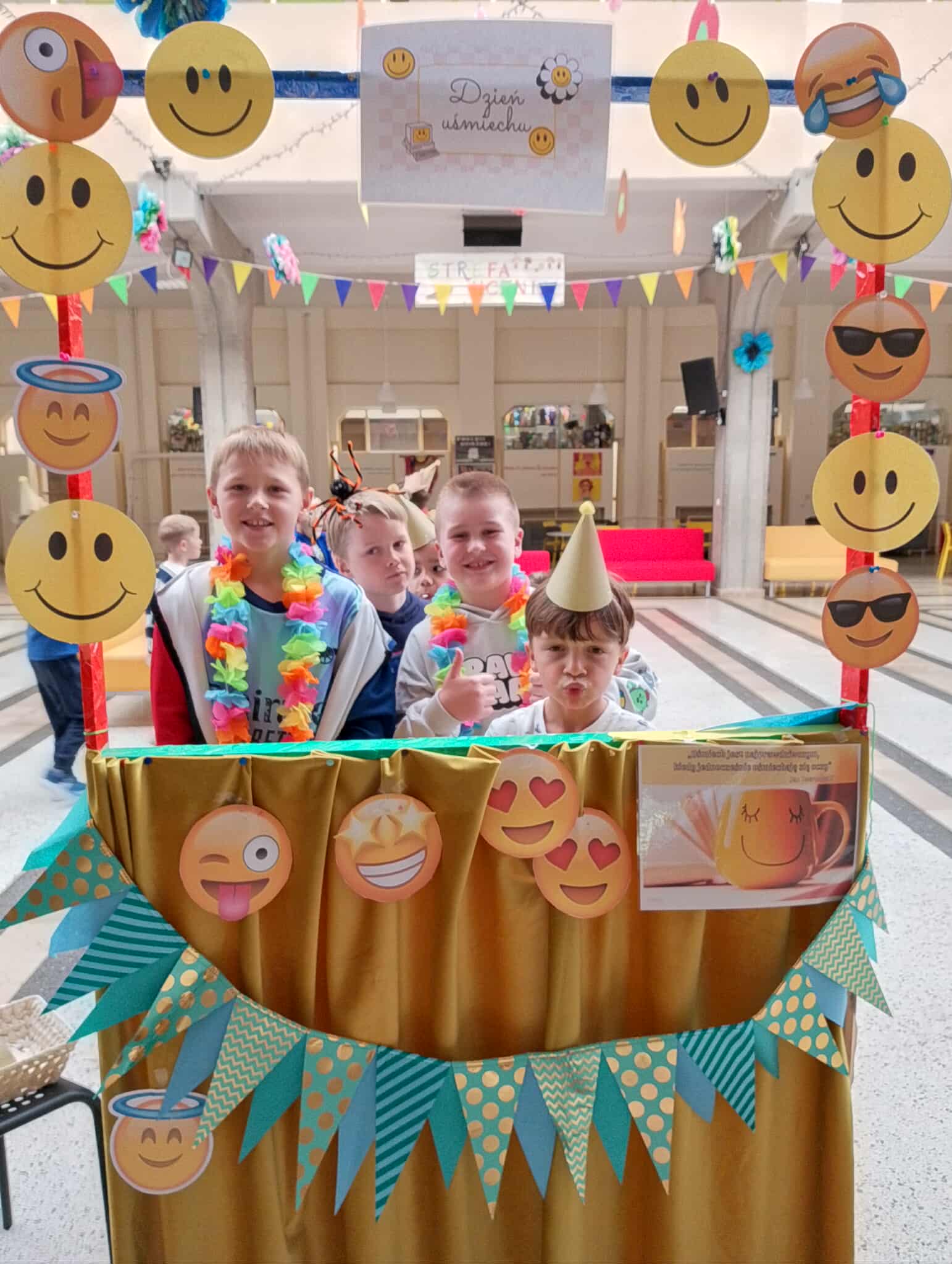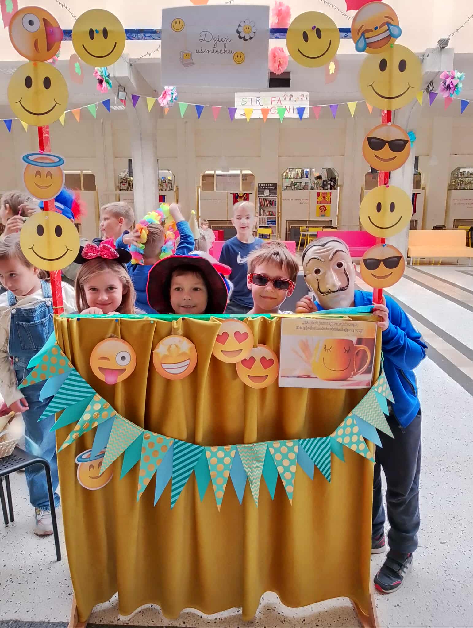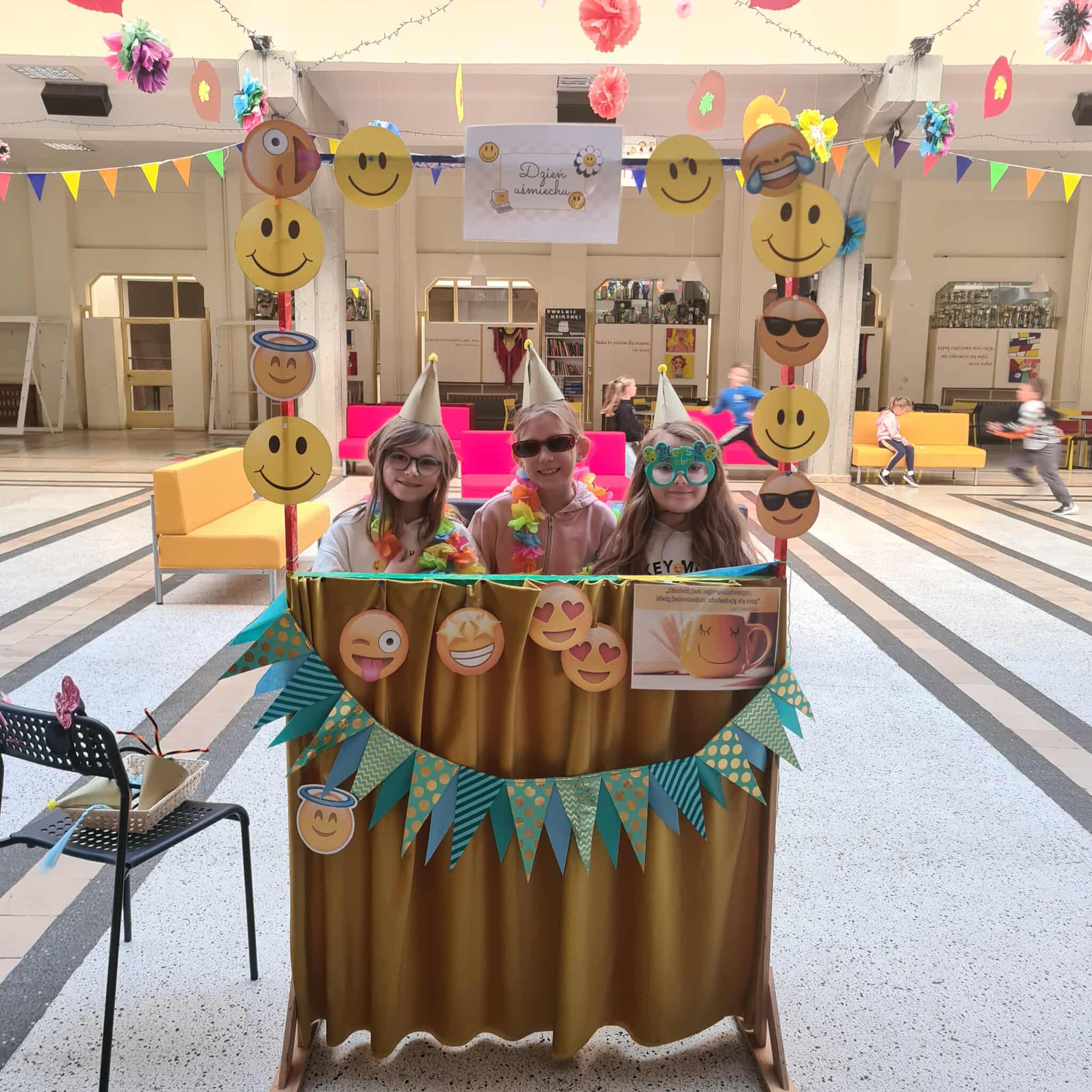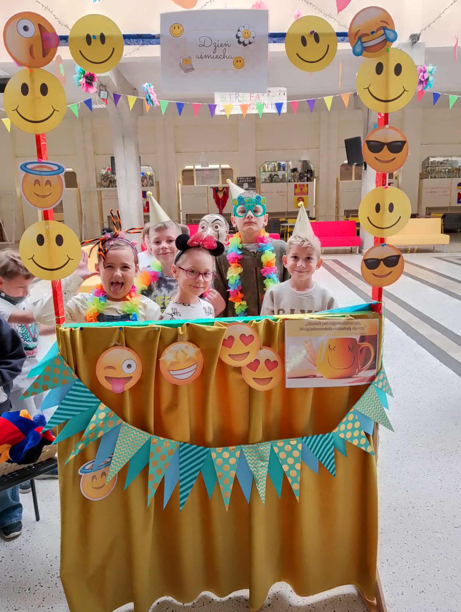 Dziś obchodziliśmy Światowy Dzień Uśmiechu. Z tej okazji w szkolnym holu ustawiona została radosna fotobudka z różnymi akcesoriami.