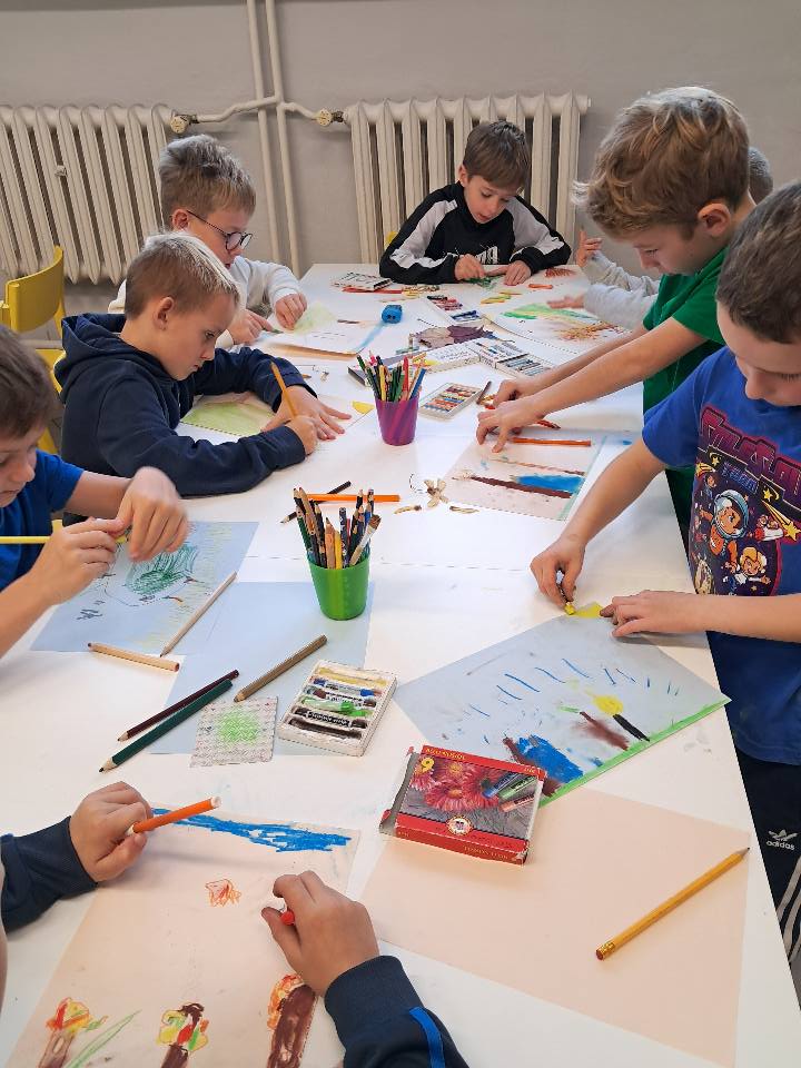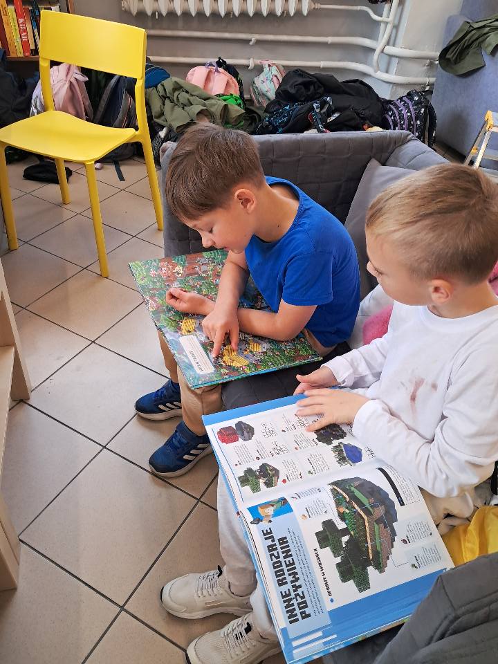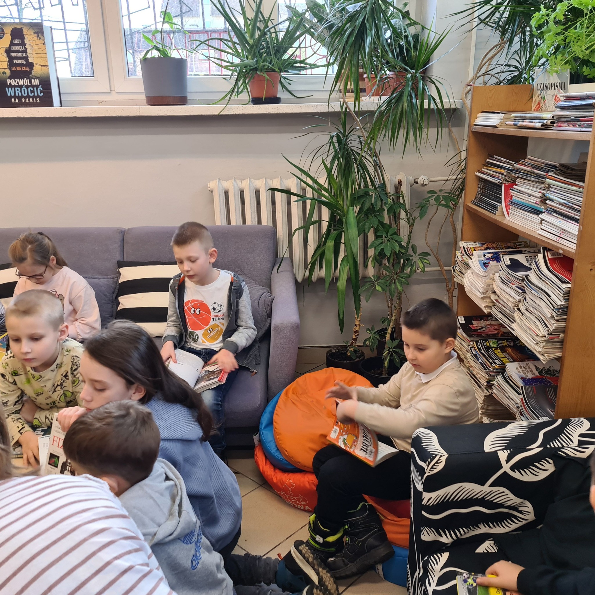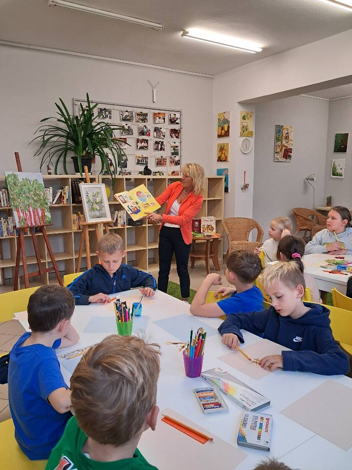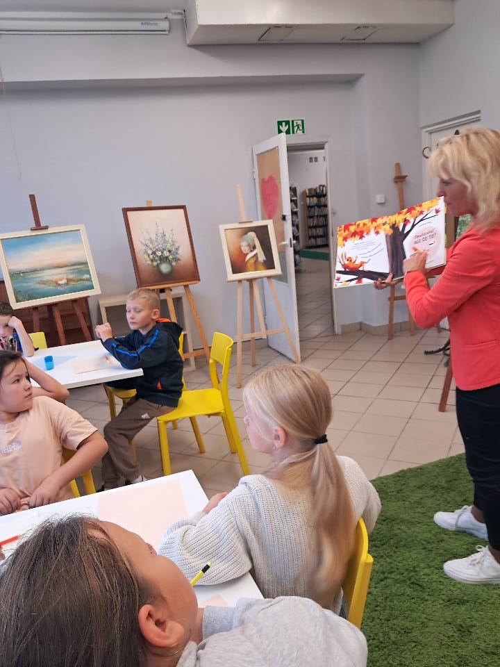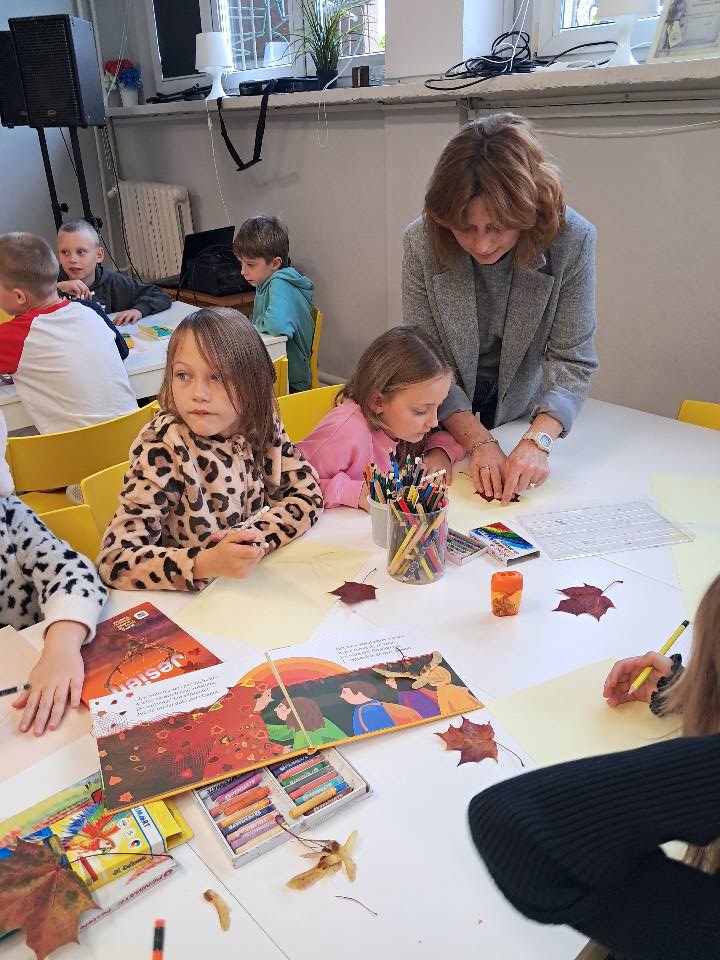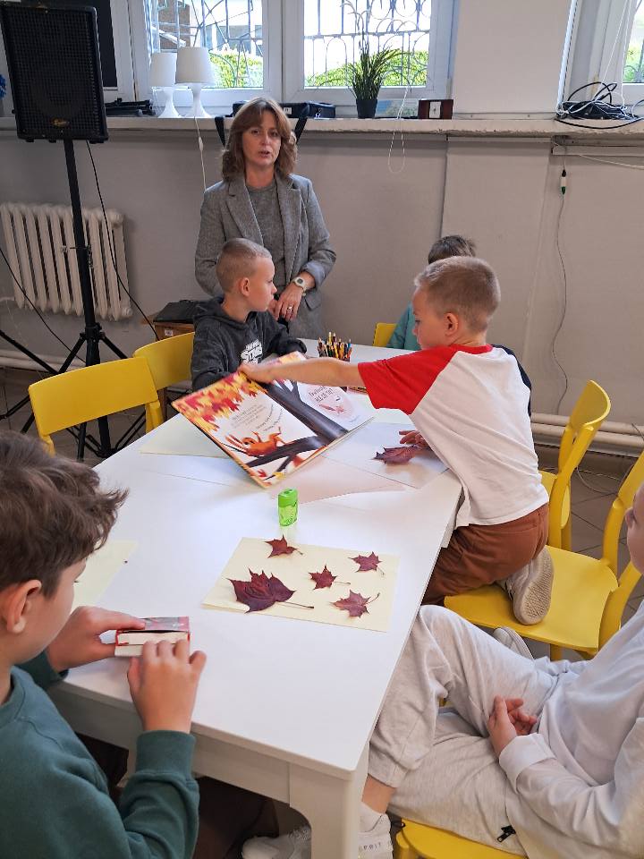 poświęconej literaturze o tematyce jesiennej. Zainspirowani wysłuchanymi tekstami wykonali prace plastyczne, które będzie można podziwiać na wystawie w kąciku czytelniczym. Dzieci obejrzały też pomieszczenia biblioteczne, zwłaszcza nowy kącik dla najmłodszych czytelników oraz zapoznały się ze zbiorami bibliotecznymi. Mogły też poczytać wybraną książkę. Czas upłynął w miłej, twórczej atmosferze, a dzieci obiecały czesto odwiedzać placówkę. Spotkanie zorganizowała szkolna bibliotekarka Mariola Ostrowska, zajęcia poprowadziła bibliotekarka z filii nr8 Pani Barbara Jękorek.