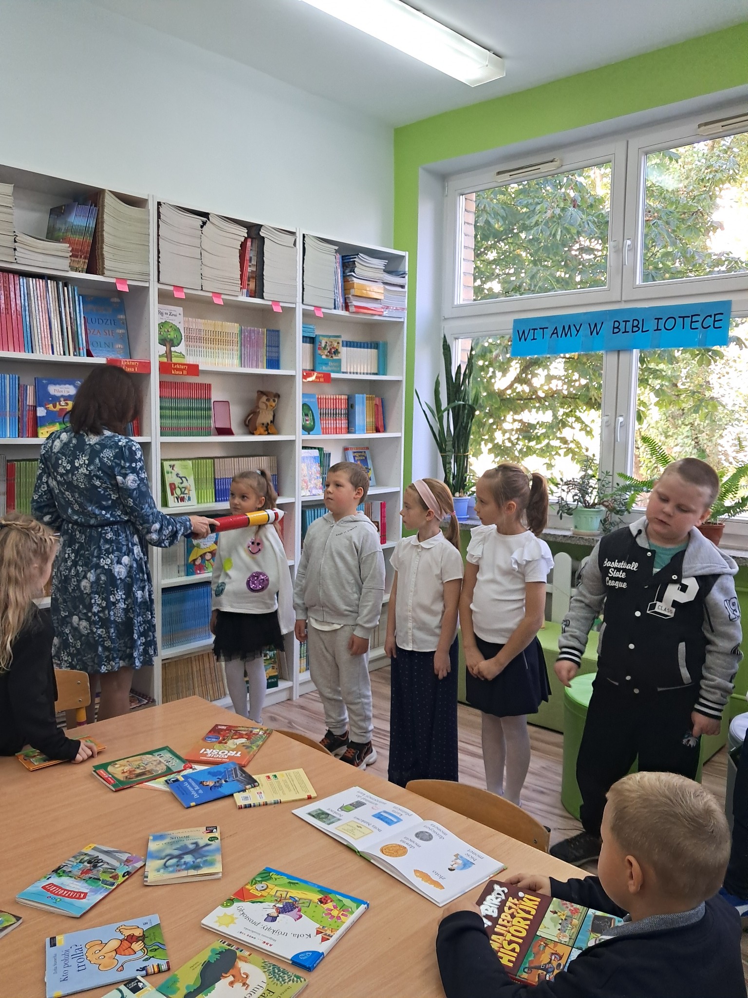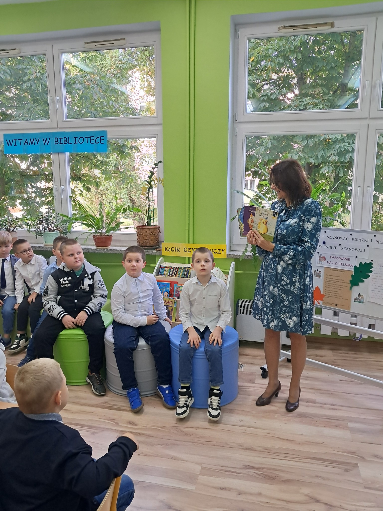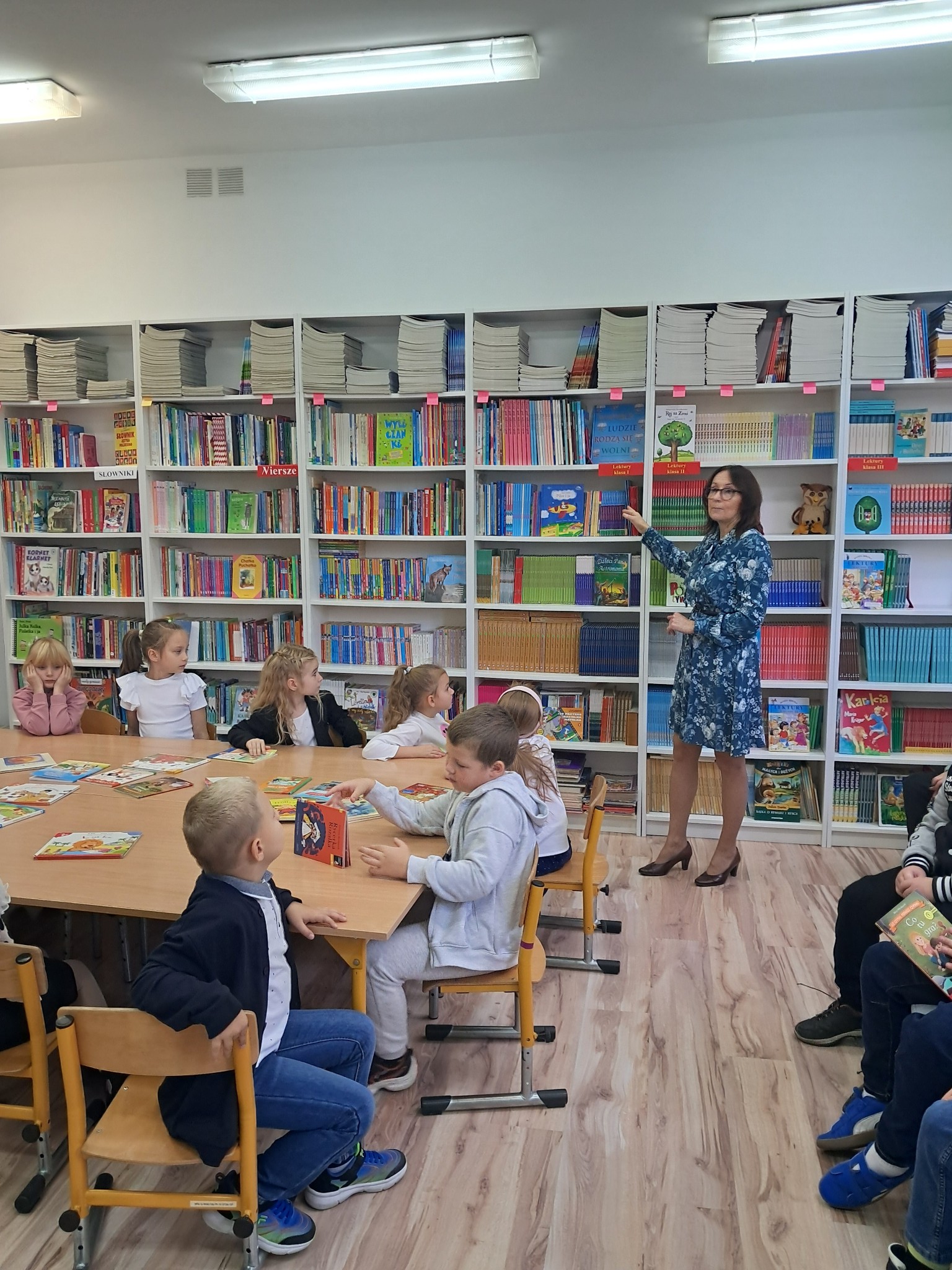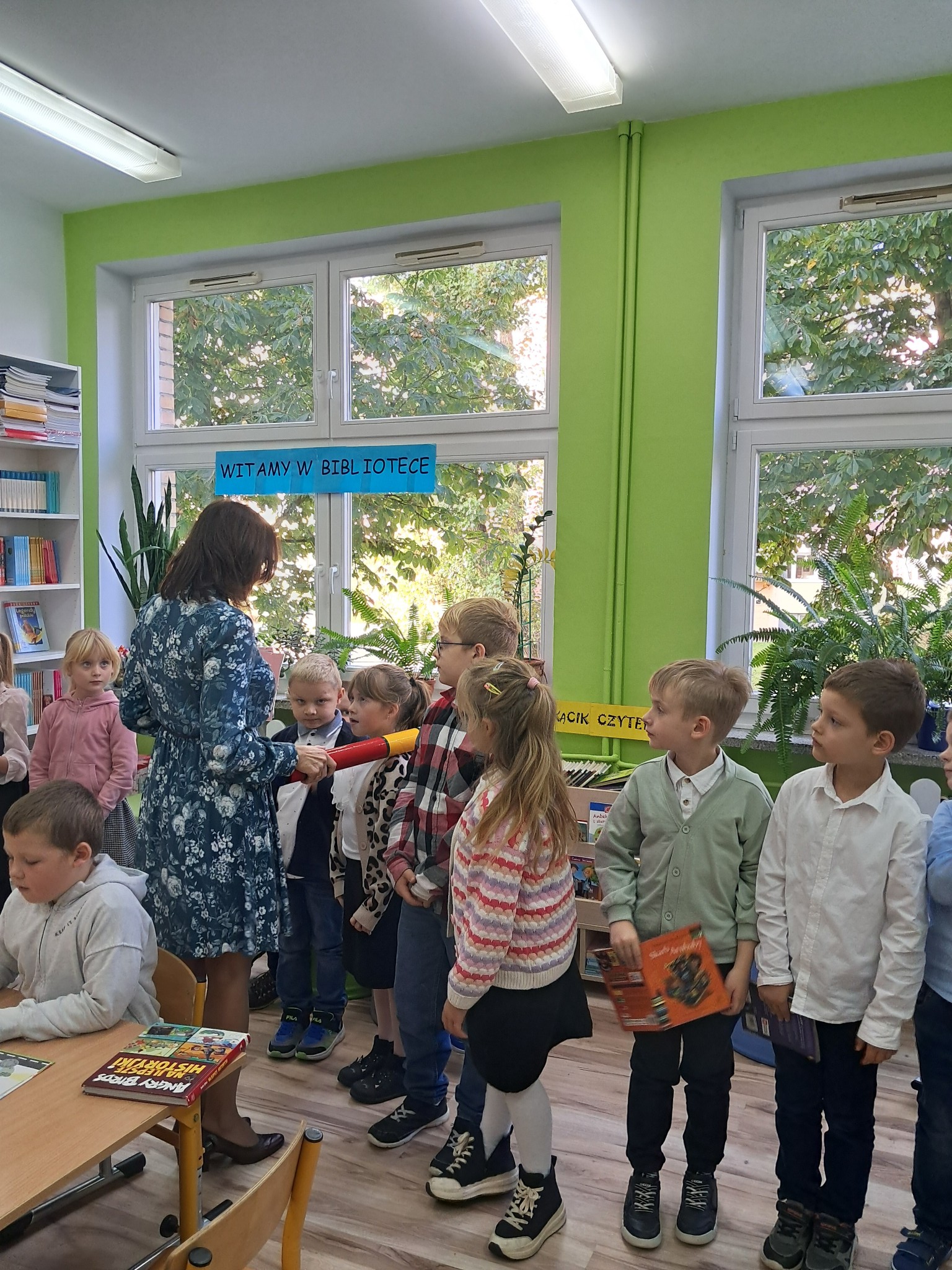 Dzieci poznały zasady korzystania z biblioteki i czytelni oraz zbiory biblioteczne przeznaczone dla ich grupy wiekowej. Następnie złożyły uroczyste przyrzeczenie przestrzegania obowiązków czytelnika. Każdy uczeń otrzymał piękną, kolorową zakładkę wykonaną przez szkolnych wolontariuszy. Na koniec czytelnicy z 1a wypożyczyli wybraną przez siebie książkę. Zajęcia poprowadziła bibliotekarka Mariola Ostrowska.