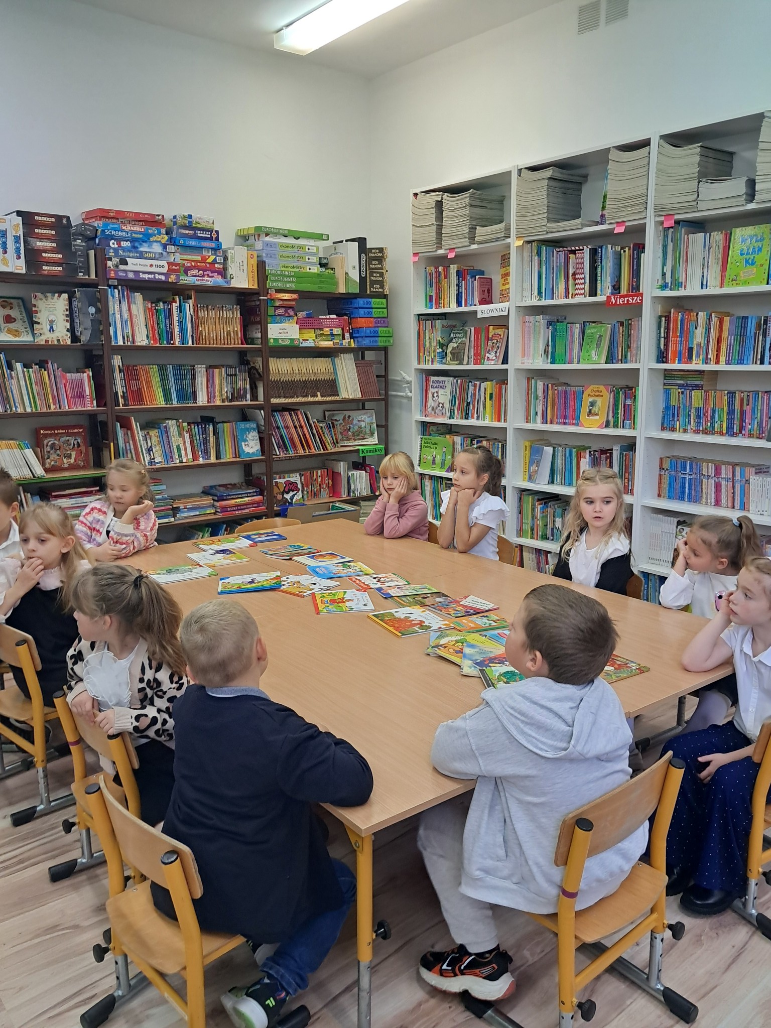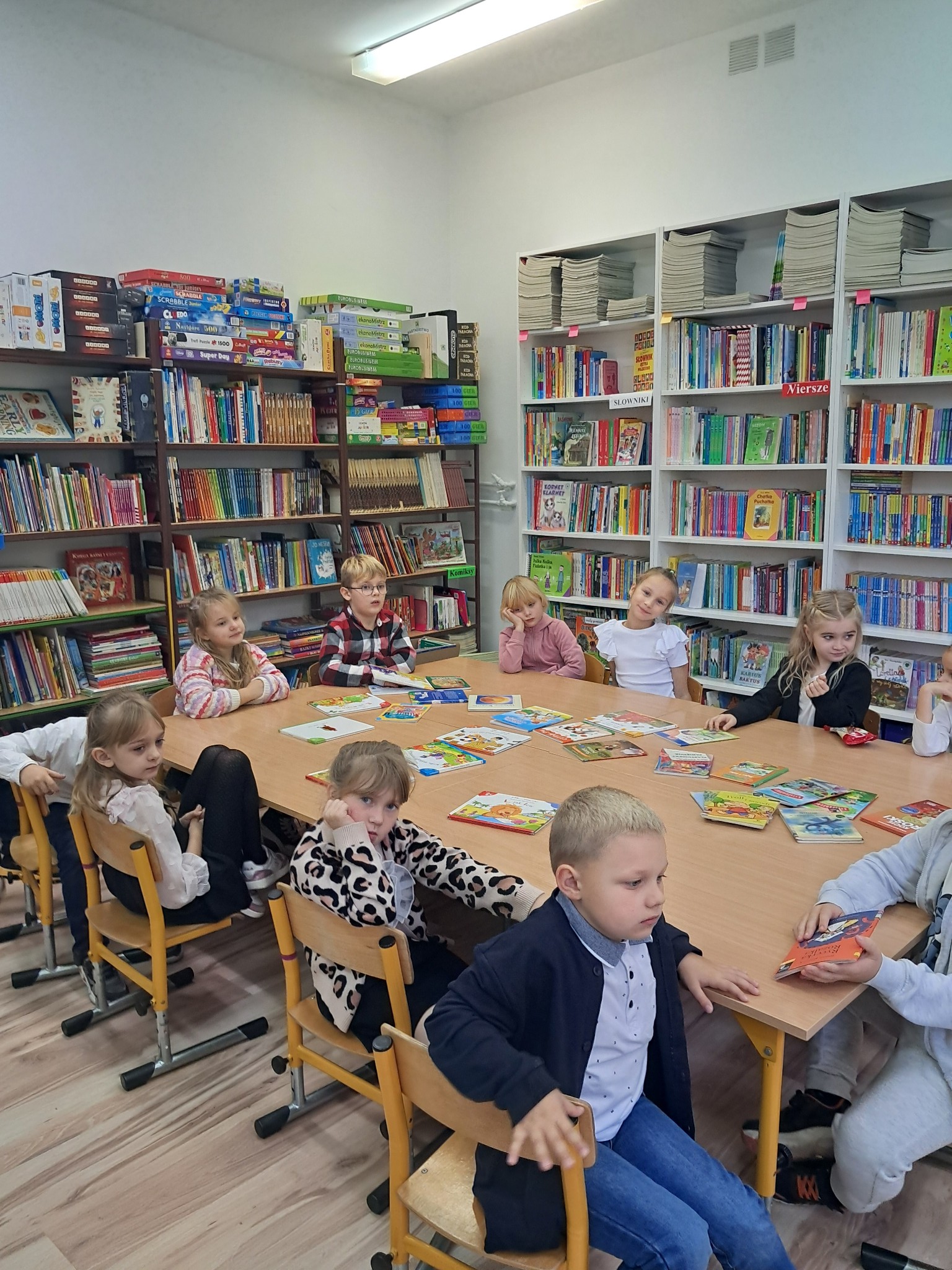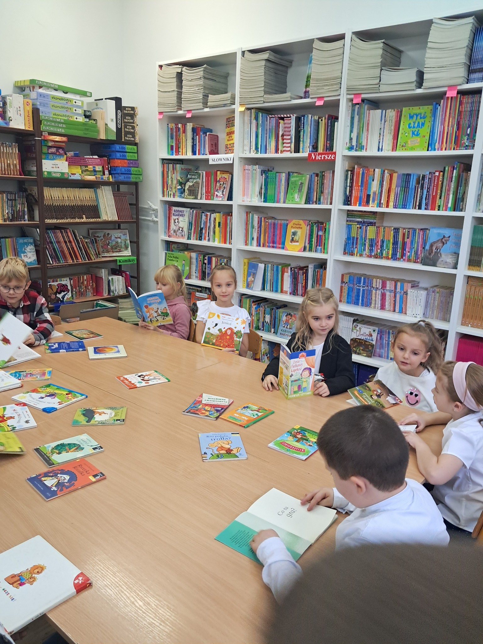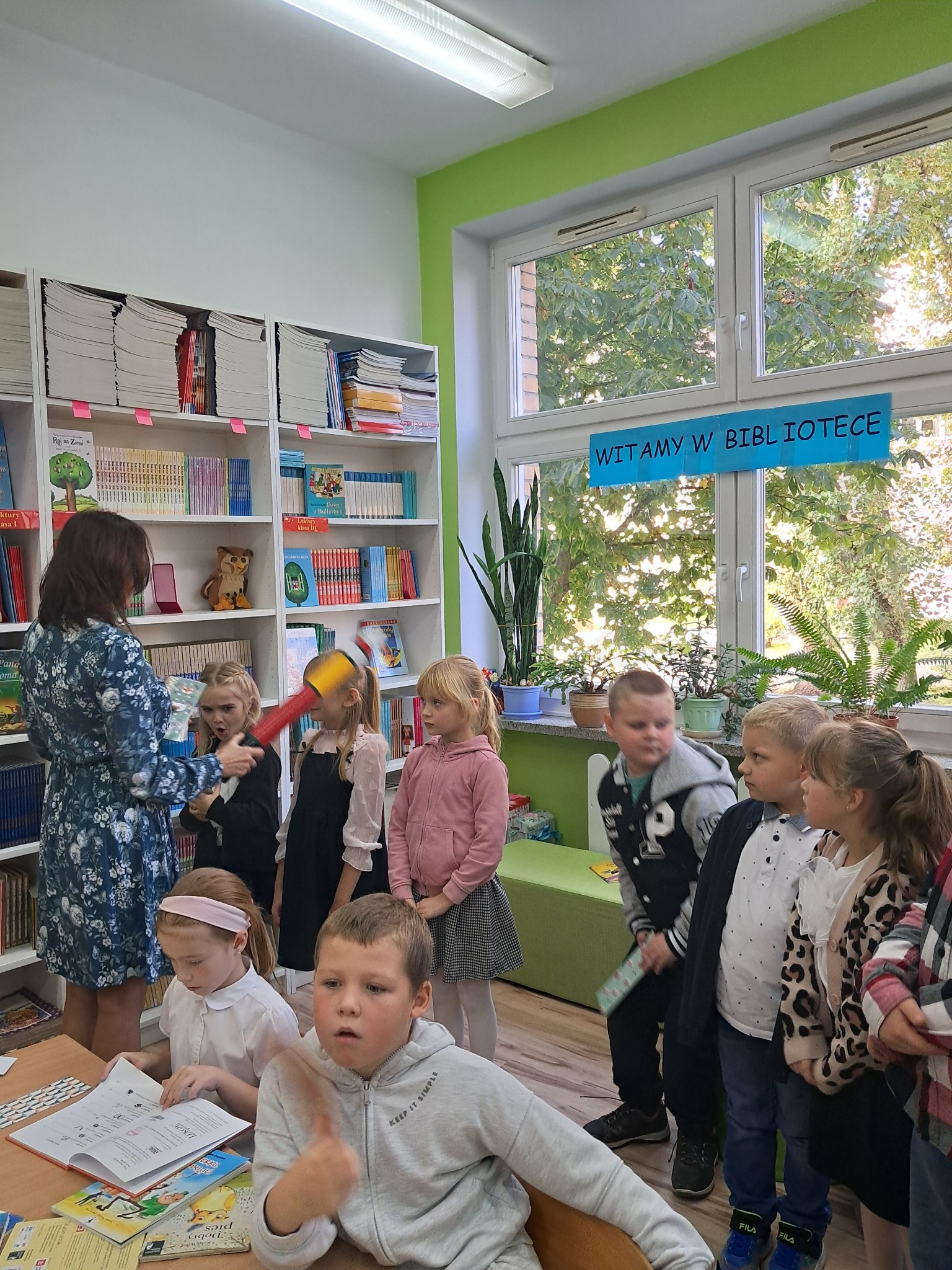 Dzieci poznały zasady korzystania z biblioteki i czytelni oraz zbiory biblioteczne przeznaczone dla ich grupy wiekowej. Następnie złożyły uroczyste przyrzeczenie przestrzegania obowiązków czytelnika. Każdy uczeń otrzymał piękną, kolorową zakładkę wykonaną przez szkolnych wolontariuszy. Na koniec czytelnicy z 1a wypożyczyli wybraną przez siebie książkę. Zajęcia poprowadziła bibliotekarka Mariola Ostrowska.