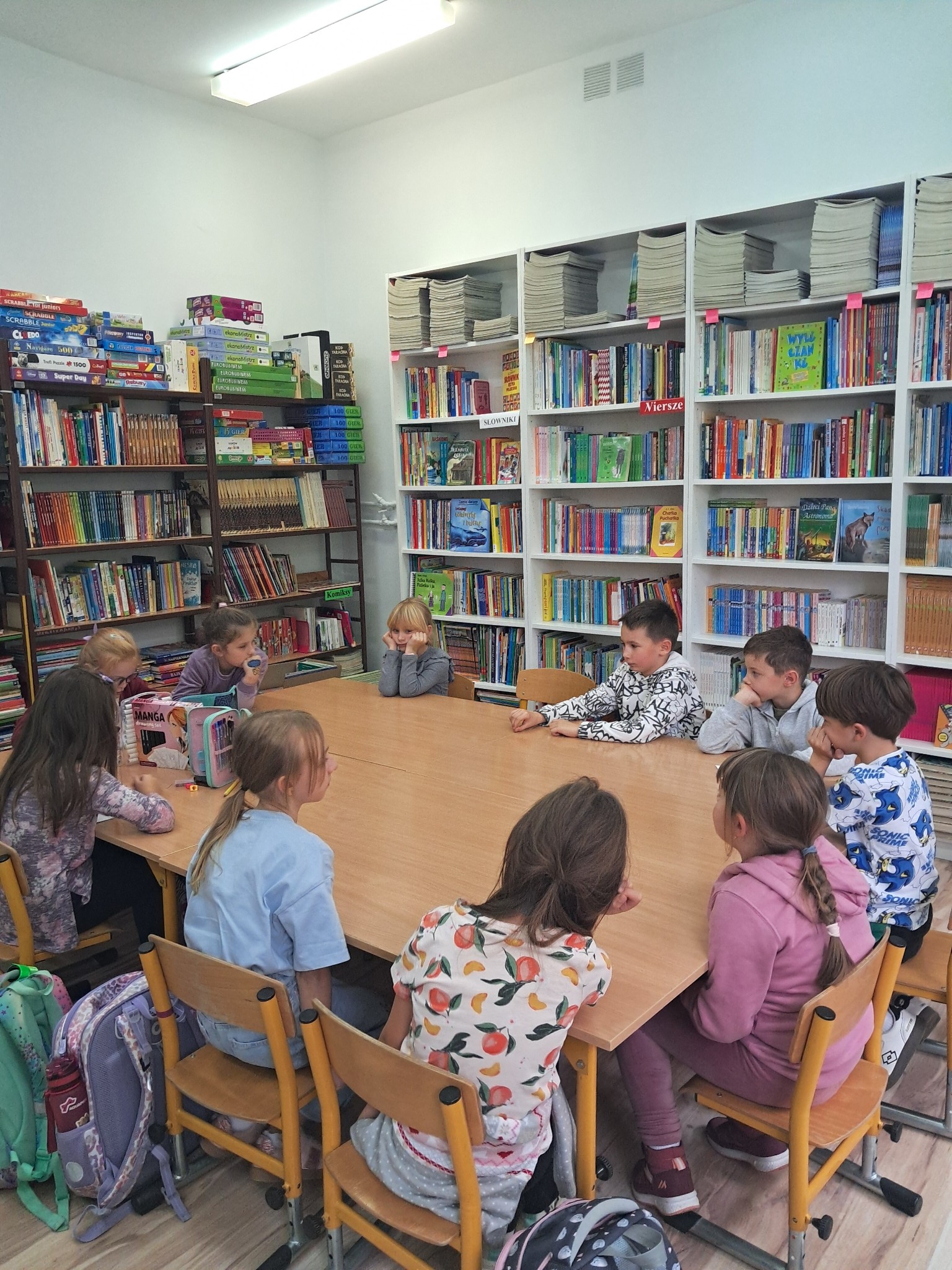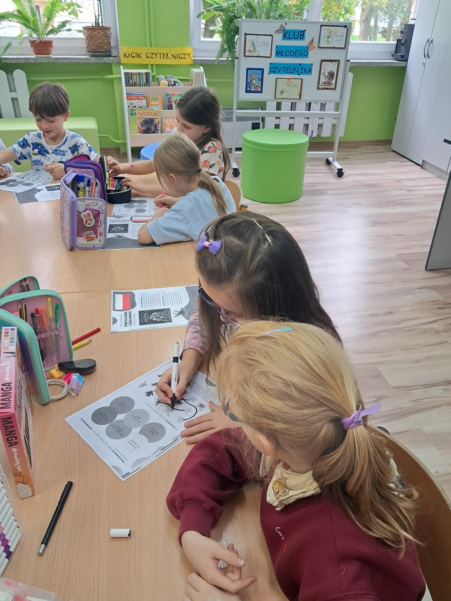 w towarzystwie przebojowej ekipy książek międzynarodowych autorów. Oprócz wielkiej przyjemnosci z czytania, przeżywamy tu wielką eksplozję kreatywności wykonując niebanalne ćwiczenia językowe i manualne, rozwiązując łamigłówki literackie, rebusy, krzyżówki. Spotkania prowadzone przez bibliotekarkę Mariolę Ostrowską odbywają się raz w tygodniu.