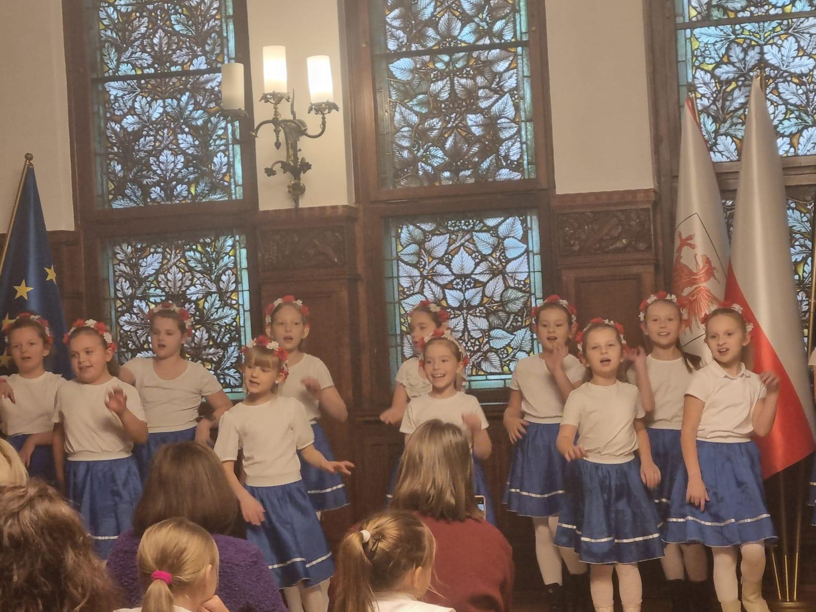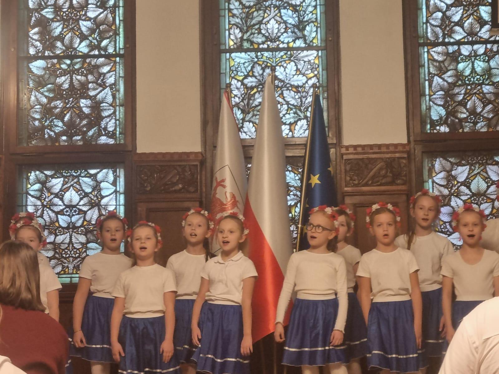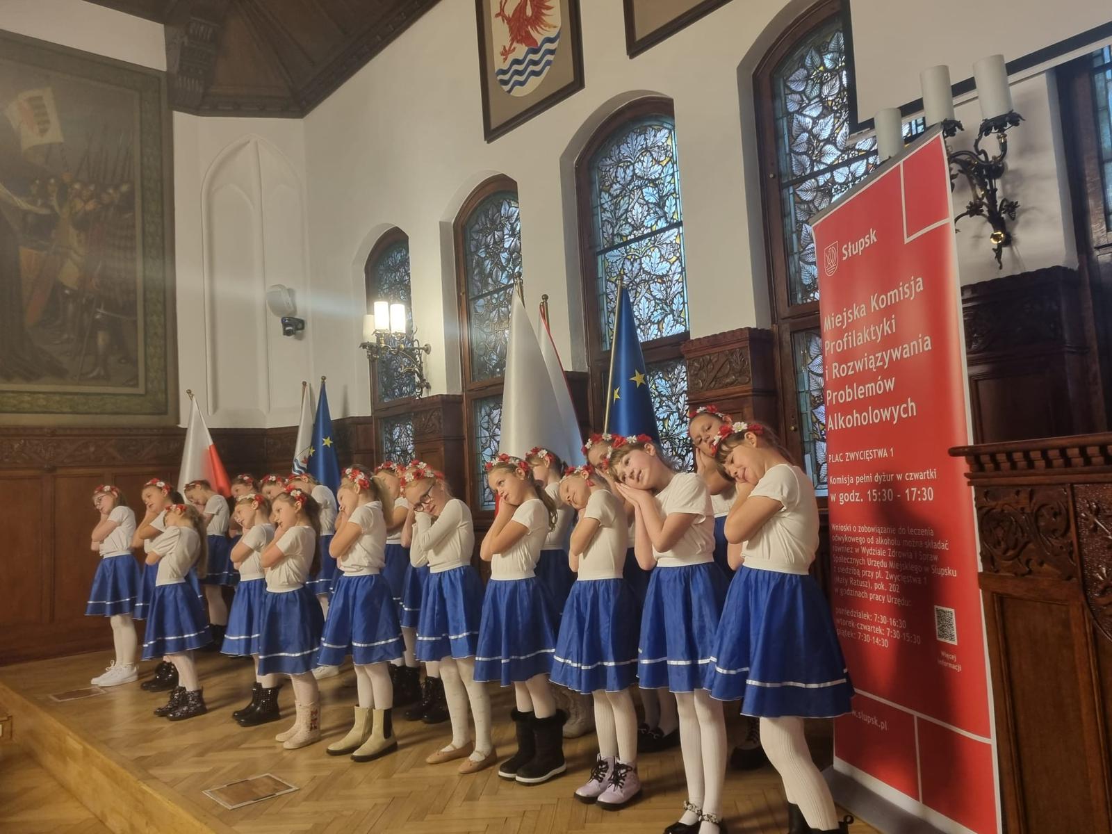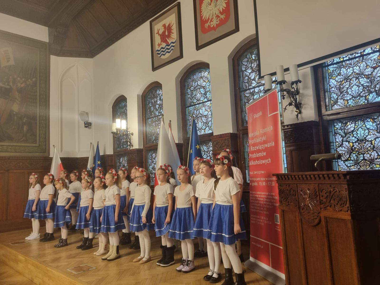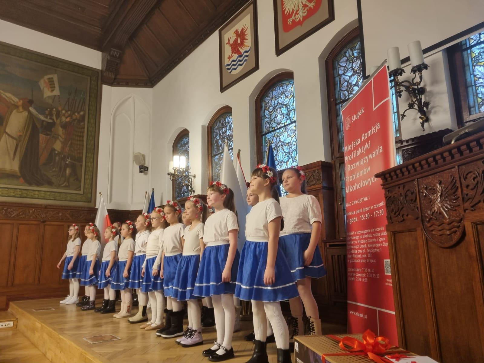 w ramach Międzynarodowego Dnia Przeciwdziałania Agresji Wobec Dzieci. Zespół z naszej szkoły ( z kl. I-III) ”SŁONECZKA” pod opieką pani Iwony Sazon miał zaszczyt uświetnić swoim występem tą uroczystość. Dzieci pięknie się zaprezentowały i zachwyciły gości ze Słupska i okolic. Gratulujemy!