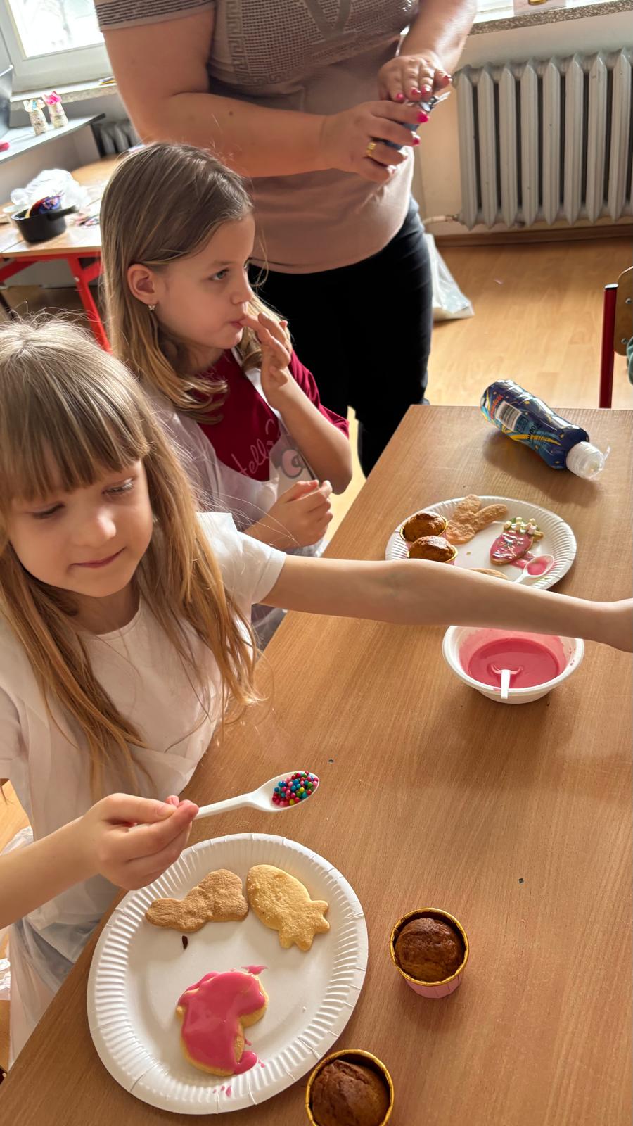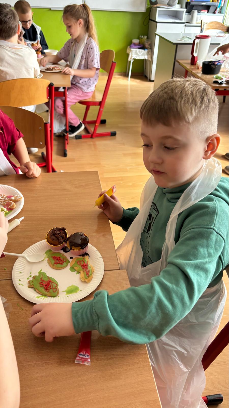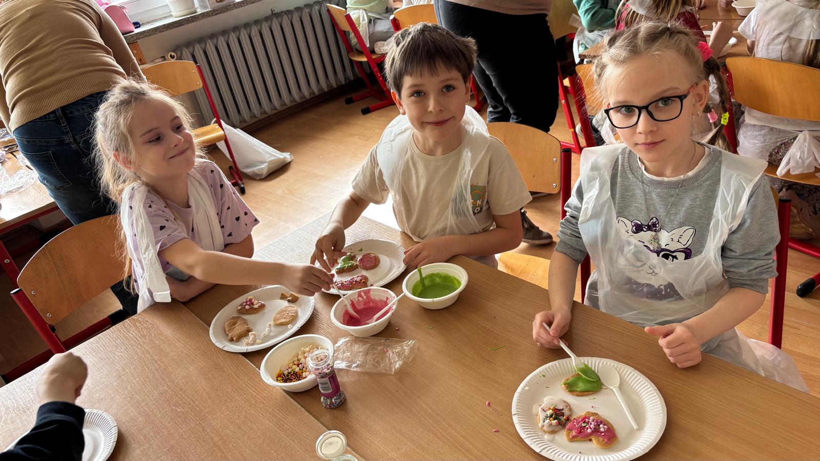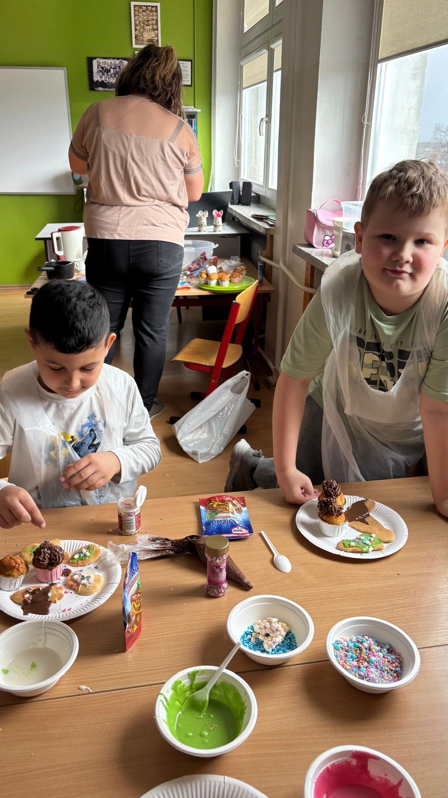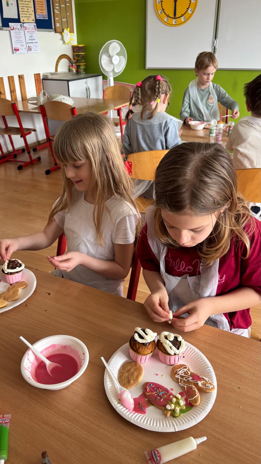 01.04.2026 r. w klasie 1b zapachniało Wielkanocą. Mamy dzieci z klasy zorganizowały warsztaty ozdabiania wielkanocnych ciastek i babeczek upieczonych wcześniej w domu.