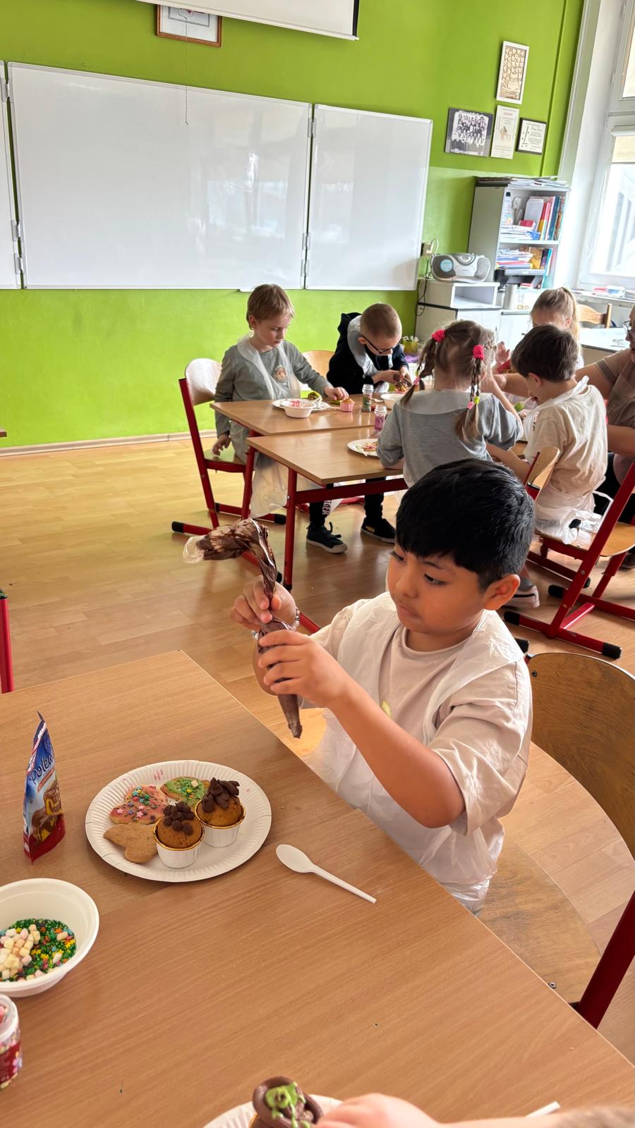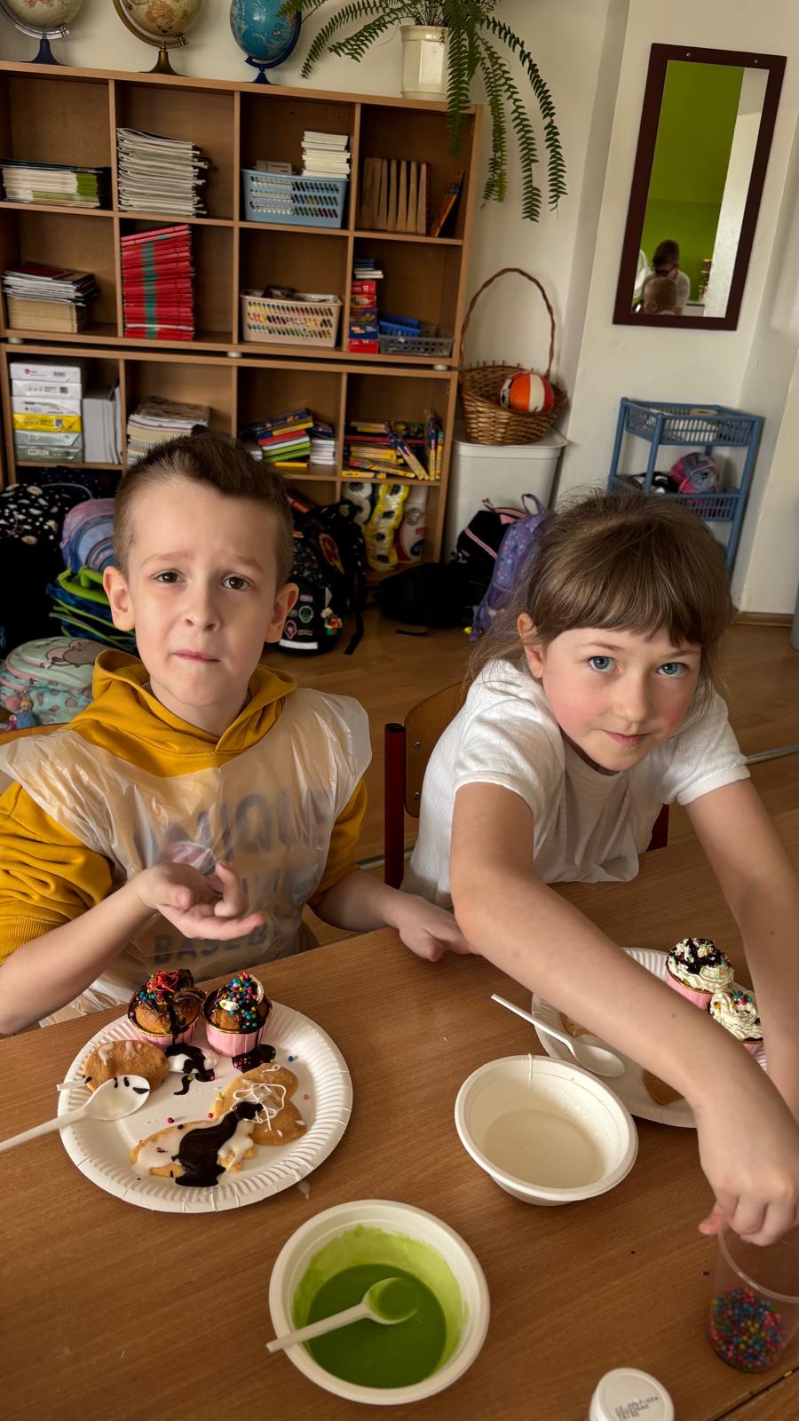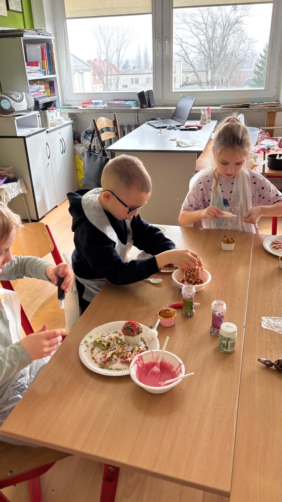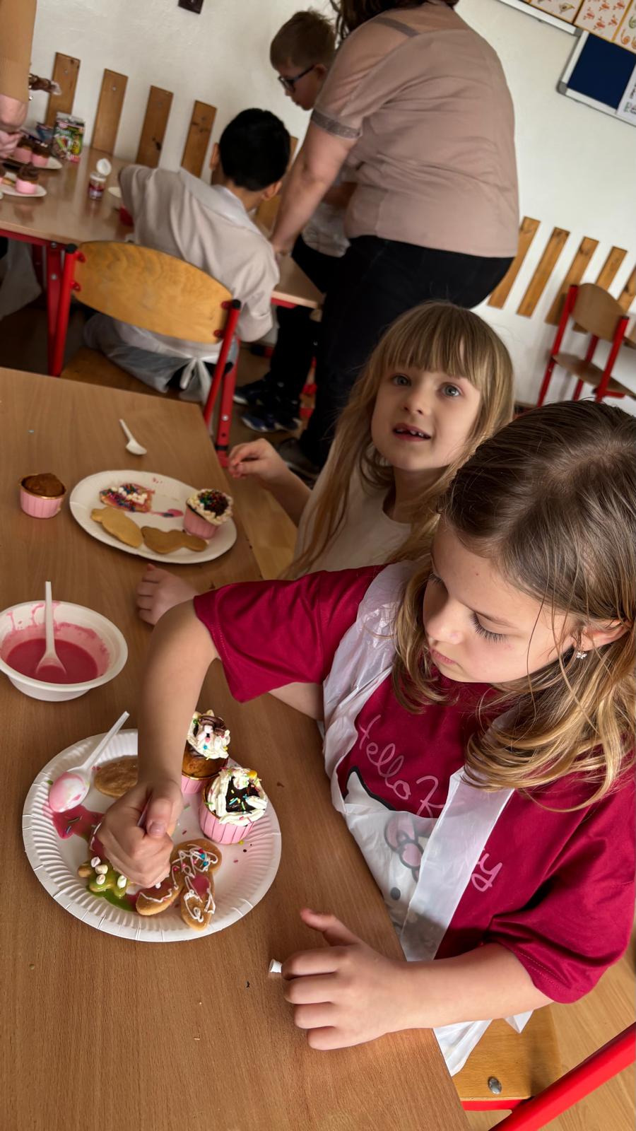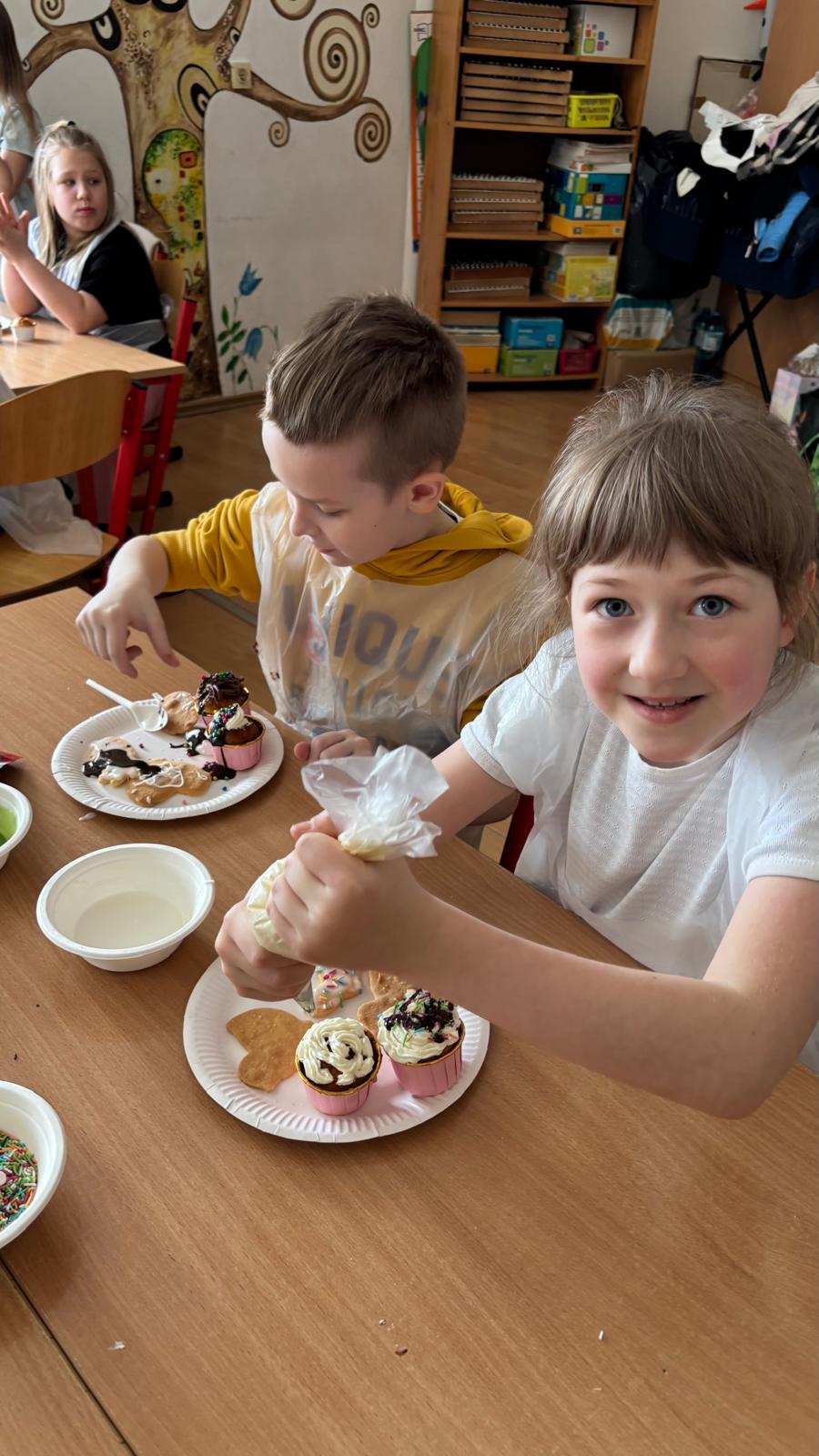 01.04.2026 r. w klasie 1b zapachniało Wielkanocą. Mamy dzieci z klasy zorganizowały warsztaty ozdabiania wielkanocnych ciastek i babeczek upieczonych wcześniej w domu.