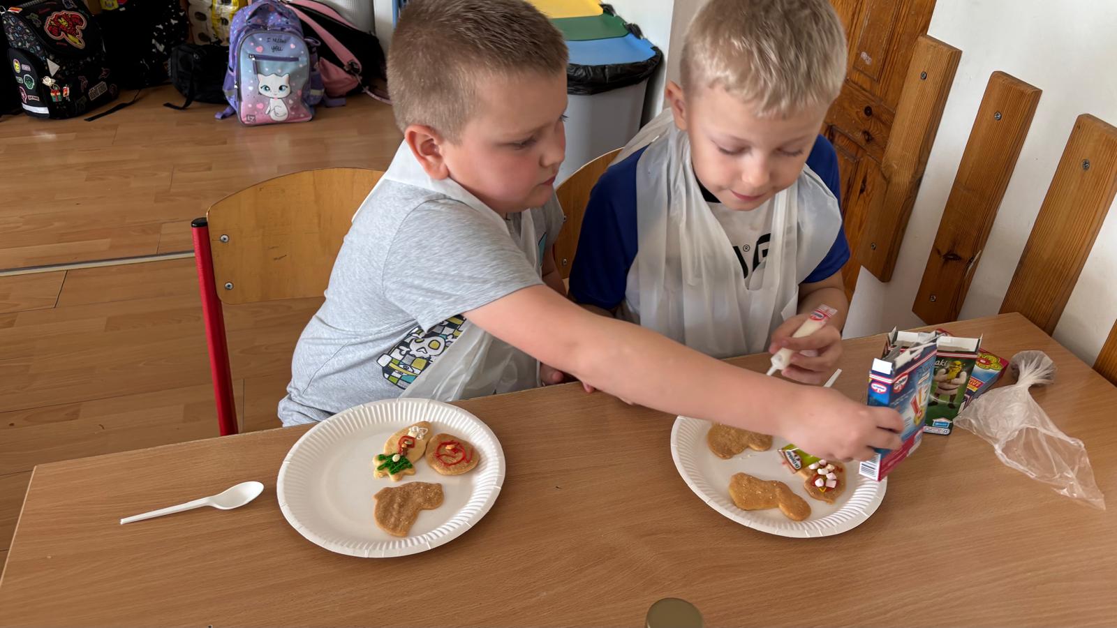 Dzieci wcieliły się w rolę cukierników, wykazały się kreatywnością i świetnymi pomysłami w ozdabianiu wielkanocnych wyrobów. W ruch poszły rożnosmakowe polewy, kremy, lukry i kolorowe posypki. Ileż było zabawy i radości! Na koniec piękne, kolorowe wypieki dzieci z wielką przyjemnością posmakowały, a pozostałe przyozdobione zapakowały do pojemników, aby poczęstować swoją rodzinę. Dzieciom bardzo podobały się takie warsztaty.