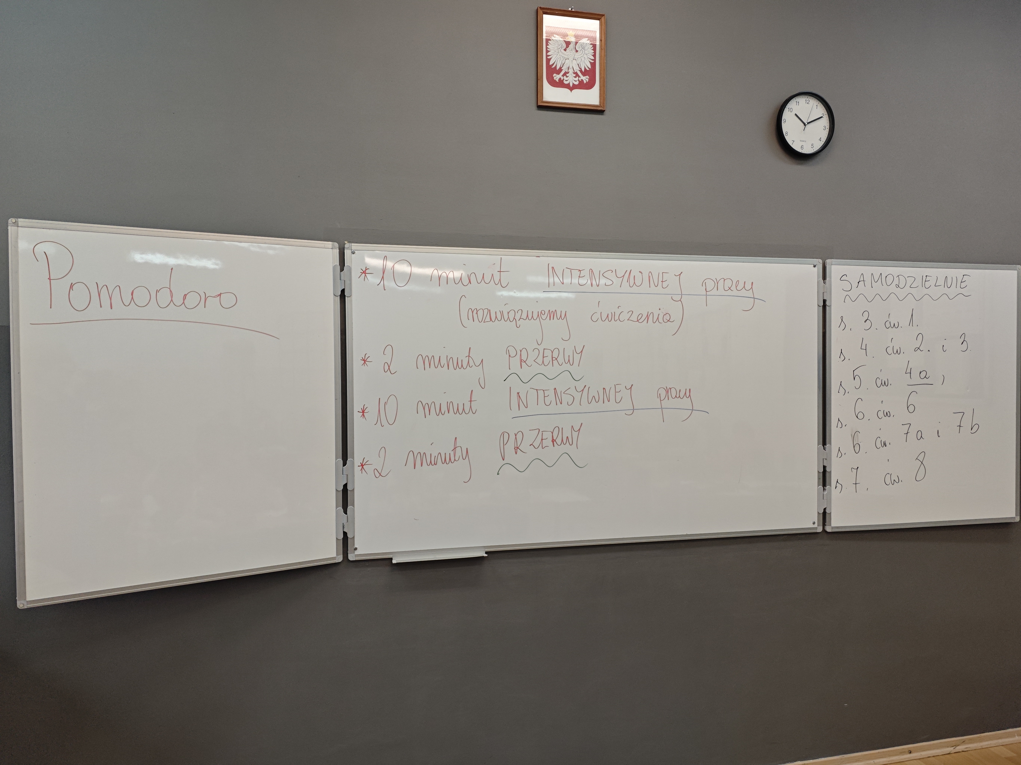 Polega ona na intensywnej pracy w określonych blokach czasowych z krótkimi przerwami. W ten sposób uczniowie skupiają się na wybranym zadaniu, mają więcej energii i osiągają lepsze wyniki. Technika ta wspomaga efektywną naukę. Uczniom bardzo spodobał się taki sposób prowadzenia zajęć. W odmierzaniu czasu pracy i odpoczynku pomocne okazały się klepsydry. Zadanie zostało wykonane w ramach innowacji „Pomysł na naukę” realizowanej w klasach 5a, 5c i 7d przez p. M. Piórkowską oraz p. M. Ostrowską.