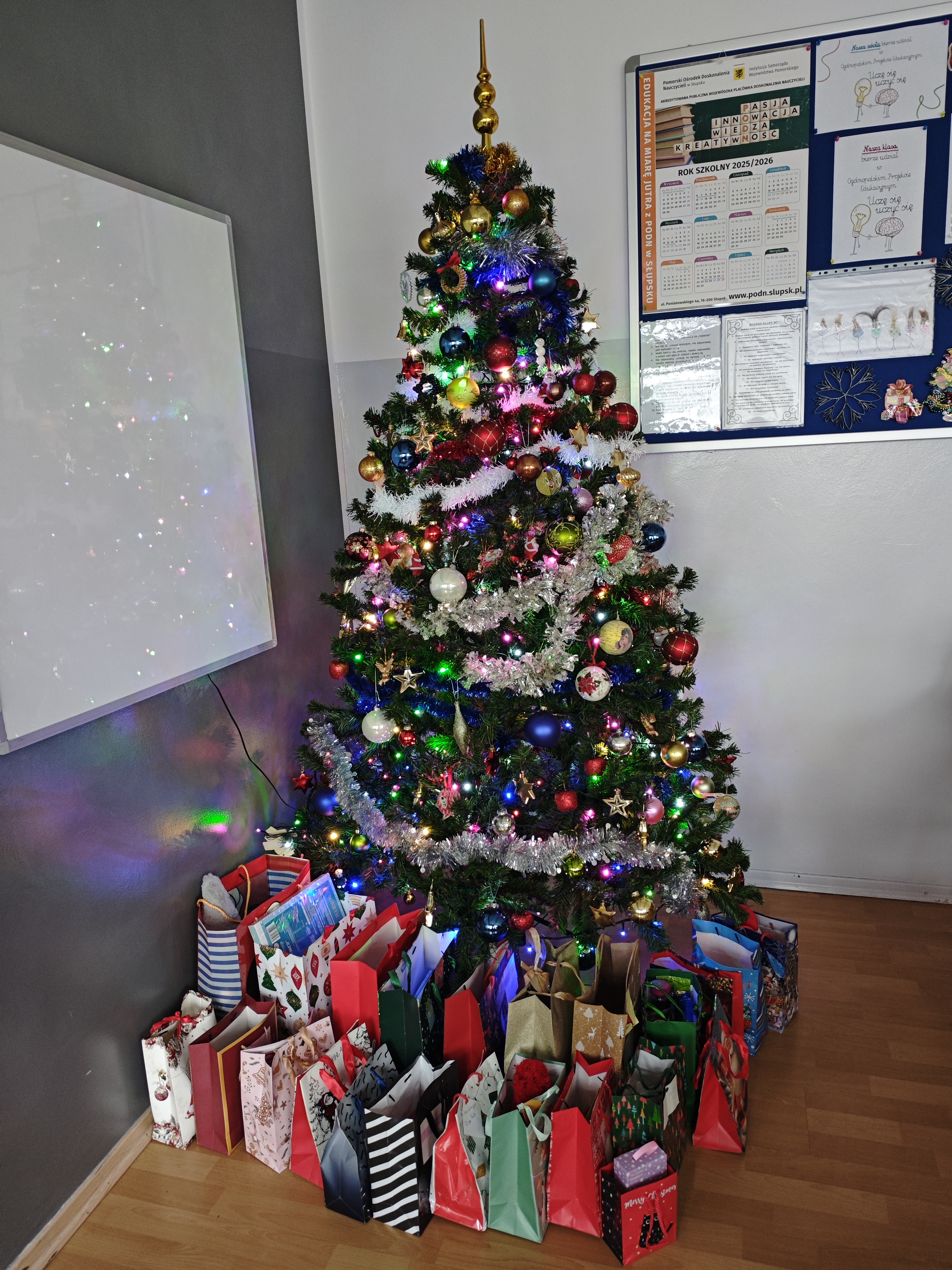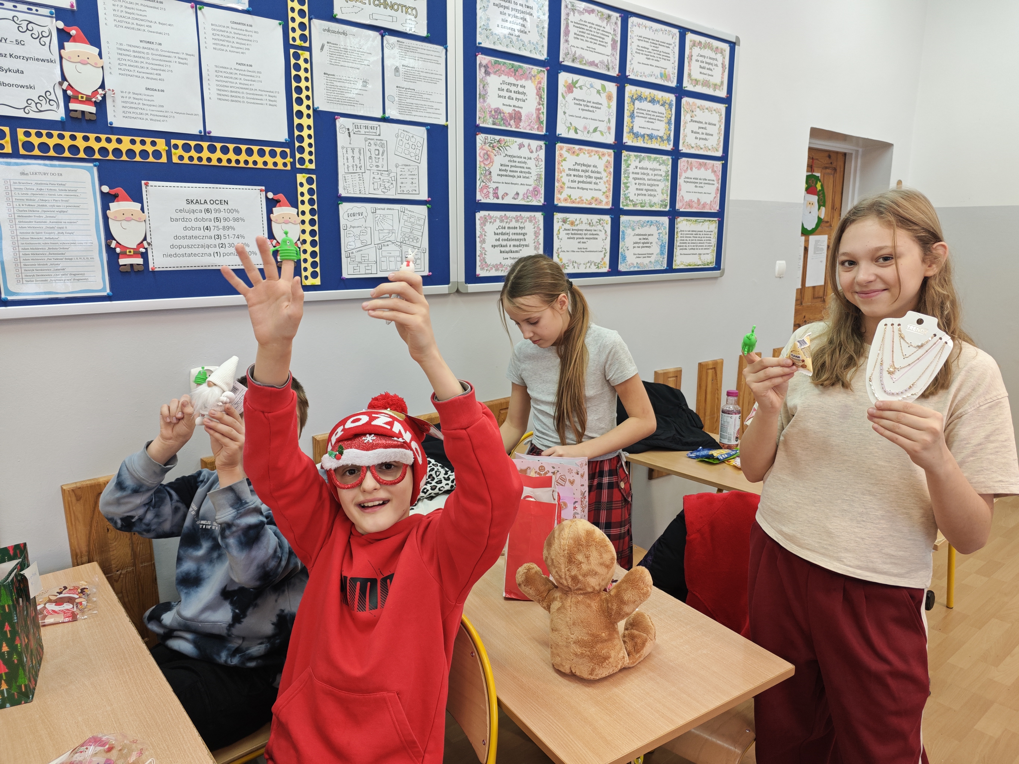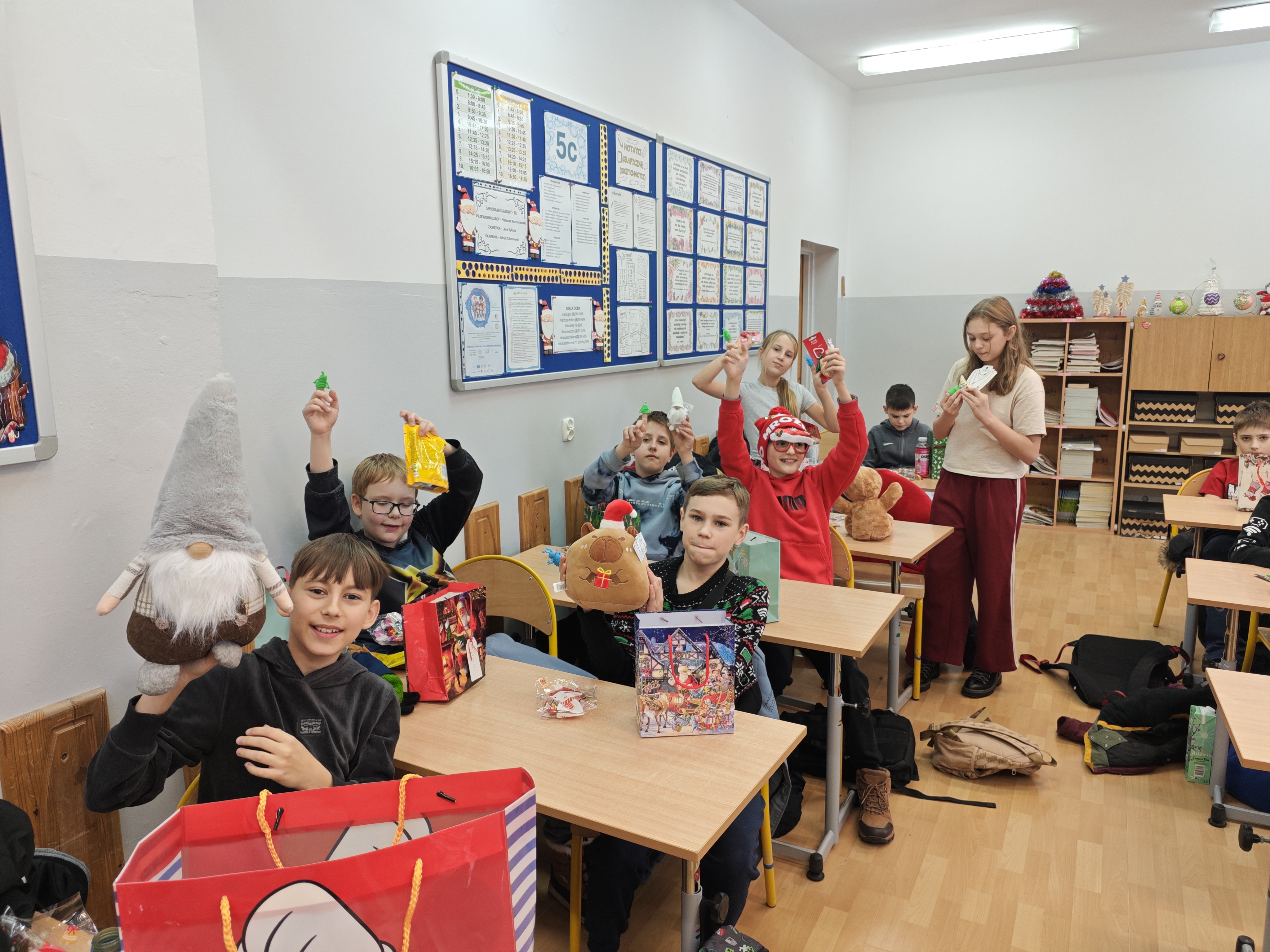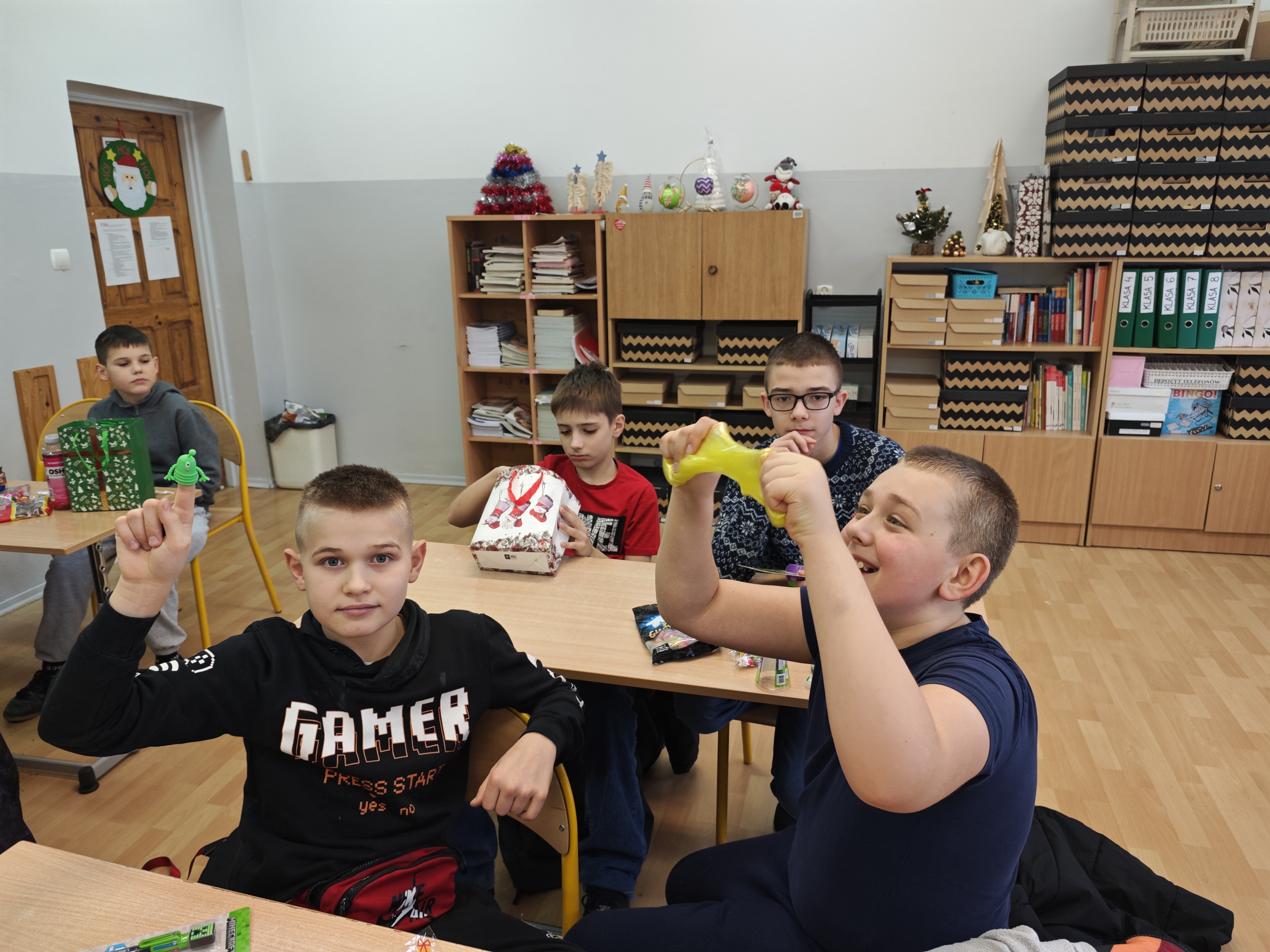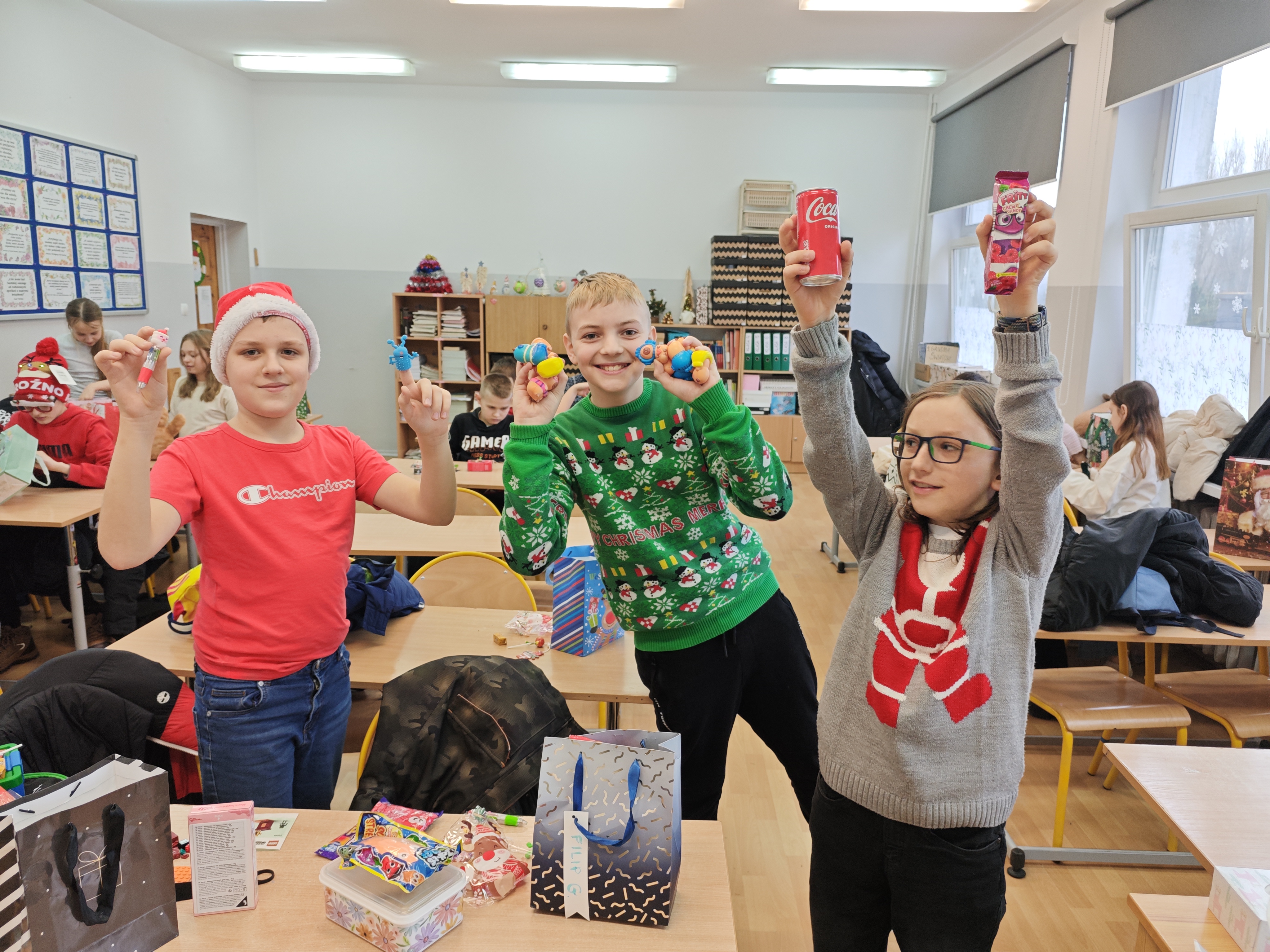 Po seansie filmowym wrócili do szkoły, a następnie - podczas zajęć godziny wychowawczej - nastąpiło wręczenie mikołajkowych prezentów (które wcześniej przygotowali uczniowie w drodze losowania). Okazało się, że pod choinką czekała na nich jeszcze jedna tajemnicza paczka. Niektórzy z przymrużeniem oka stwierdzili, że chyba Mikołaj się pomylił, przynosząc im dodatkowe prezenty :)