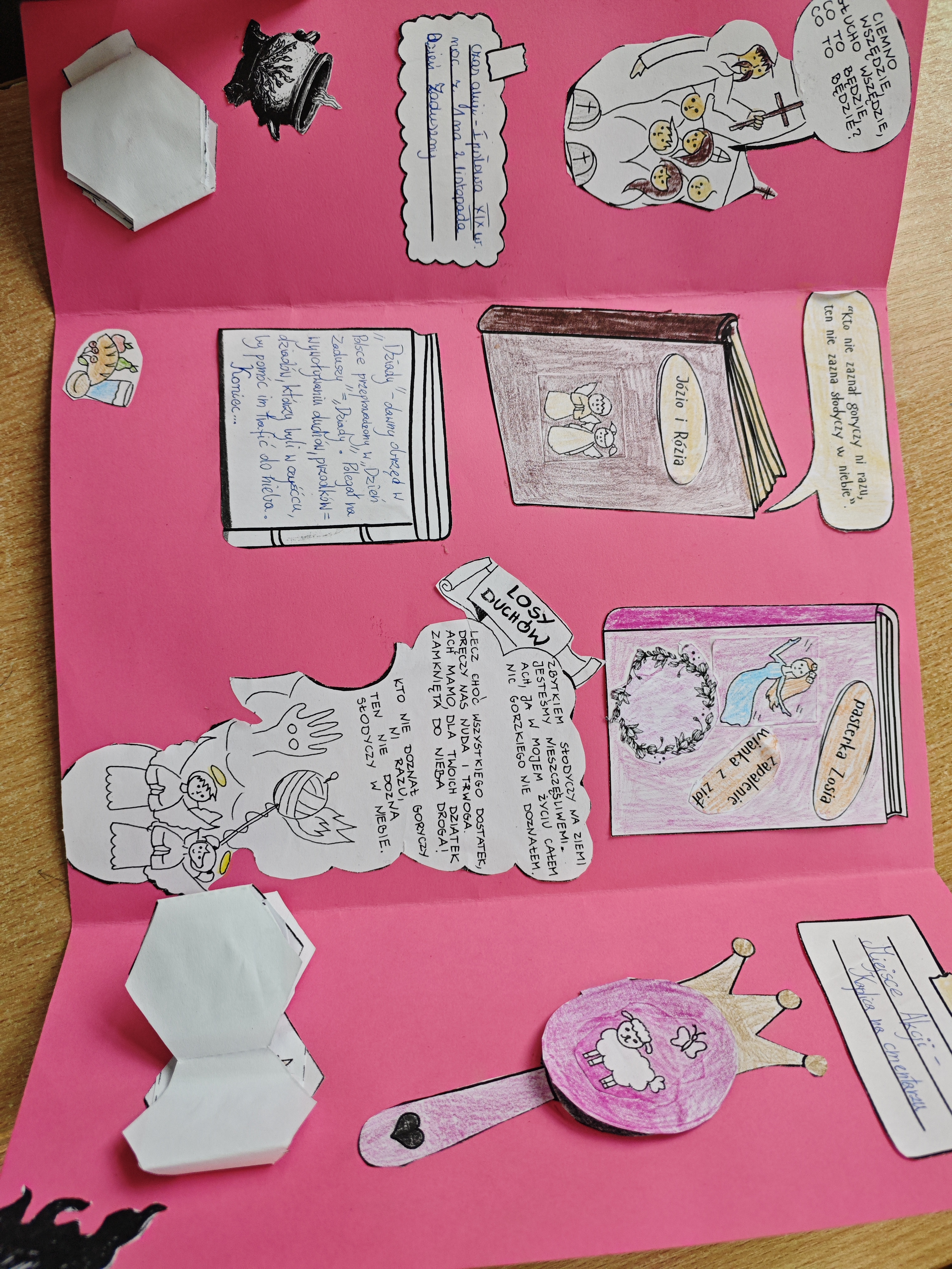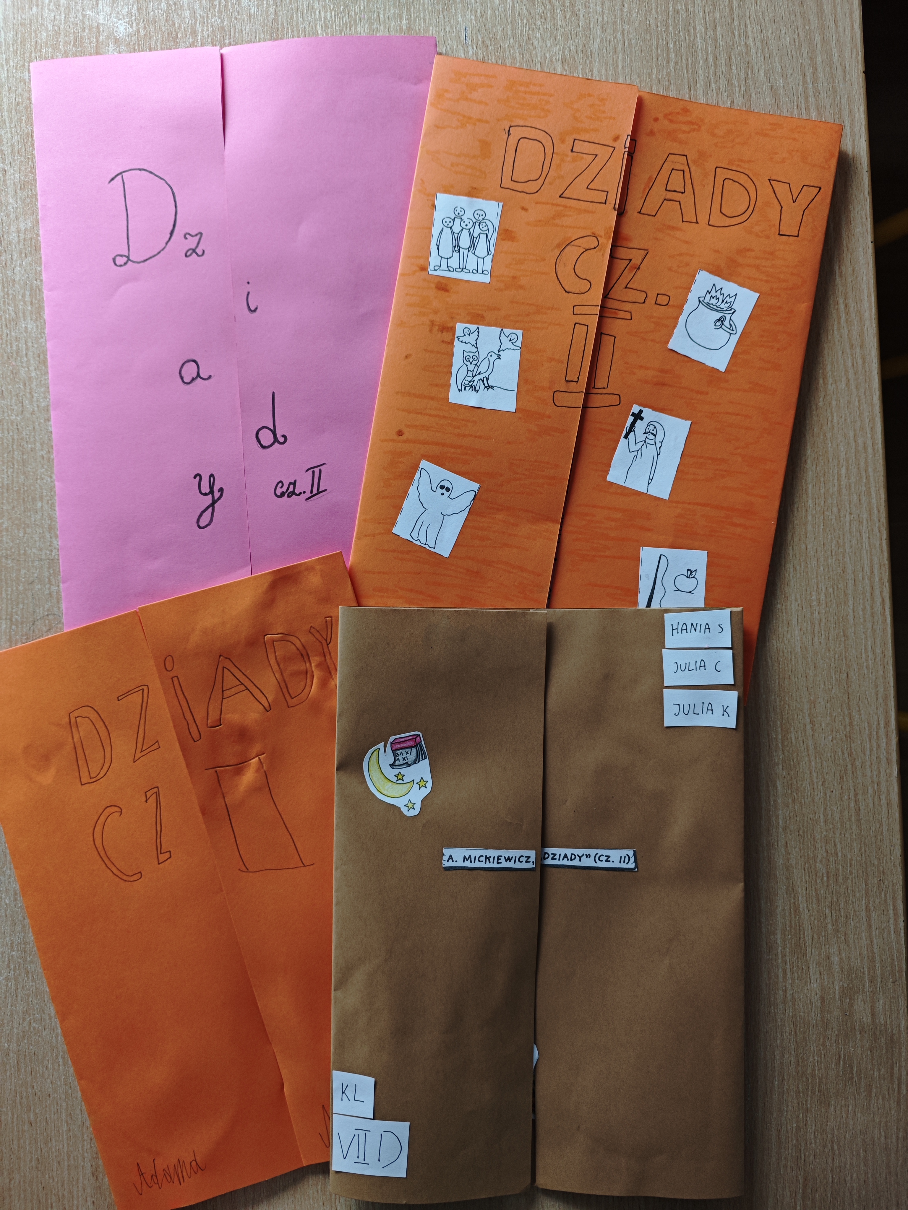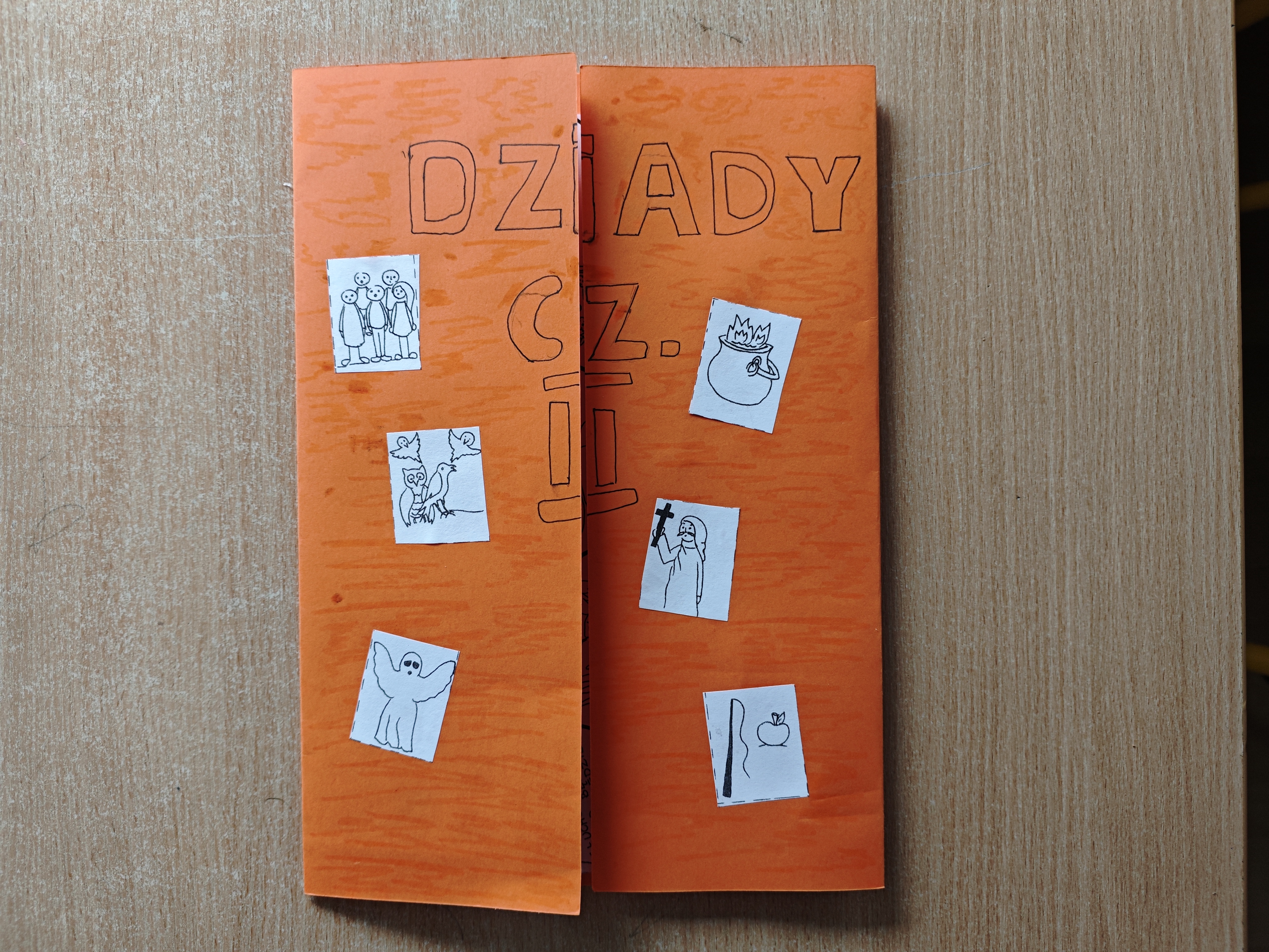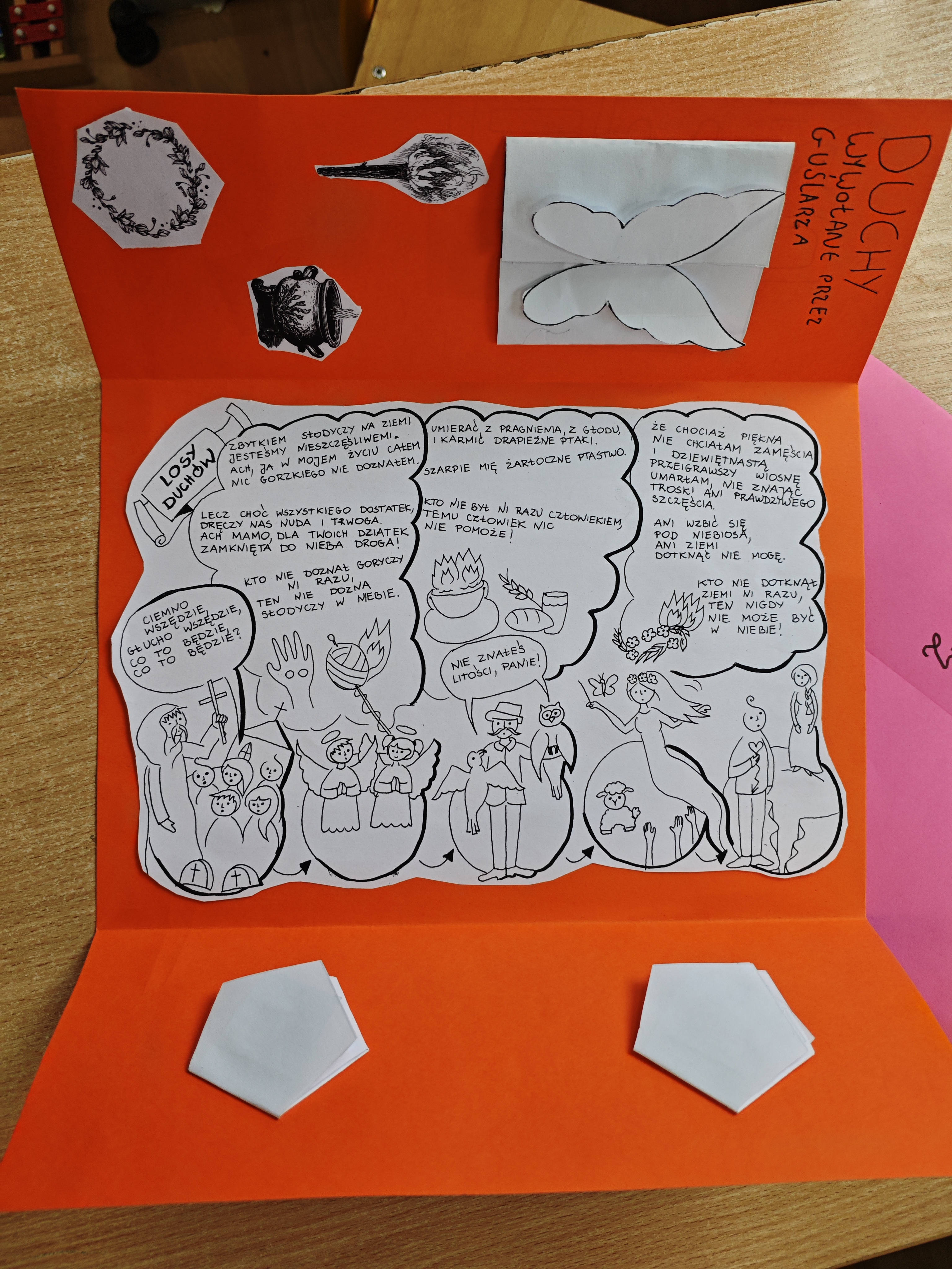 Uczniowie klasy 7d w ramach udziału w Ogólnopolskim Projekcie Edukacyjnym „Uczę się uczyć” na lekcji języka polskiego stworzyli lapbooki na temat lektury „Dziady” cz. II.