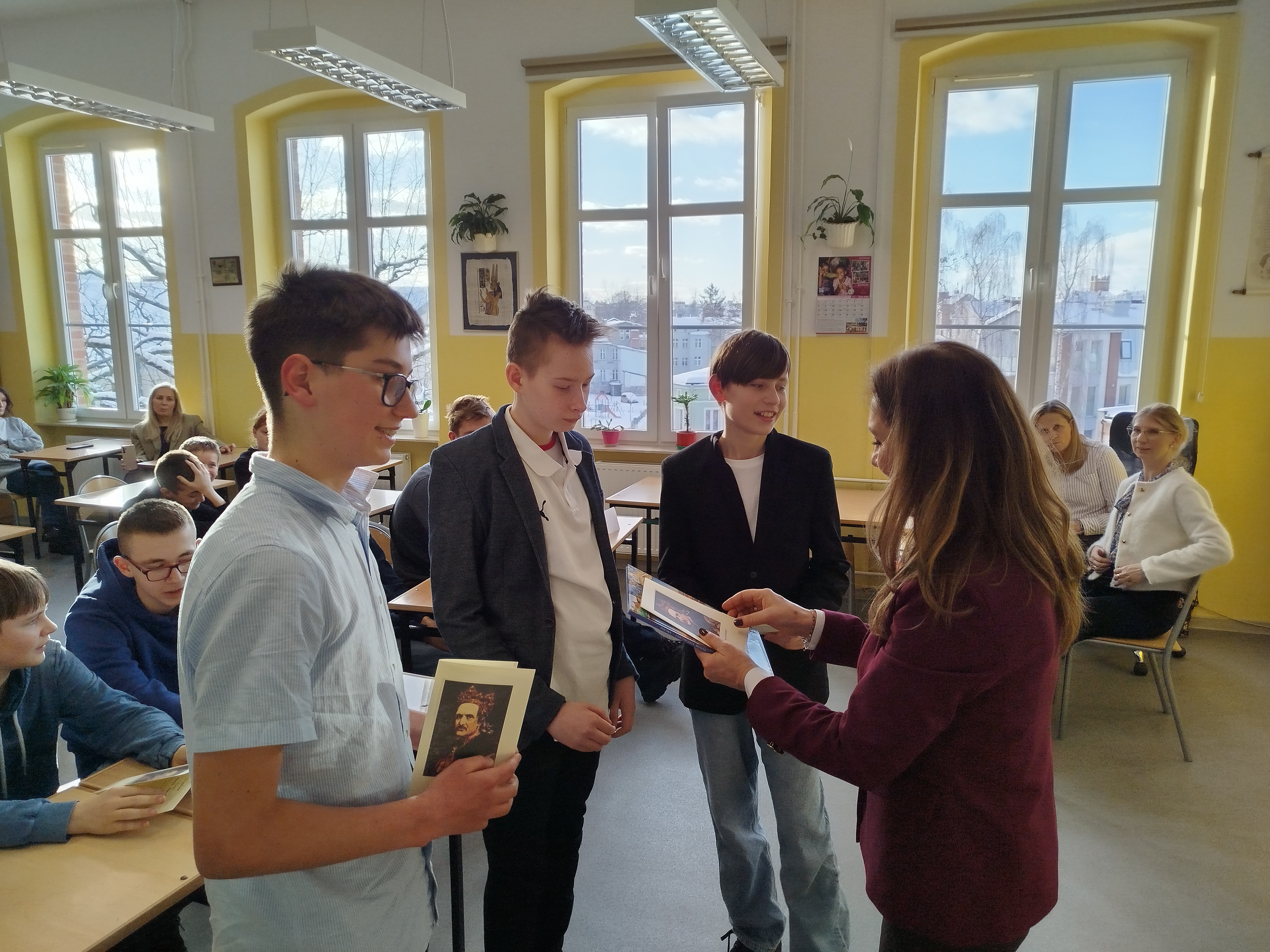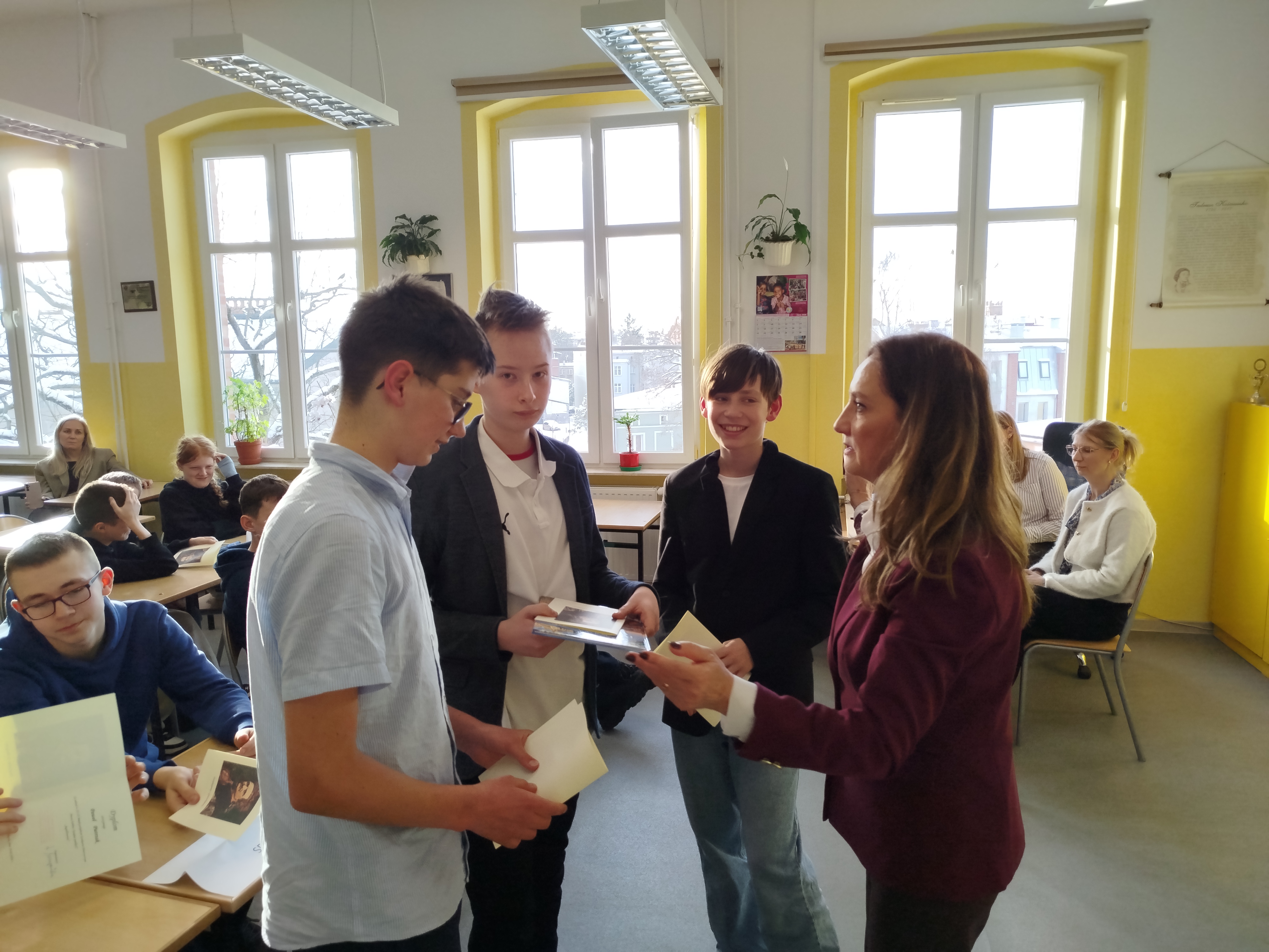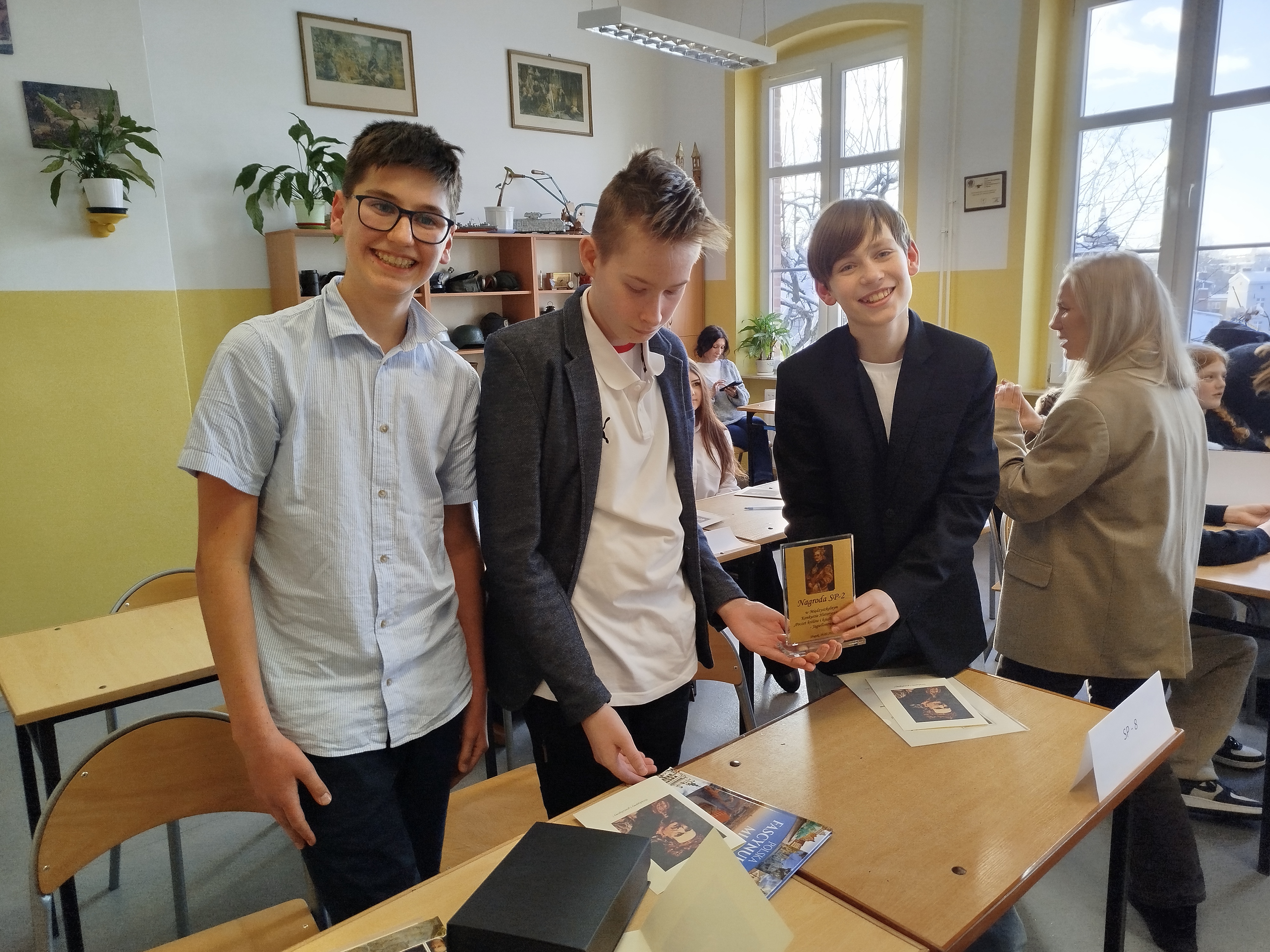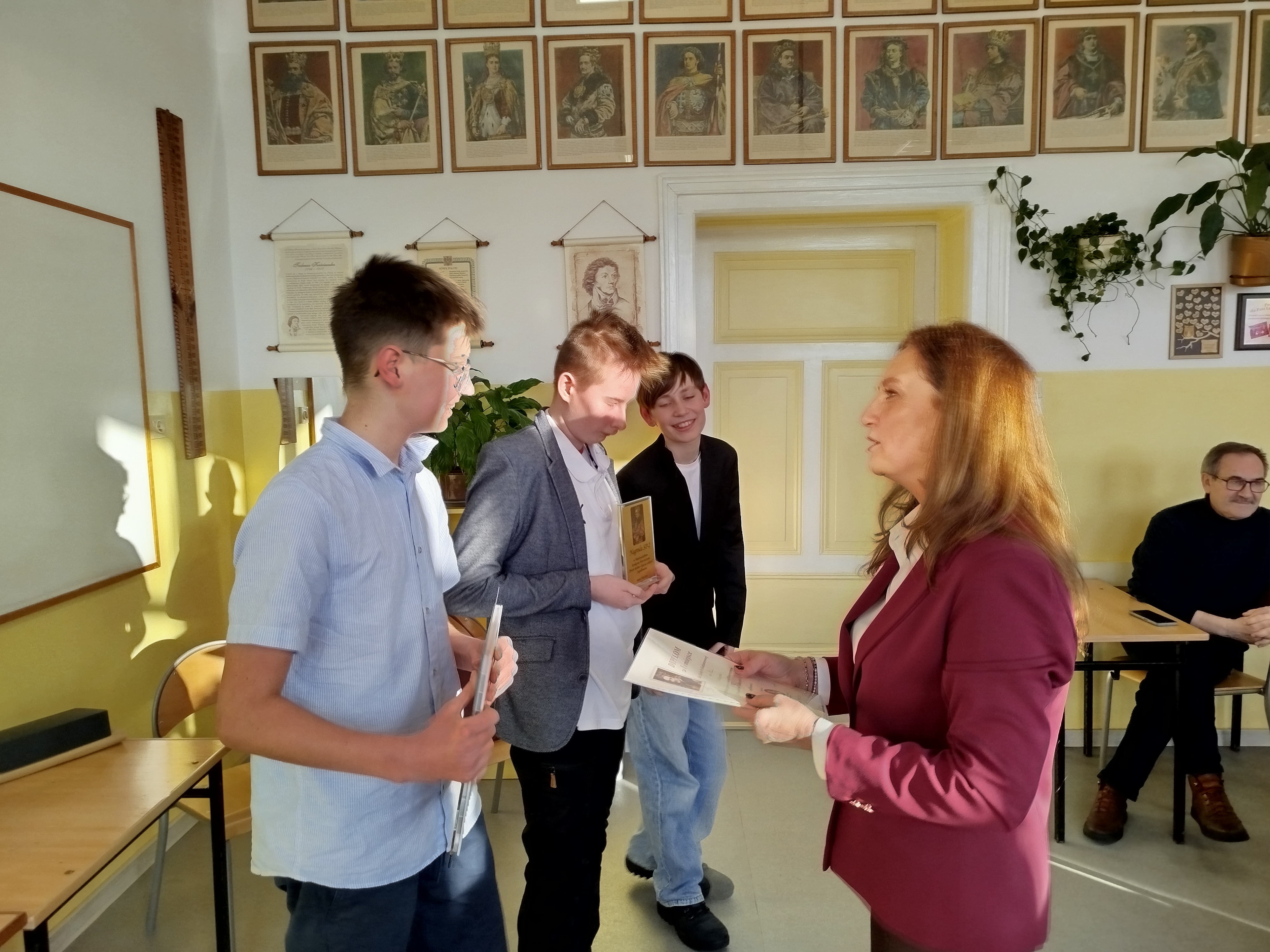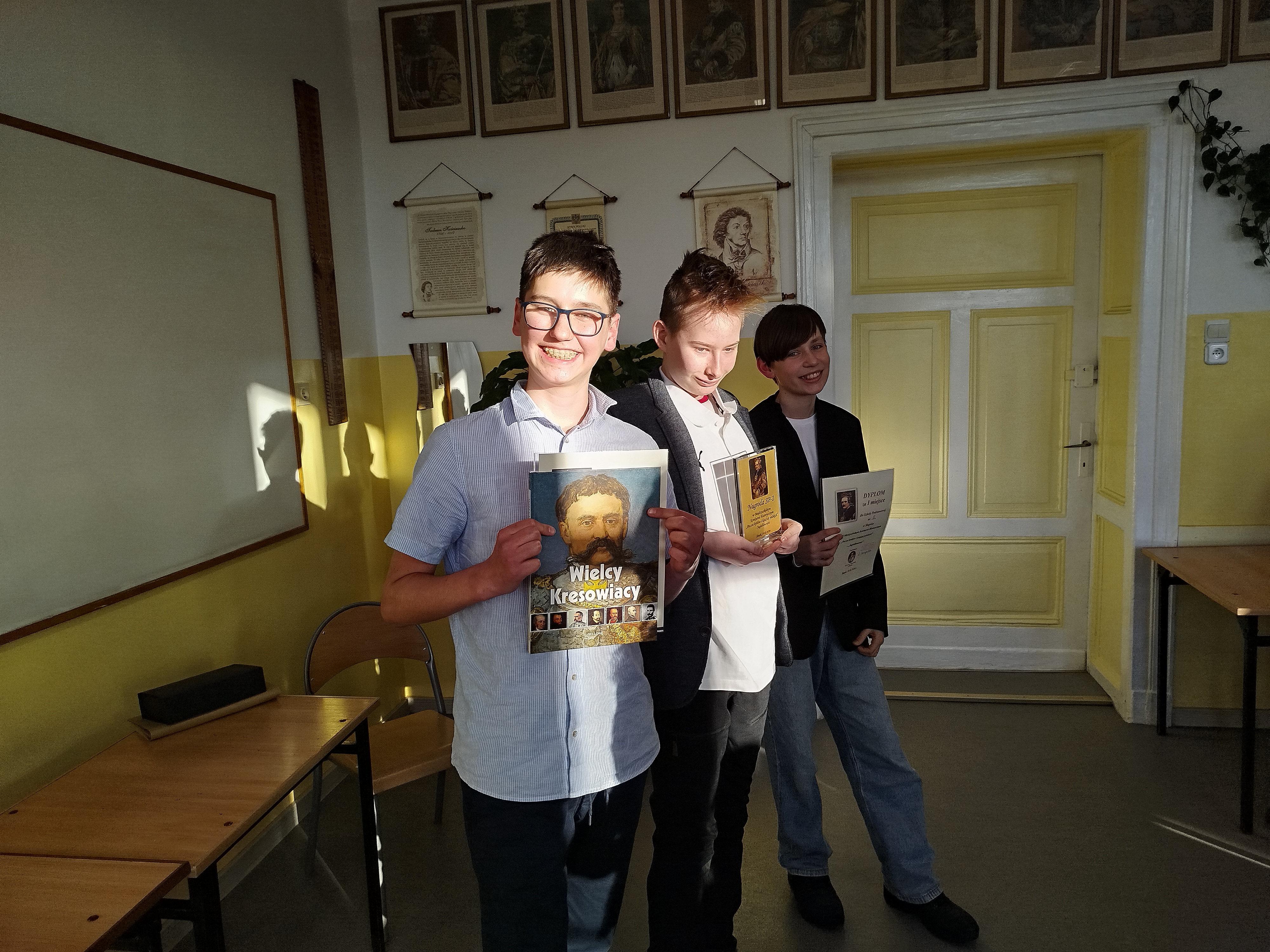 W tym roku uczniowie słupskich szkół podstawowych sprawdzili swoją wiedzę o Jagiellonach. W pierwszym etapie konkursu uczniowie pisali indywidualny test wiadomości, a następnie wzięli udział w quizie, gdzie odpowiadali zespołowo. Trzyosobowa reprezentacja naszej szkoły w składzie: Jan Porzych (kl. 7c), Aleksander Draus (kl. 6c) i Dominik Radziwiłłowicz (kl. 6a) zdobyła najwięcej punktów i zajęła pierwsze miejsce. Jan Porzych osiągnął też sukces indywidualny, zdobywając największą liczbę punktów z części pisemnej i uzyskując tytuł „Mistrza Wiedzy Historycznej”. Wielkie gratulacje!