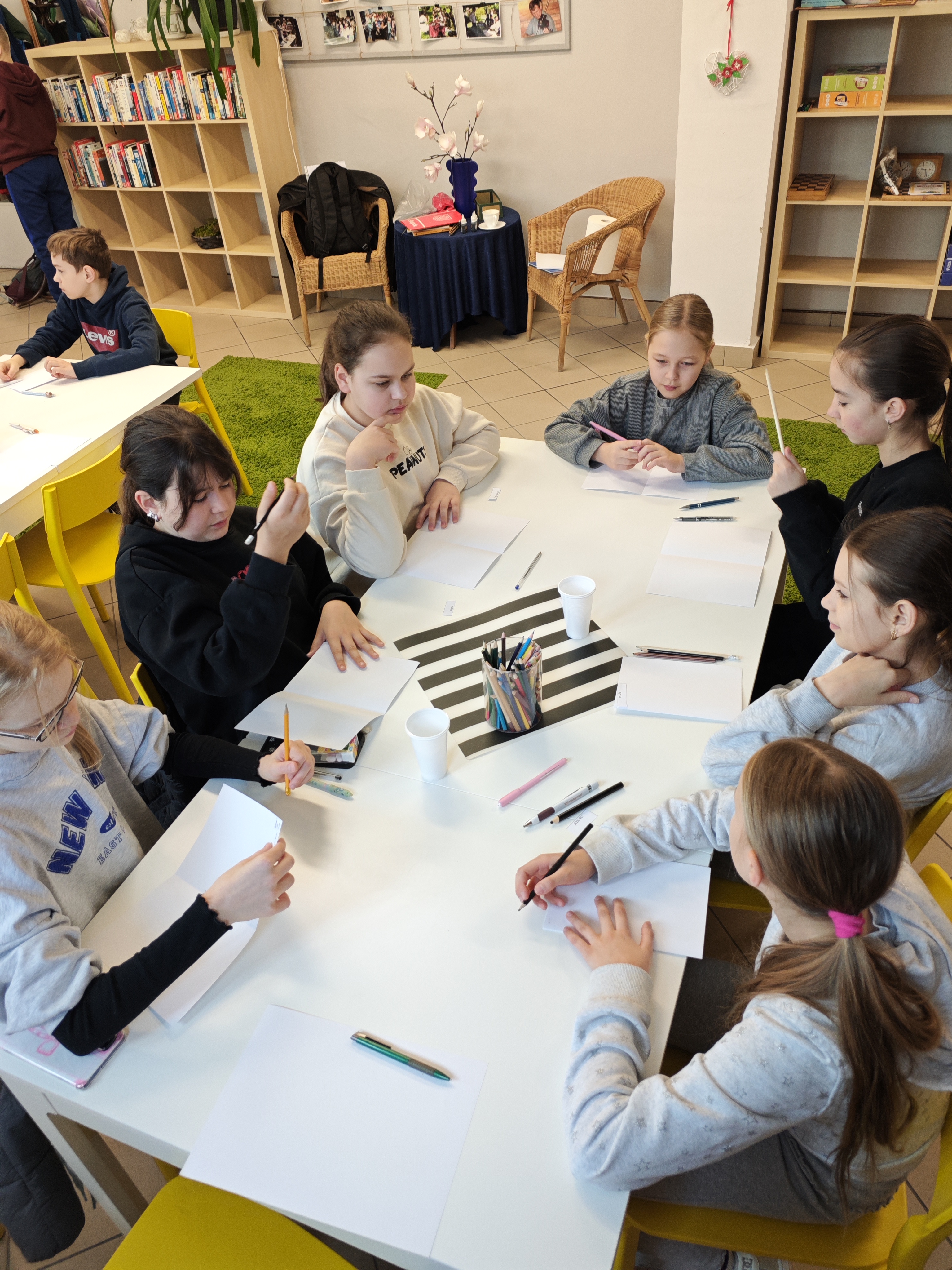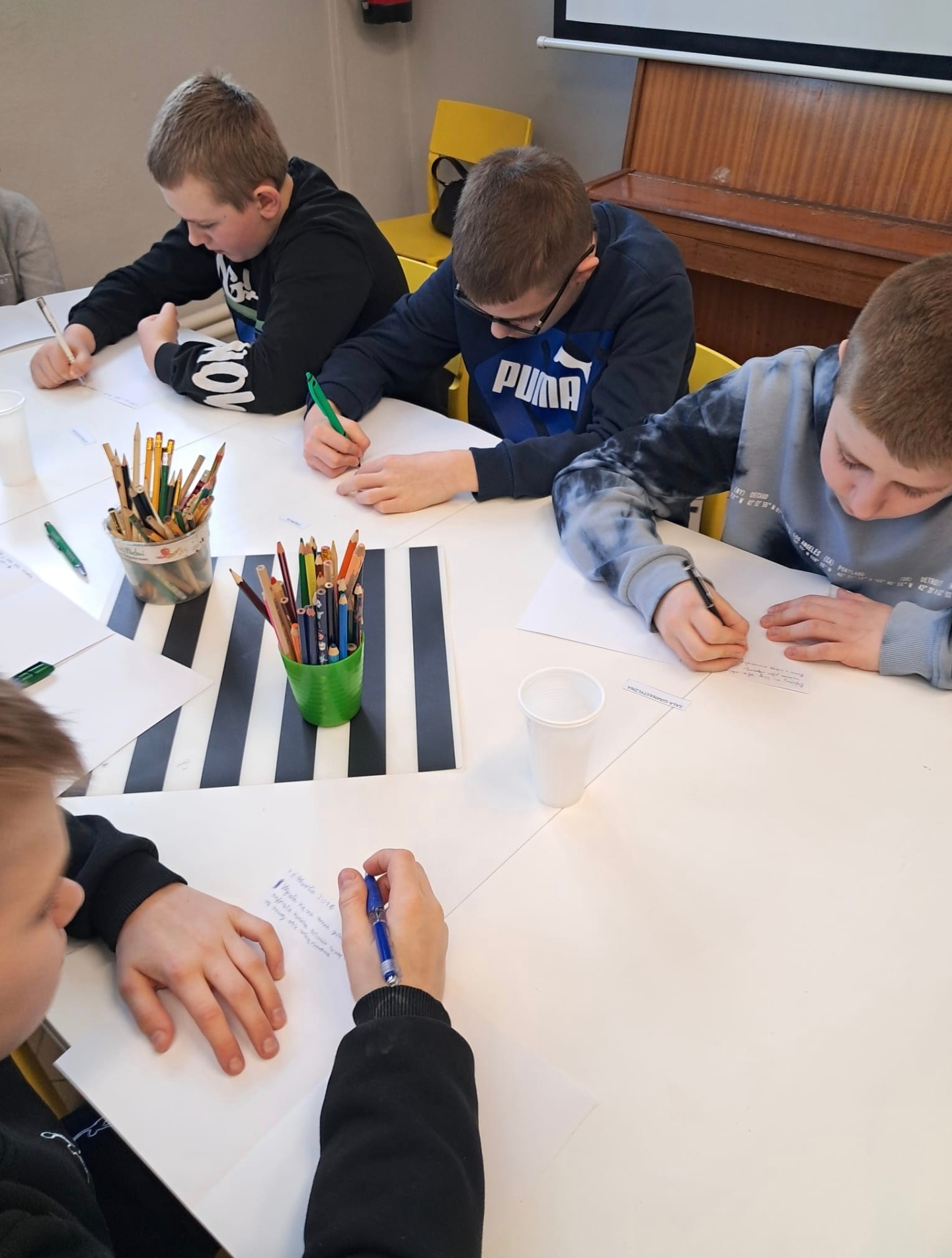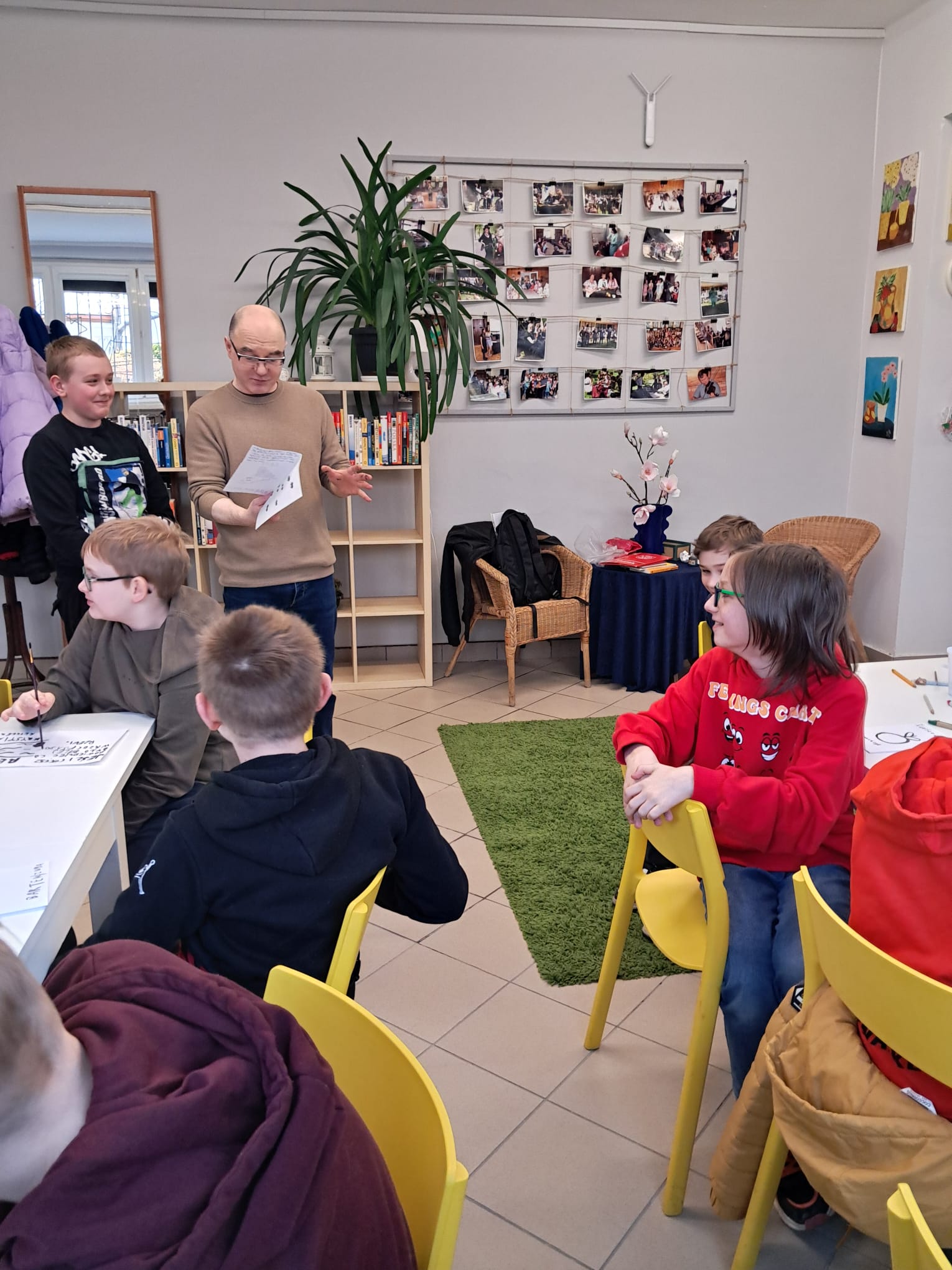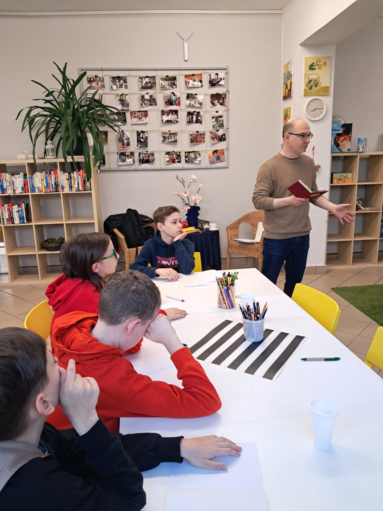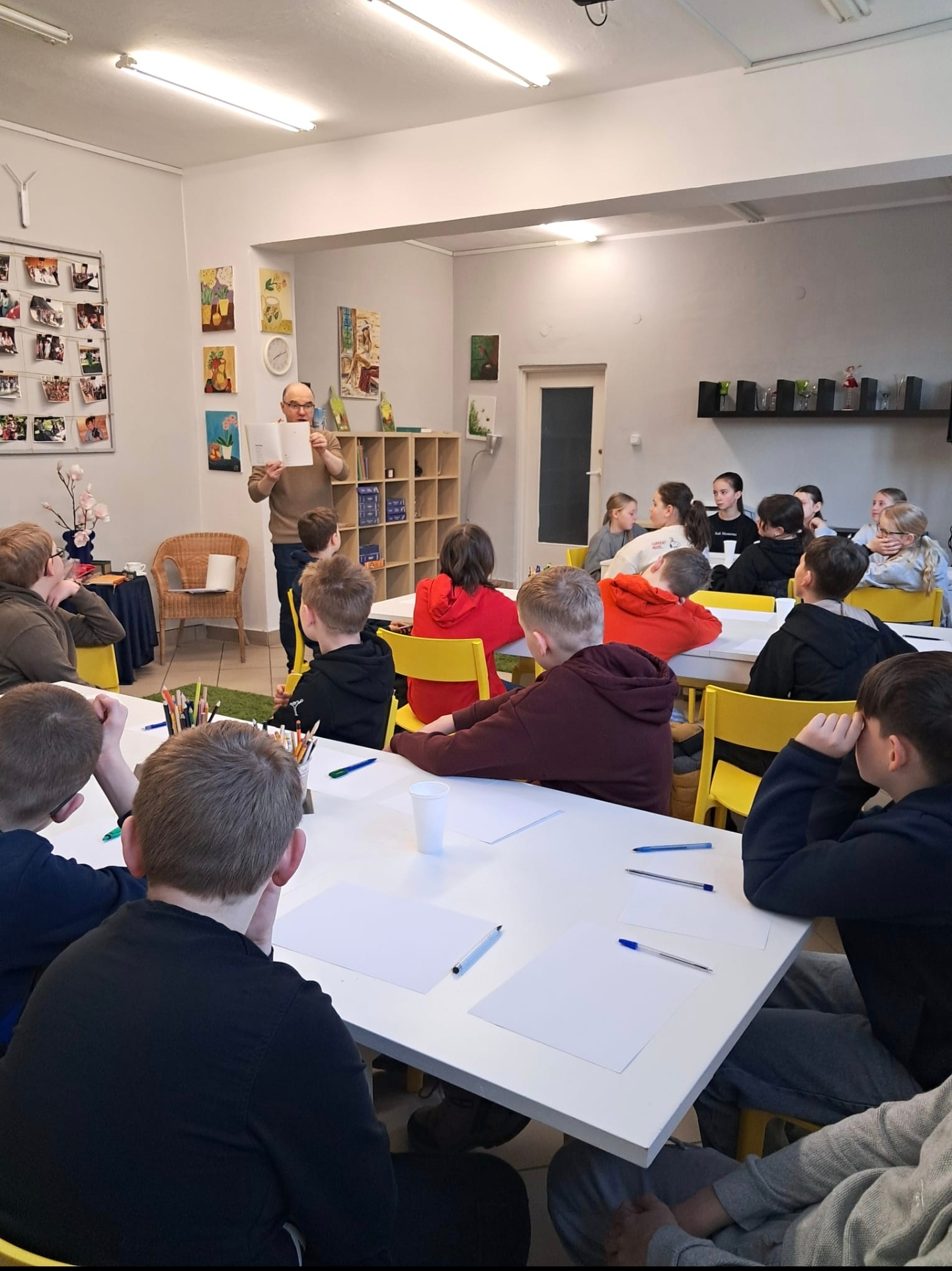 23.03.2026 uczniowie klasy 4c i 5c wzięli udział w warsztatach pisarskich w Filii nr 8 Miejskiej Biblioteki Publicznej realizowanych w ramach projektu "Kawiarenka literacka miejscem spotkań". Warsztaty poprowadził pan Daniel Odija - wybitny pisarz, dziennikarz, publicysta i animator kultury pochodzący ze Słupska.
