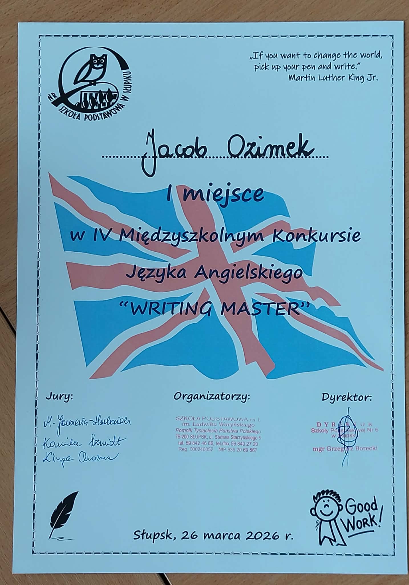 Z ogromną dumą i radością informujemy, że uczeń naszej szkoły, Jacob Ozimek, zajął I MIEJSCE w IV Międzyszkolnym Konkursie „WRITING MASTER”!