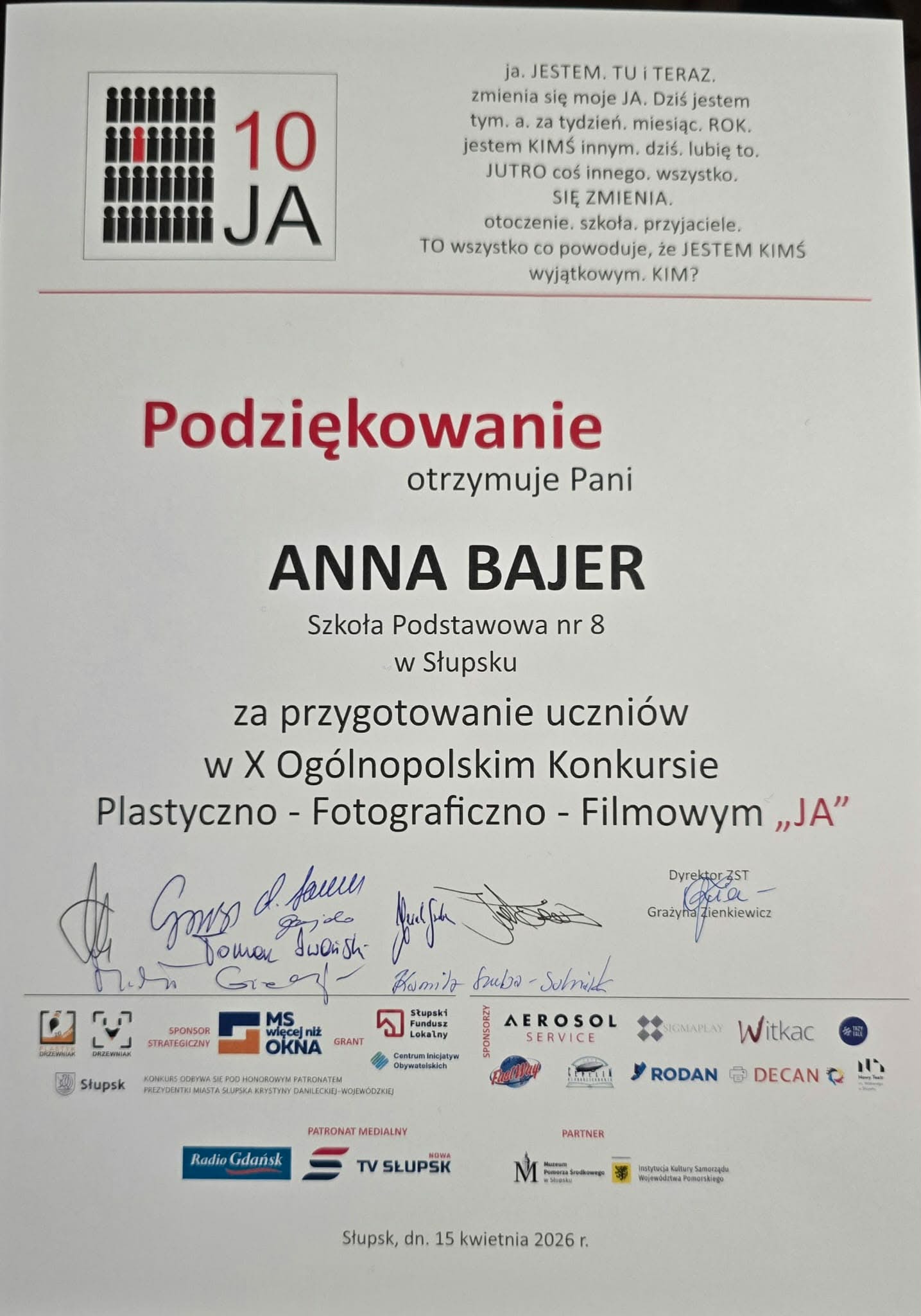 W środę 15 kwietnia w Czerwonym Spichlerzu w Słupsku odbyło się uroczyste rozdanie nagród w 10. jubileuszowej edycji ogólnopolskiego konkursu plastyczno-fotograficzno-filmowego „Ja”