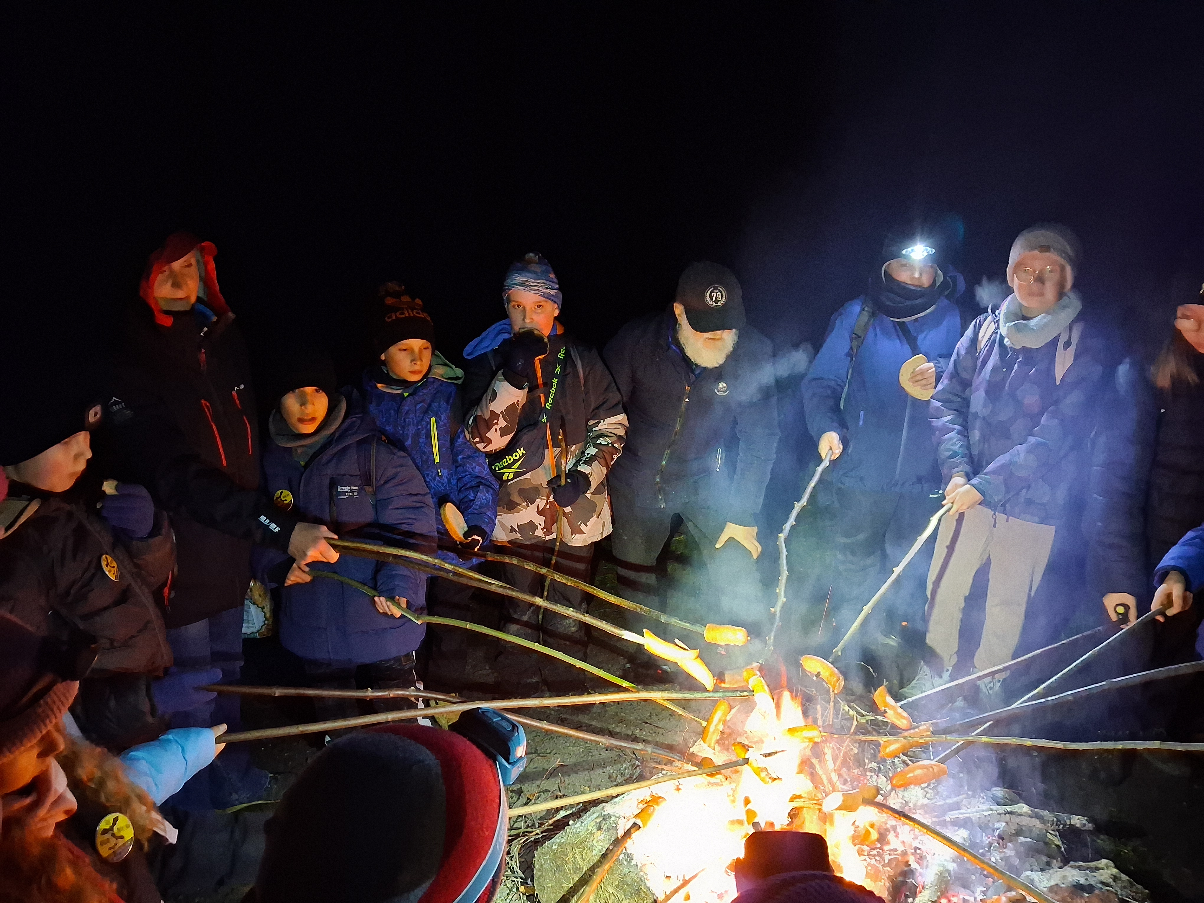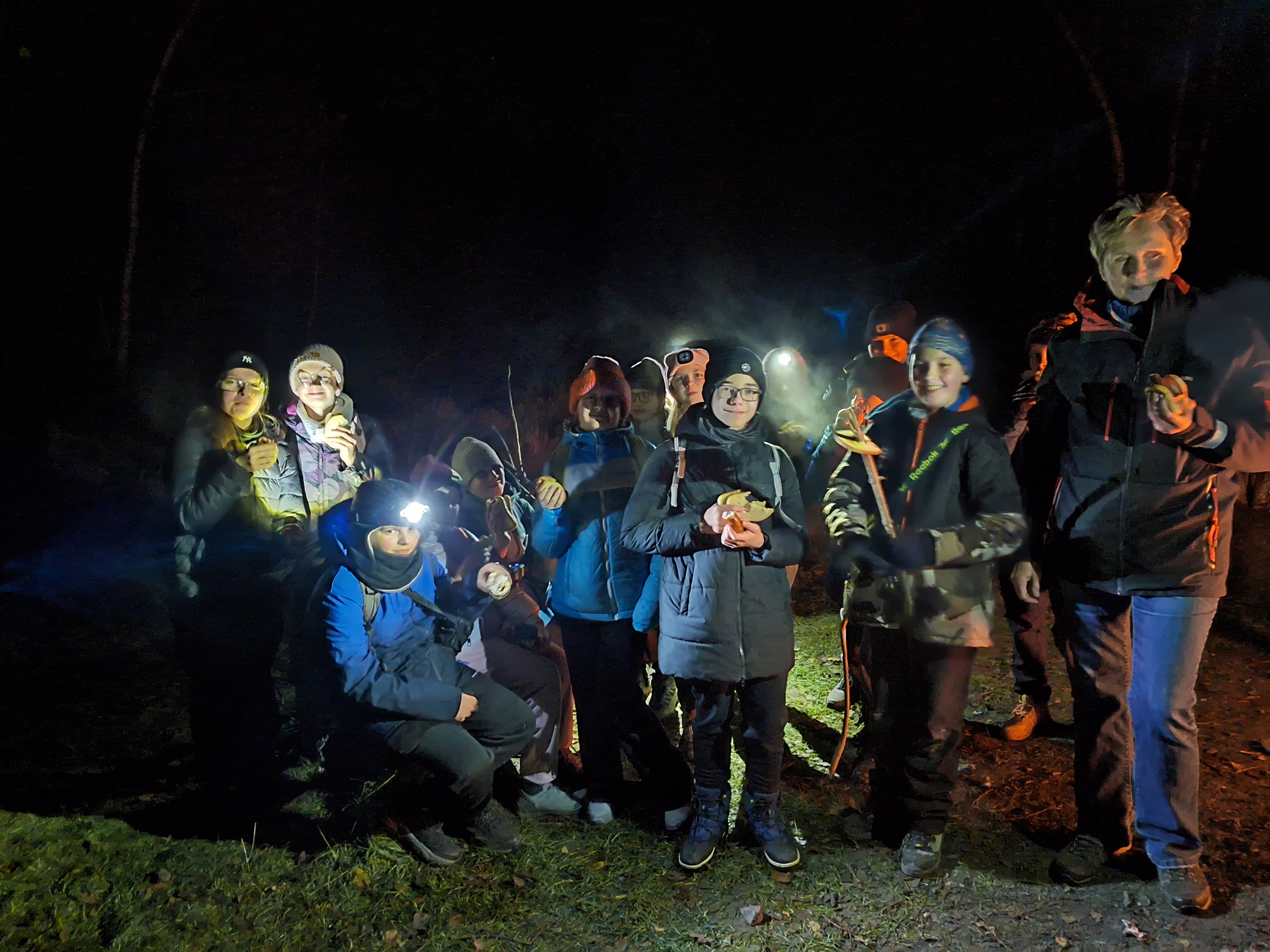 Podczas imprezy naszą grupę podzielono na cztery ekipy. Kapitanowie co chwilę sprawdzali czy ich zespoły są kompletne i nikt nie zaginął w ciemnościach. Co pewien czas wszyscy gasili latarki i opiekun robił zdjęcia. A że przy okazji dostawał jednak światłem latarki po oczach, to i powtórek fotek było kilka. Po drodze pokonaliśmy lasy oraz tereny błotne, w których artyści akrobaci kilka razy zaliczyli słynną „glebę”. Część z naszych uczestników mogła się pochwalić też znajomością terenu po poprzednich rajdach i w nocy potrafiła odnaleźć wywołane przez prowadzącego cisy czy tory. Kilka razy robiliśmy przerwę, delektować się kanapkami i herbatką z termosu, które w tych warunkach okazały się wyjątkowo smaczne. Na koniec imprezy dotarliśmy do ogniska, na którym mogliśmy upiec kiełbaski i chleb. Po ognisku dotarliśmy do parkingu przy Stadionie 650-lecia, skąd rodzice odebrali swoje pociechy.
