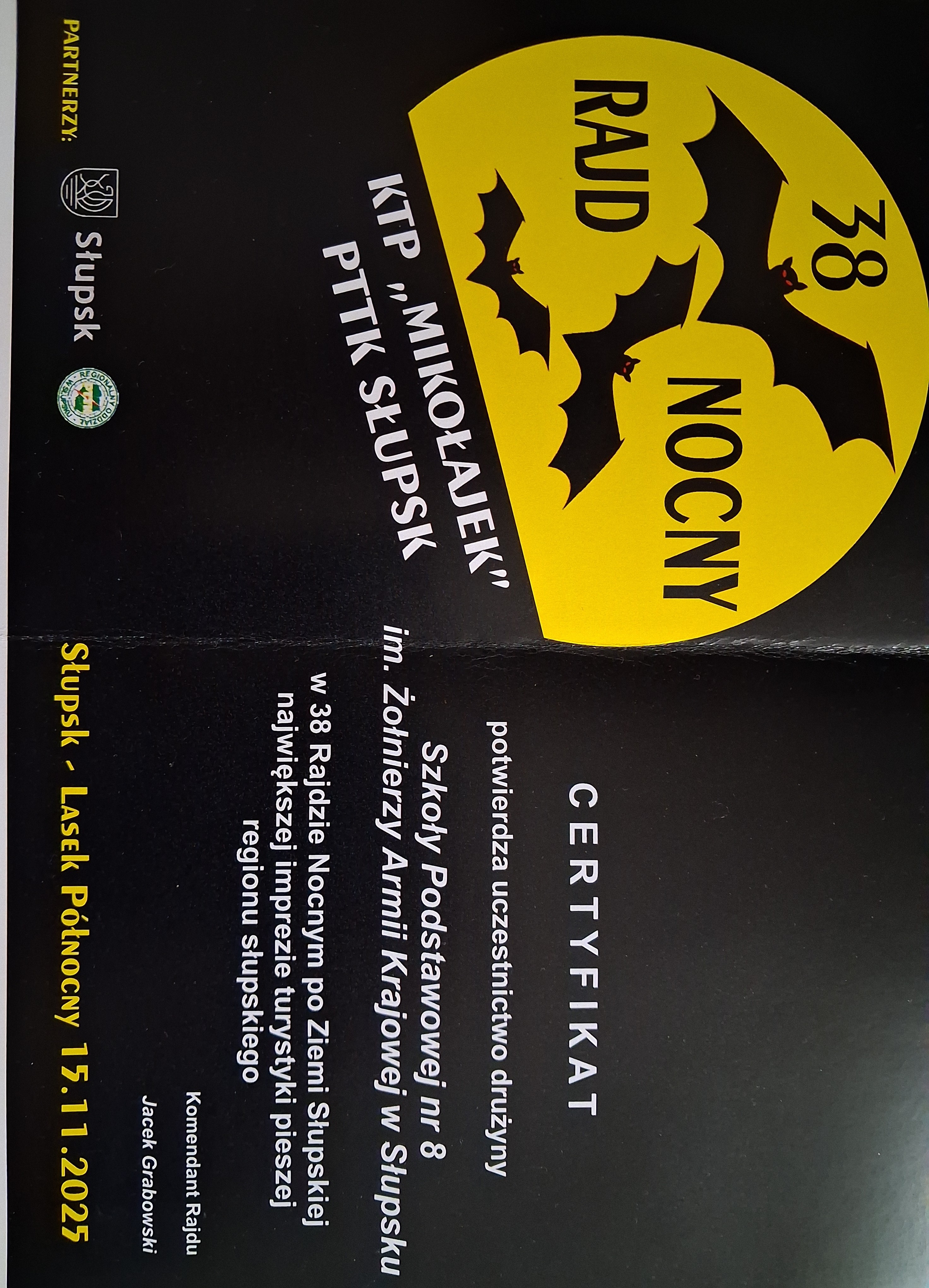 W dniu 15.11.2025 w warunkach nocnych pokonaliśmy trasę Jezierzyce - Słupsk (10 km). Byliśmy grupą prowadzącą imprezę PTTK.