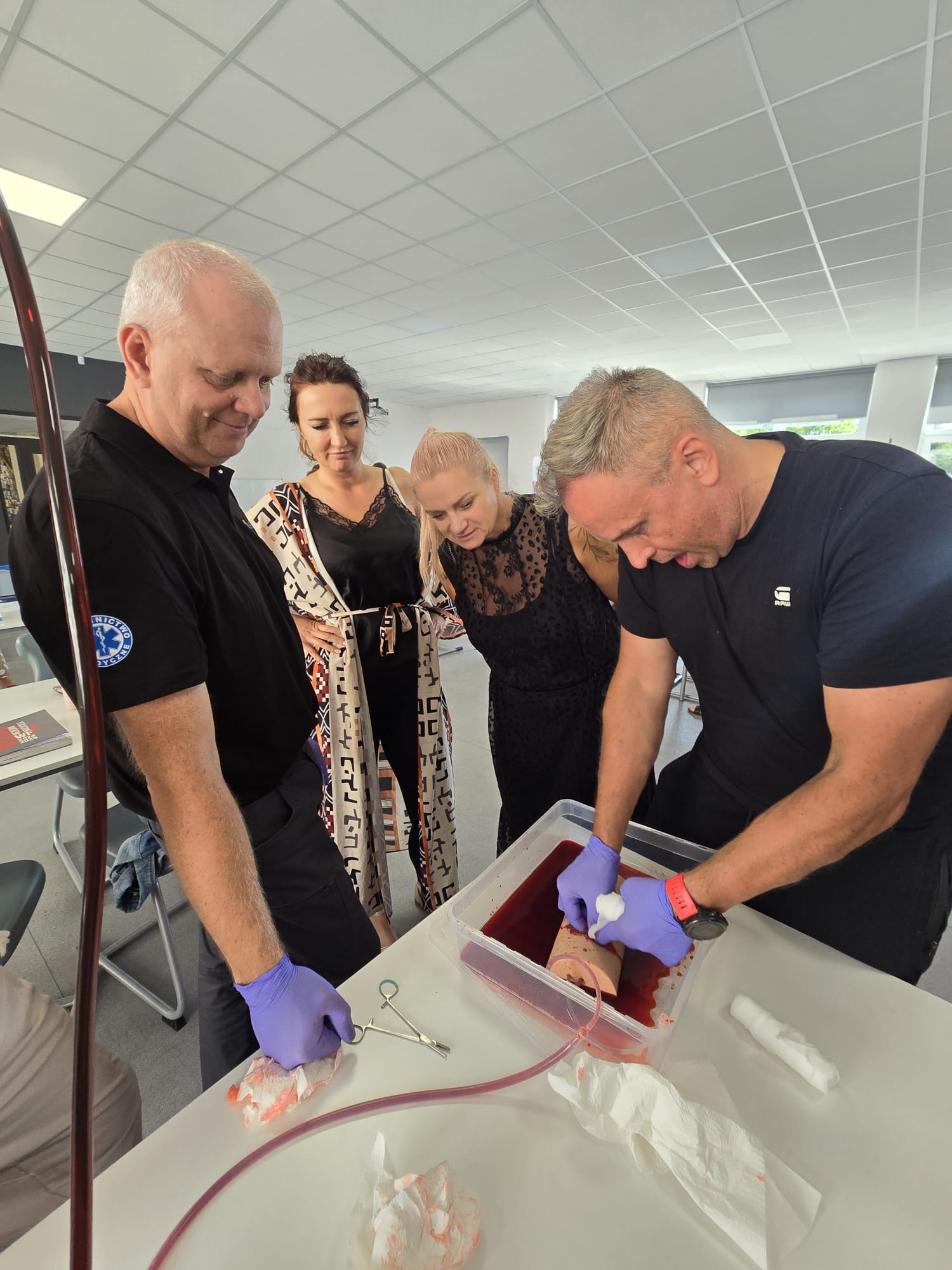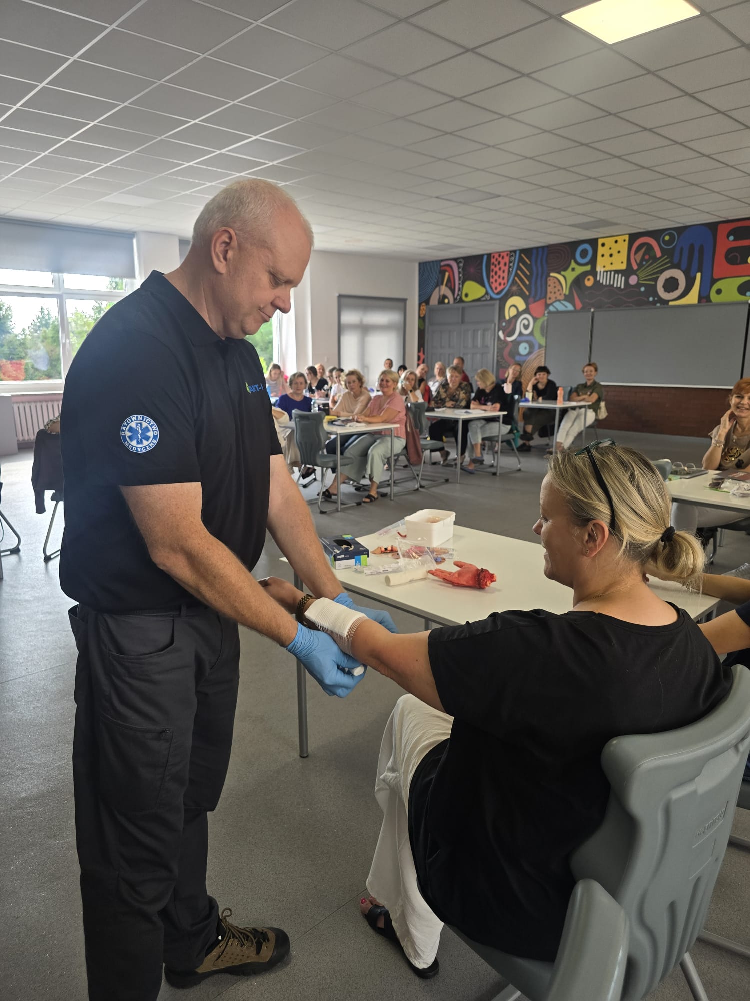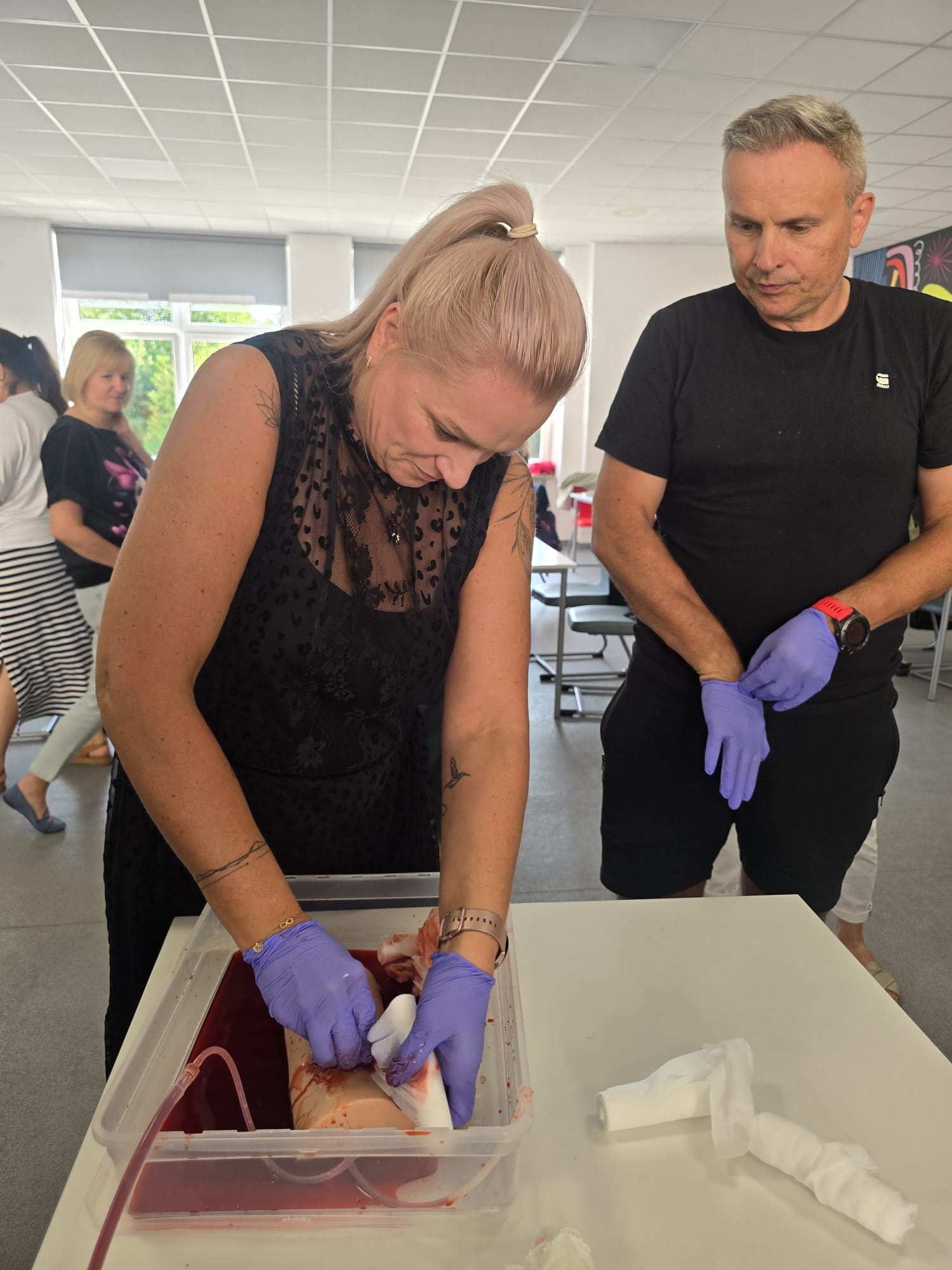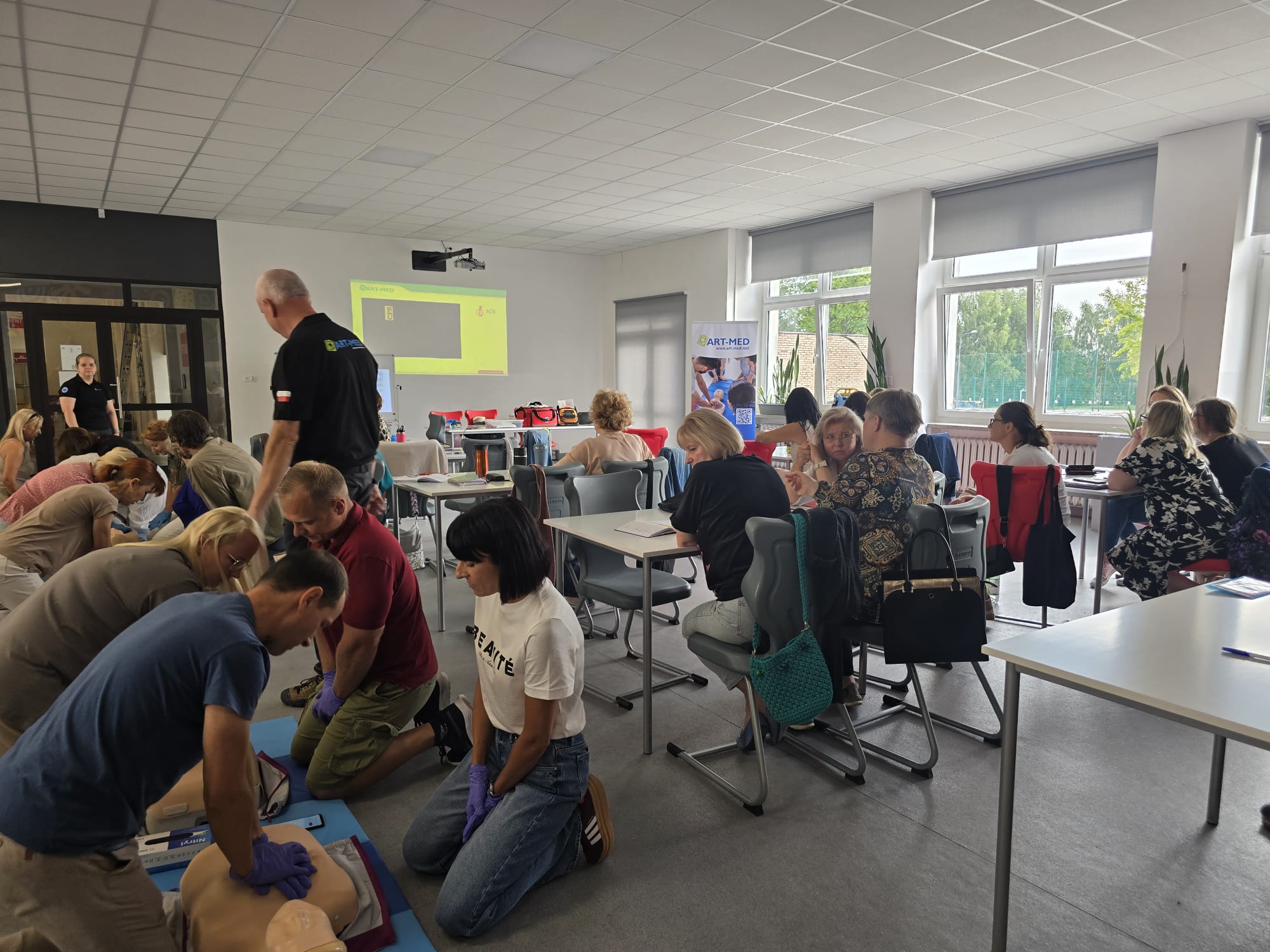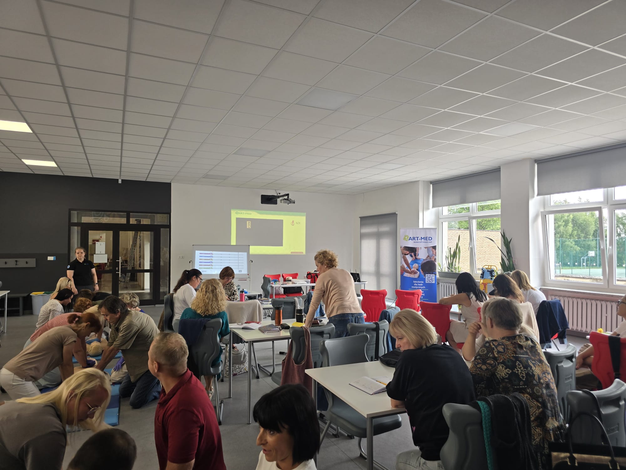 Poruszone zostały zagadnienia m.in. resuscytacji krążeniowo-oddechowej u dorosłych i dzieci, reagowania w razie wstrząsu anafilaktycznego oraz hipoglikemii, opatrywania ran, tamowania krwotoków oraz usztywniania kończyn. Nauczyciele wzięli udział w licznych ćwiczeniach praktycznych, które wyglądały dosyć realistycznie – nie zabrakło otwartych ran i krwotoków. Na szczęście wszyscy „pacjenci” przeżyli :)