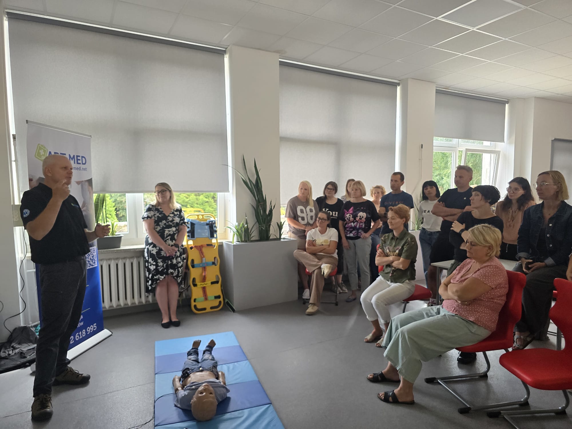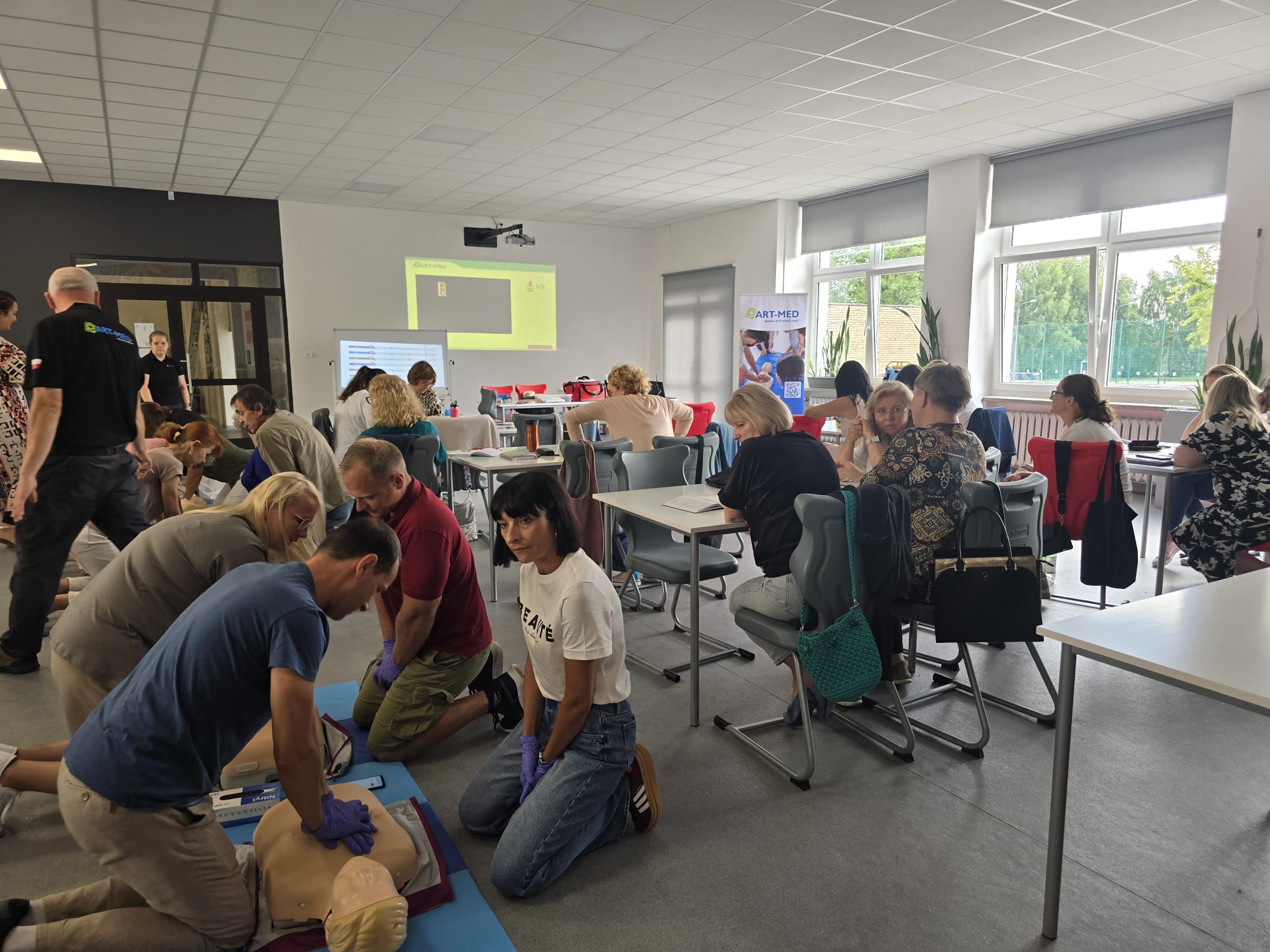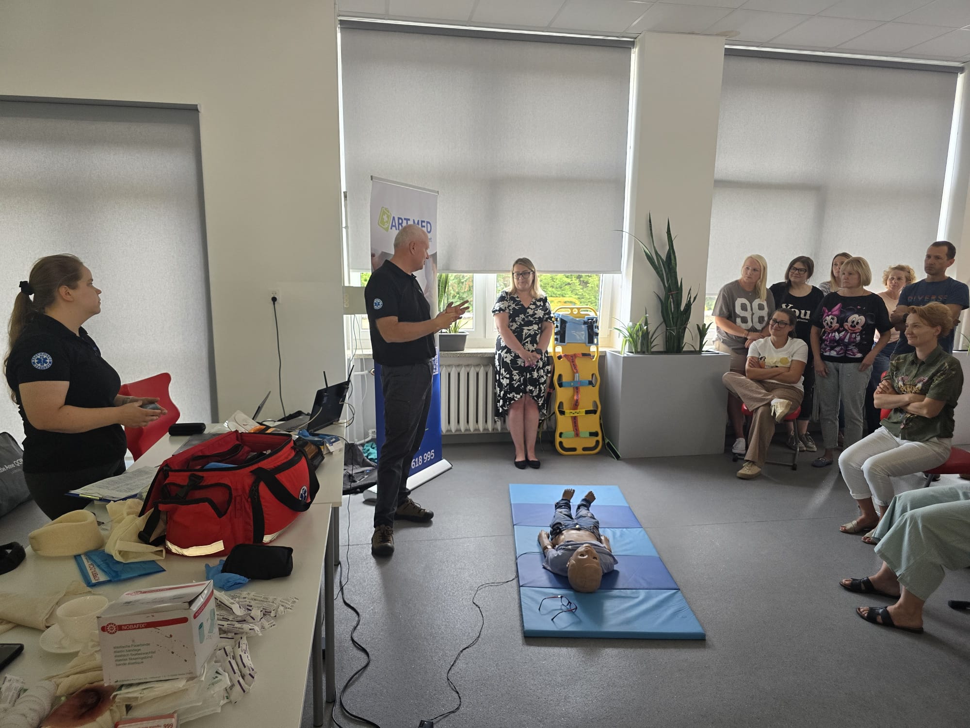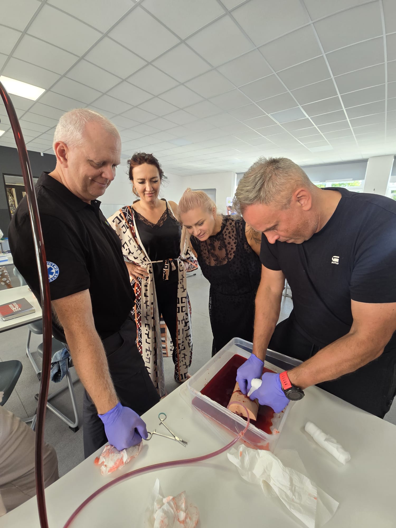 Poruszone zostały zagadnienia m.in. resuscytacji krążeniowo-oddechowej u dorosłych i dzieci, reagowania w razie wstrząsu anafilaktycznego oraz hipoglikemii, opatrywania ran, tamowania krwotoków oraz usztywniania kończyn. Nauczyciele wzięli udział w licznych ćwiczeniach praktycznych, które wyglądały dosyć realistycznie – nie zabrakło otwartych ran i krwotoków. Na szczęście wszyscy „pacjenci” przeżyli :)