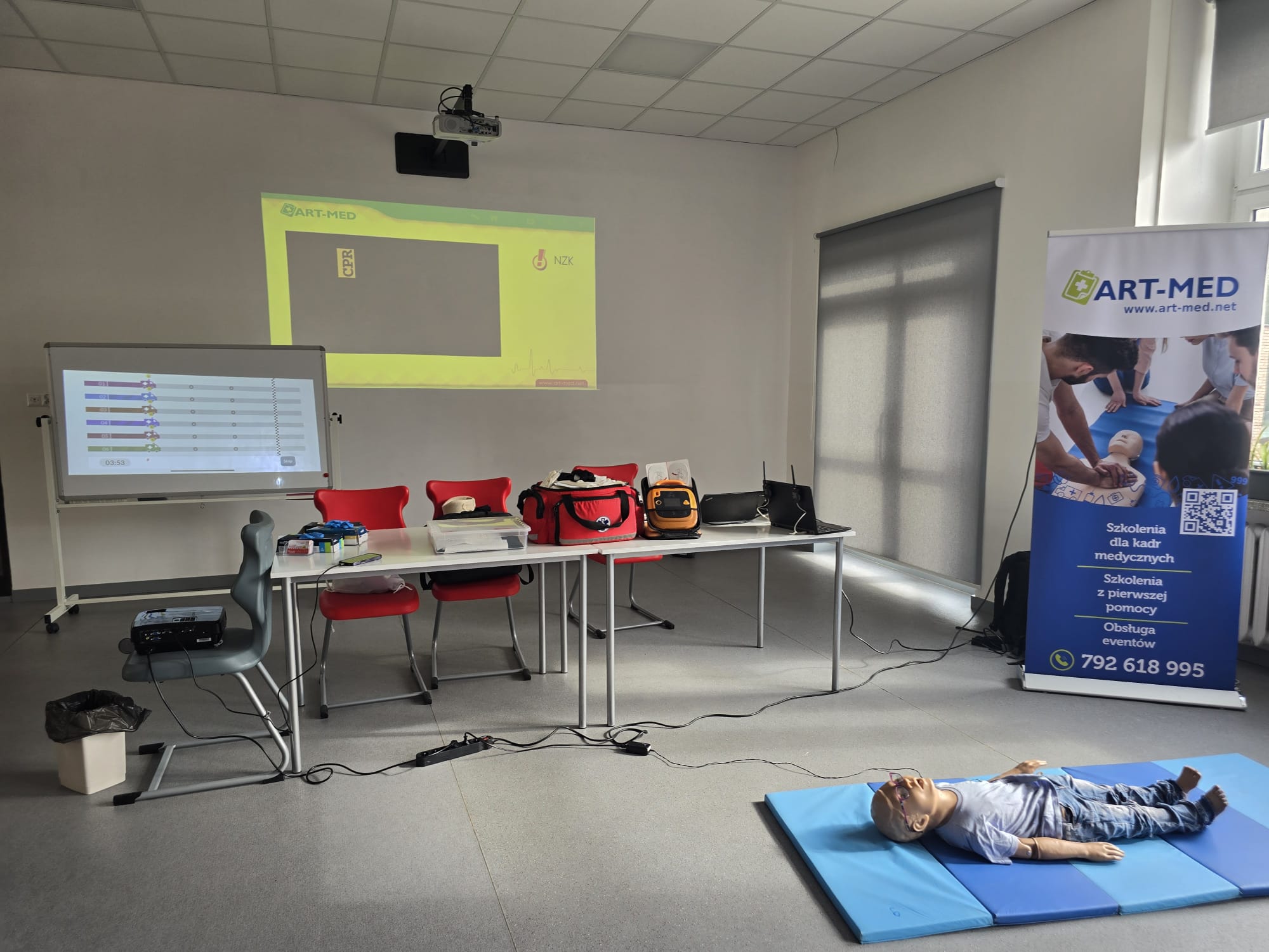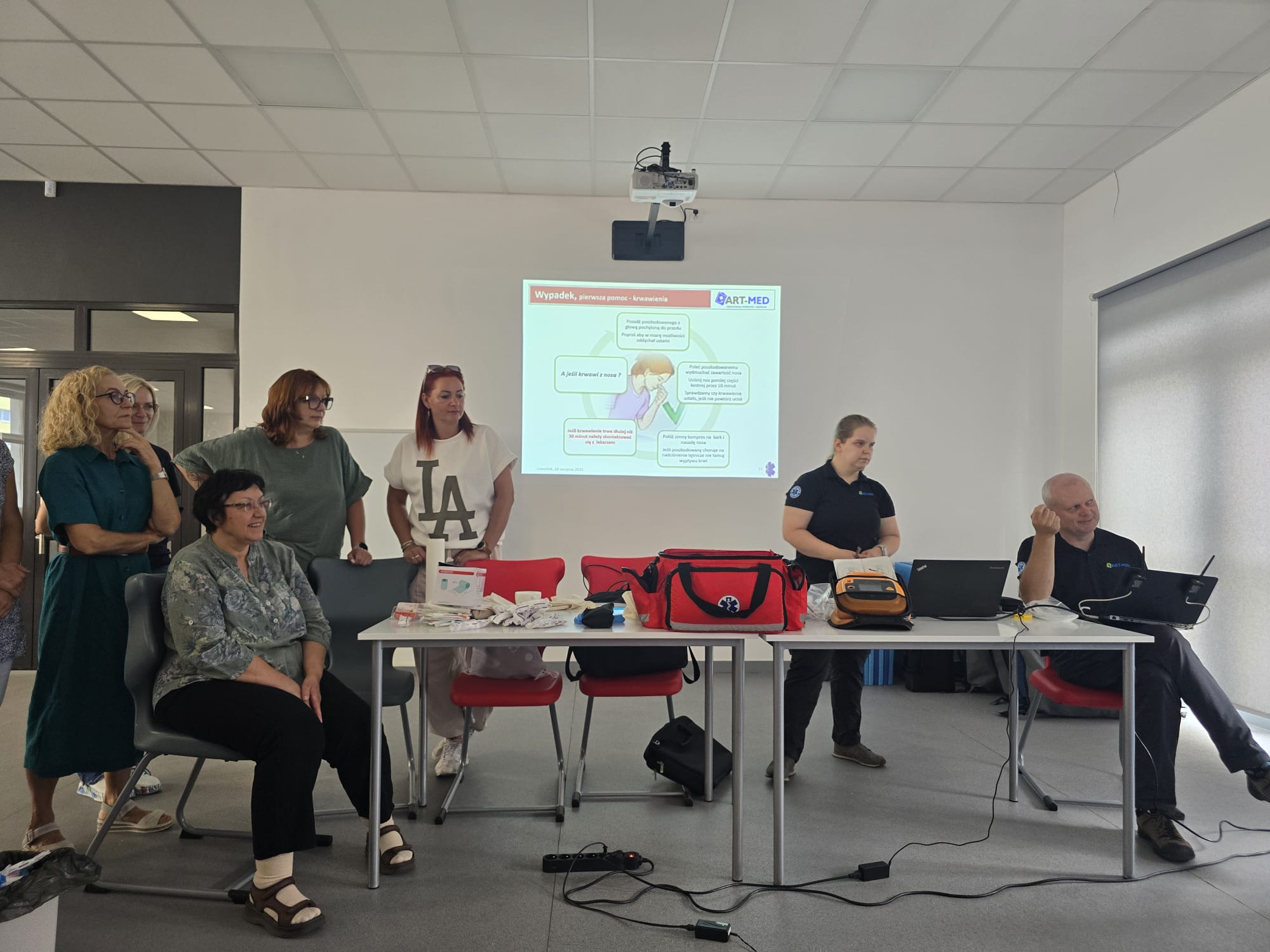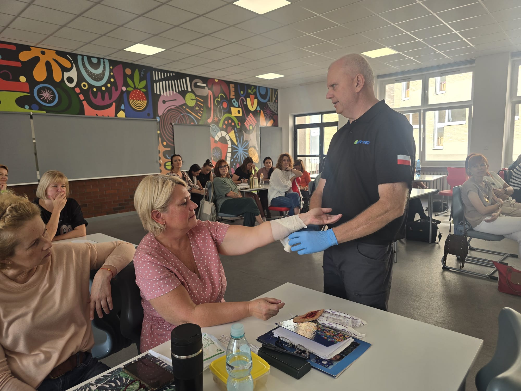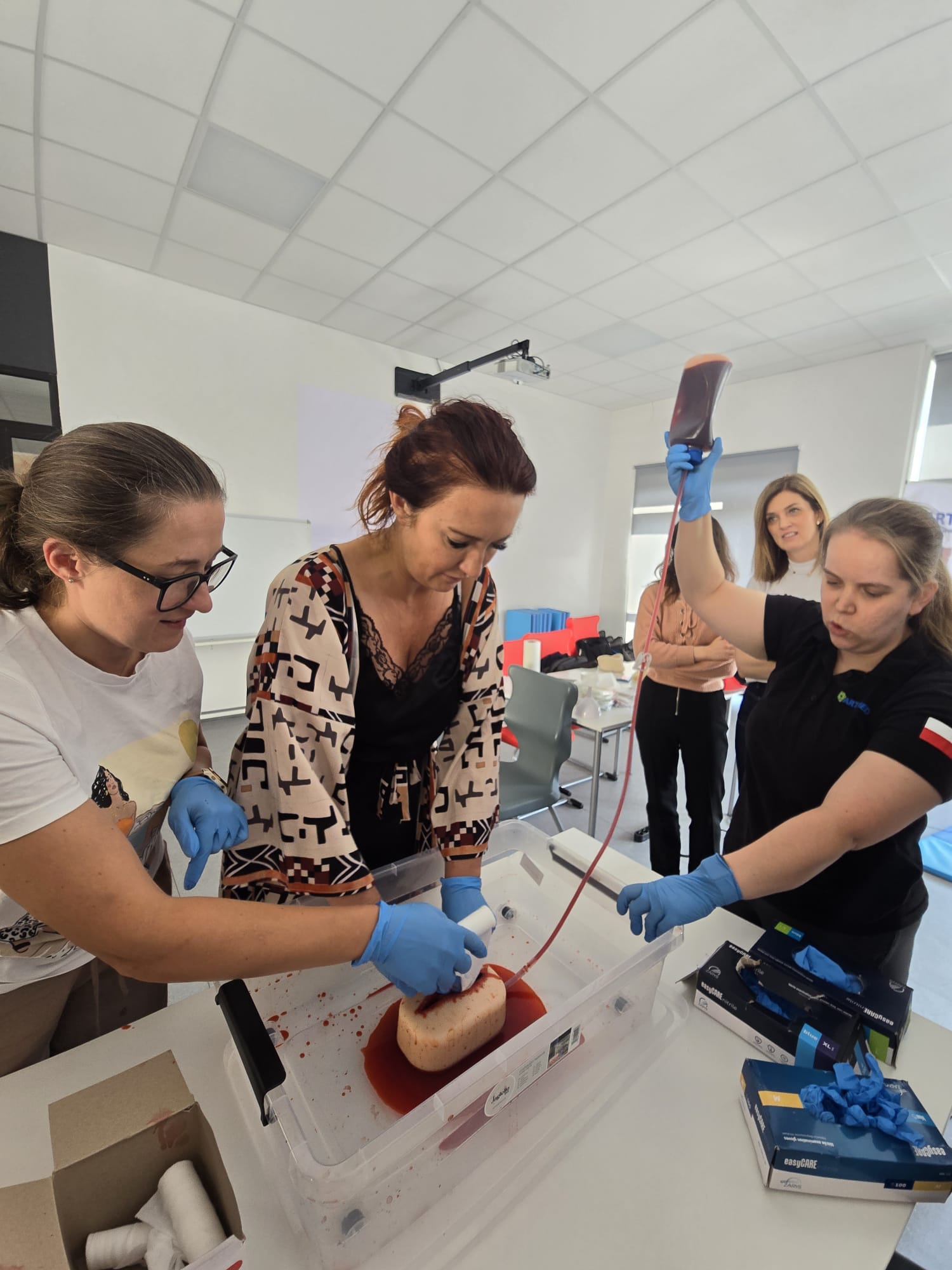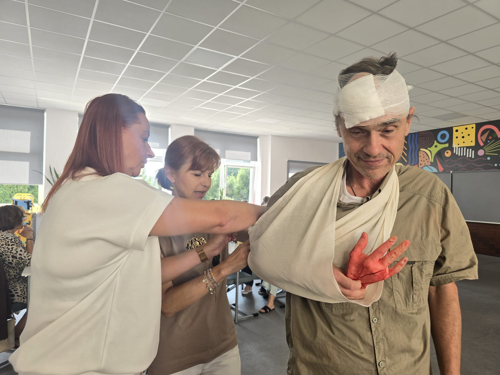 Poruszone zostały zagadnienia m.in. resuscytacji krążeniowo-oddechowej u dorosłych i dzieci, reagowania w razie wstrząsu anafilaktycznego oraz hipoglikemii, opatrywania ran, tamowania krwotoków oraz usztywniania kończyn. Nauczyciele wzięli udział w licznych ćwiczeniach praktycznych, które wyglądały dosyć realistycznie – nie zabrakło otwartych ran i krwotoków. Na szczęście wszyscy „pacjenci” przeżyli :)