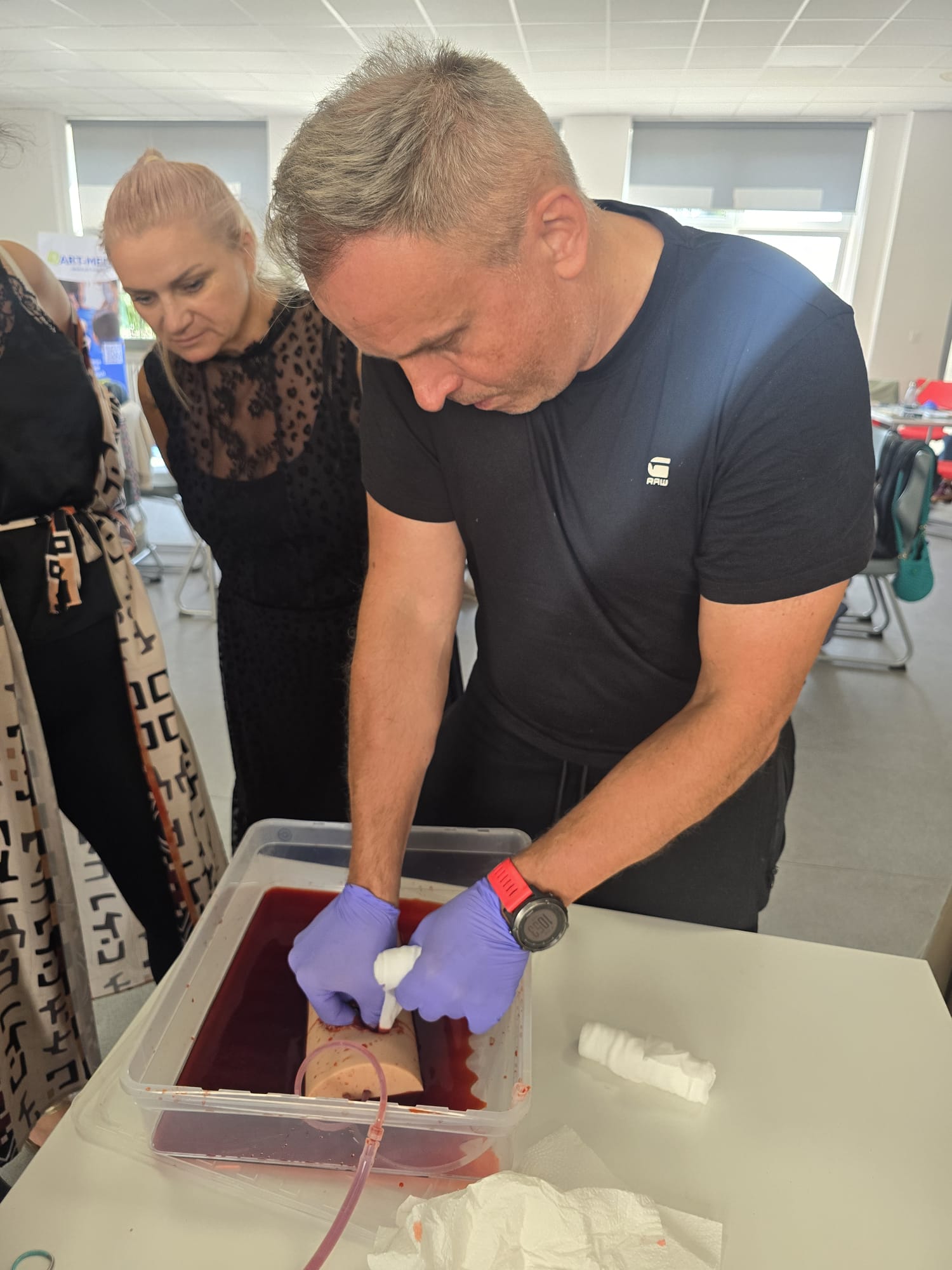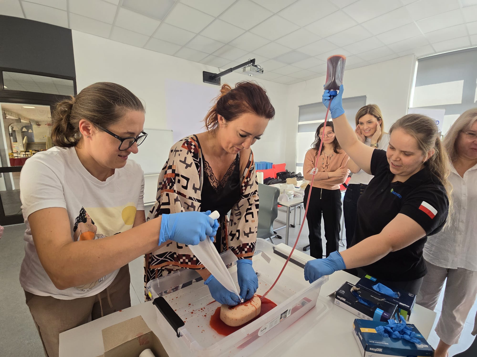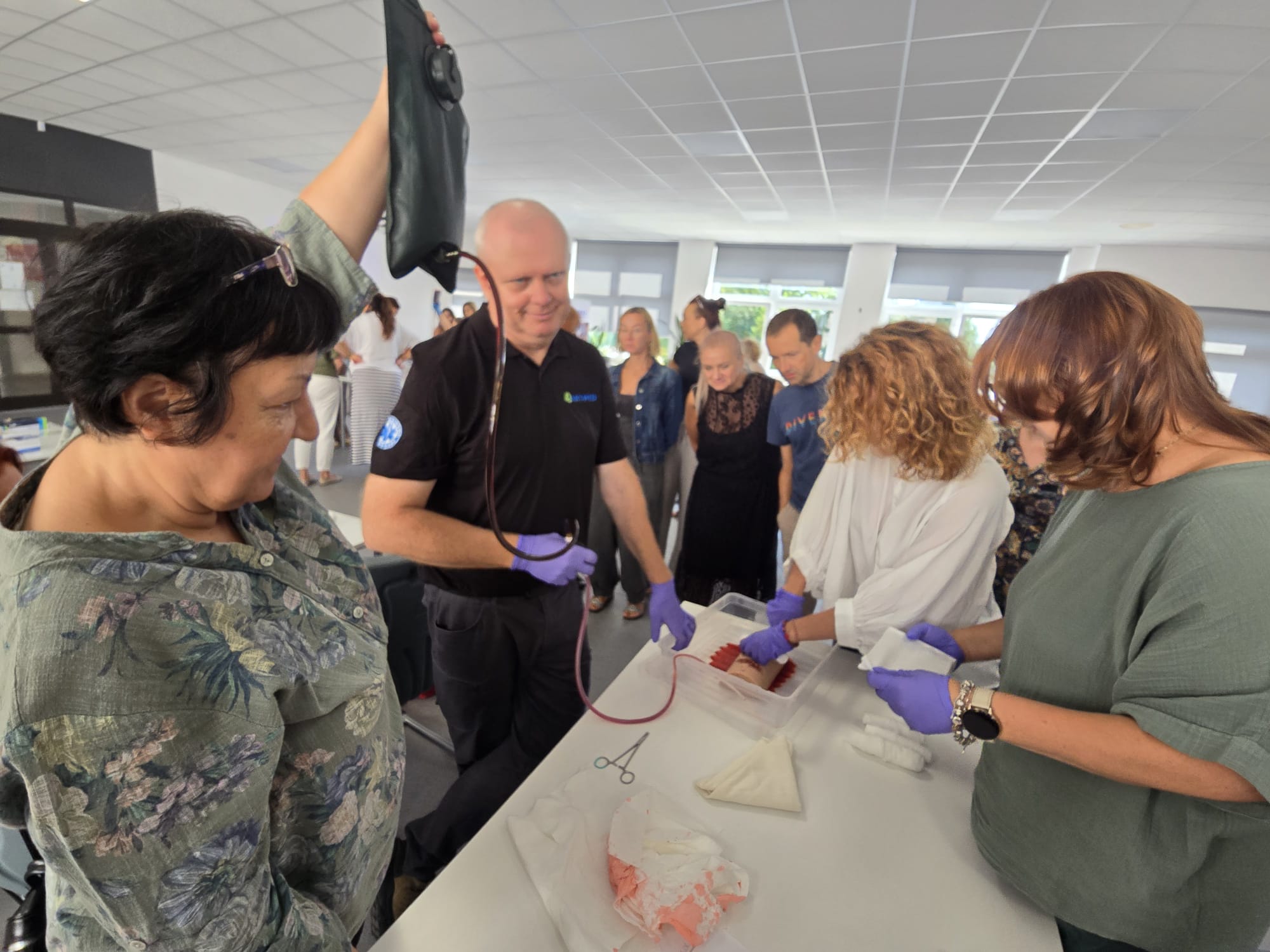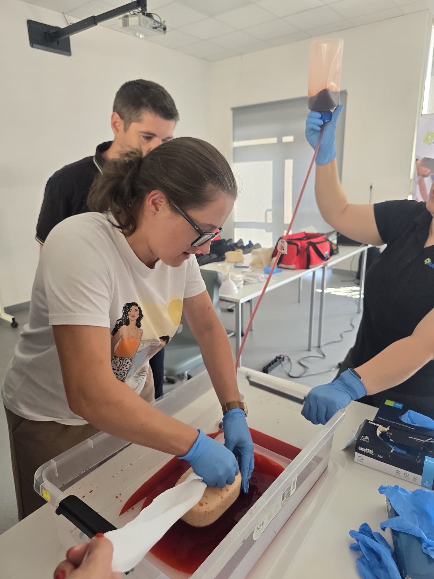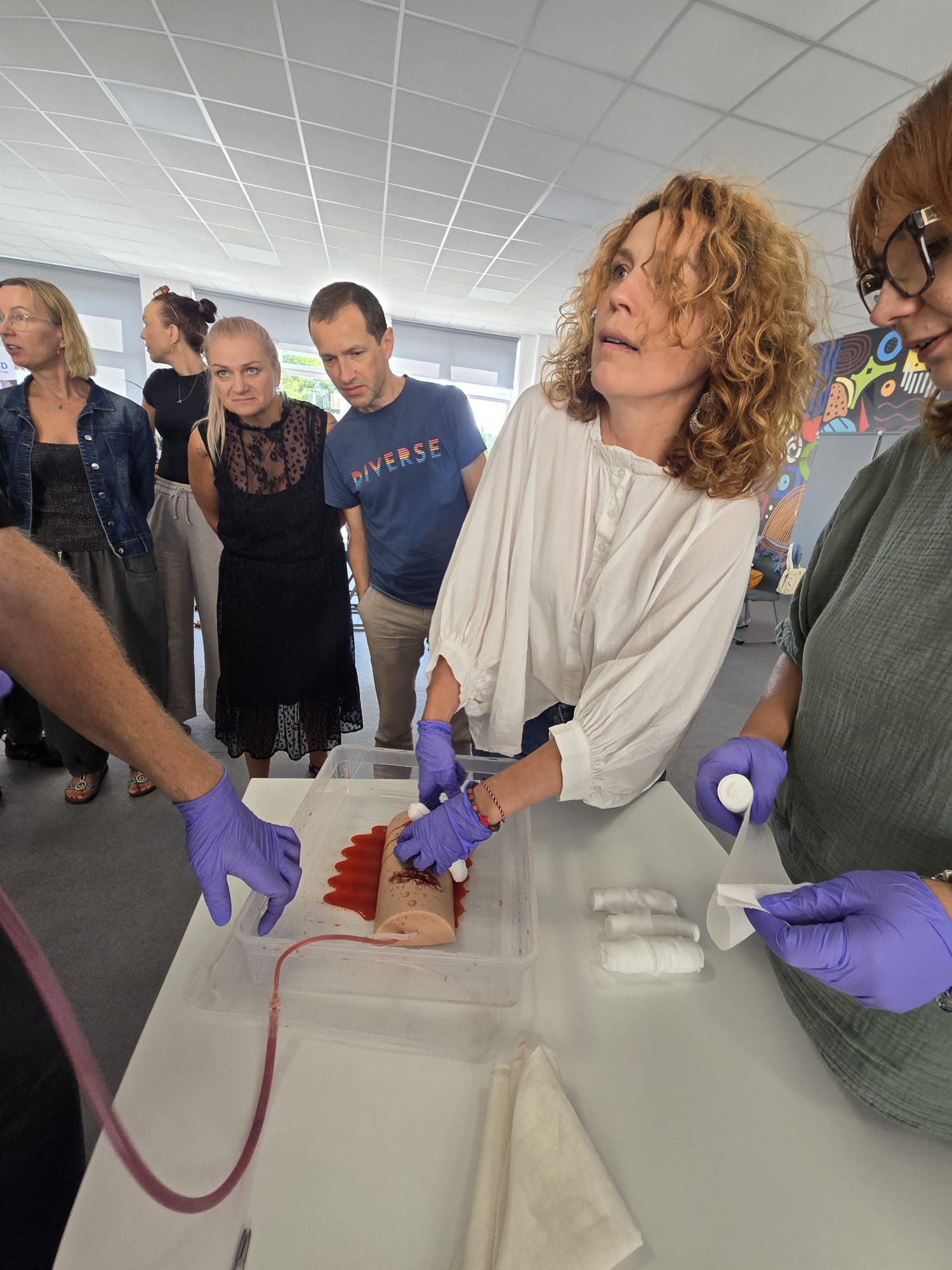 Poruszone zostały zagadnienia m.in. resuscytacji krążeniowo-oddechowej u dorosłych i dzieci, reagowania w razie wstrząsu anafilaktycznego oraz hipoglikemii, opatrywania ran, tamowania krwotoków oraz usztywniania kończyn. Nauczyciele wzięli udział w licznych ćwiczeniach praktycznych, które wyglądały dosyć realistycznie – nie zabrakło otwartych ran i krwotoków. Na szczęście wszyscy „pacjenci” przeżyli :)