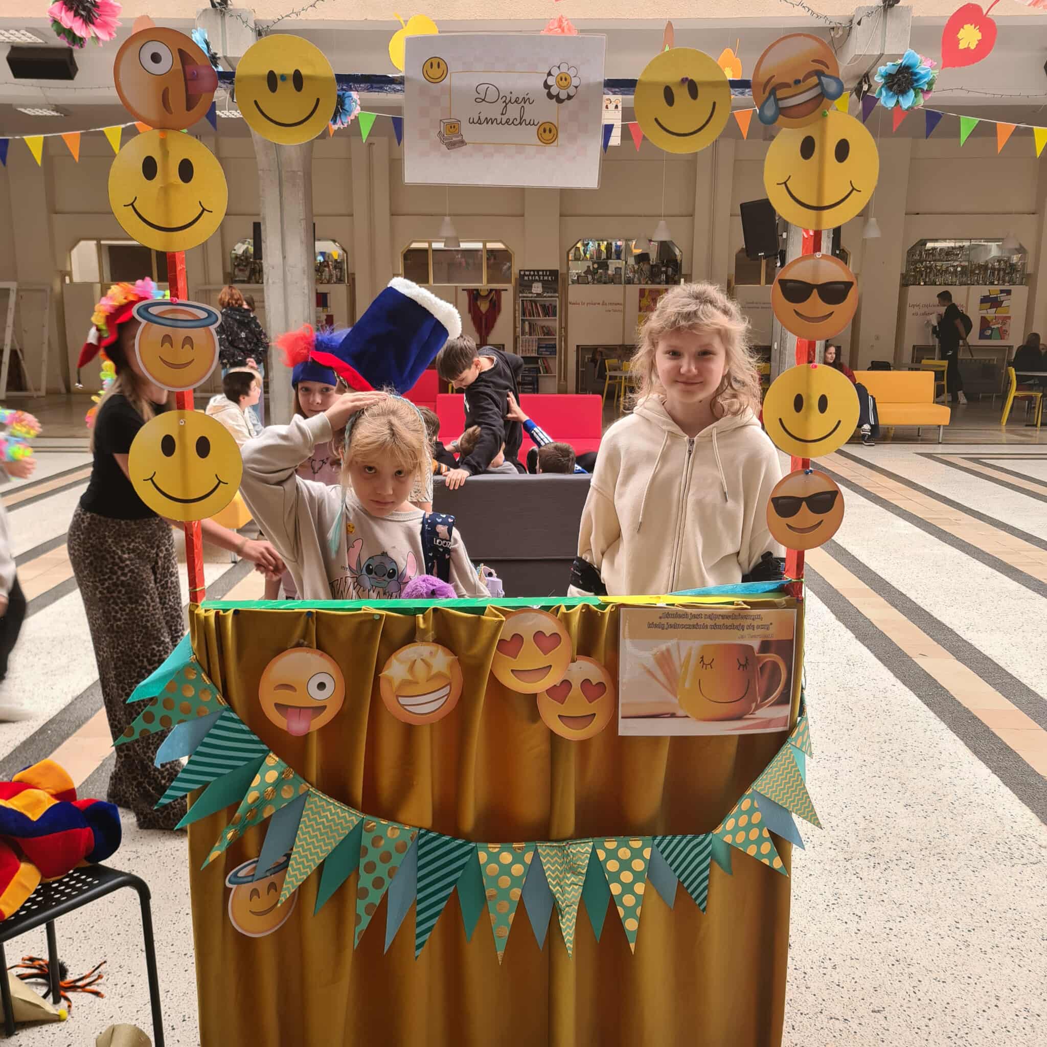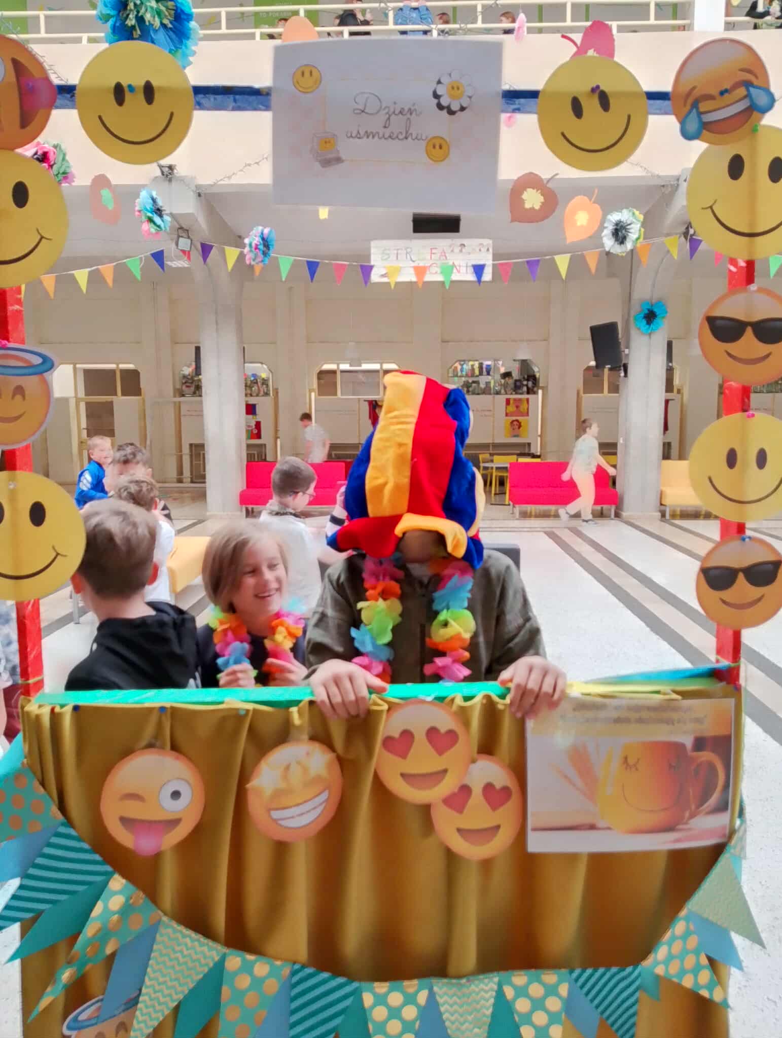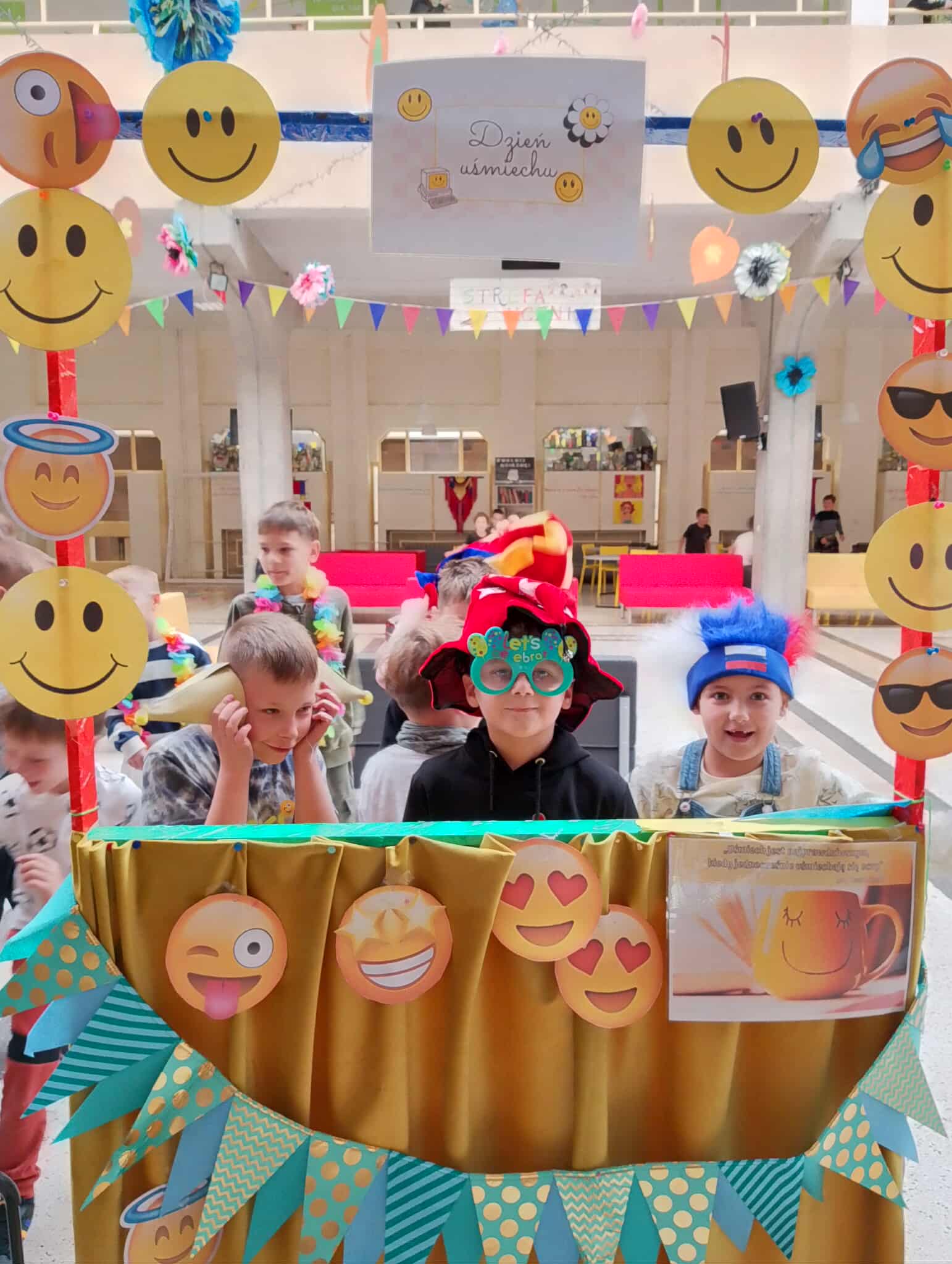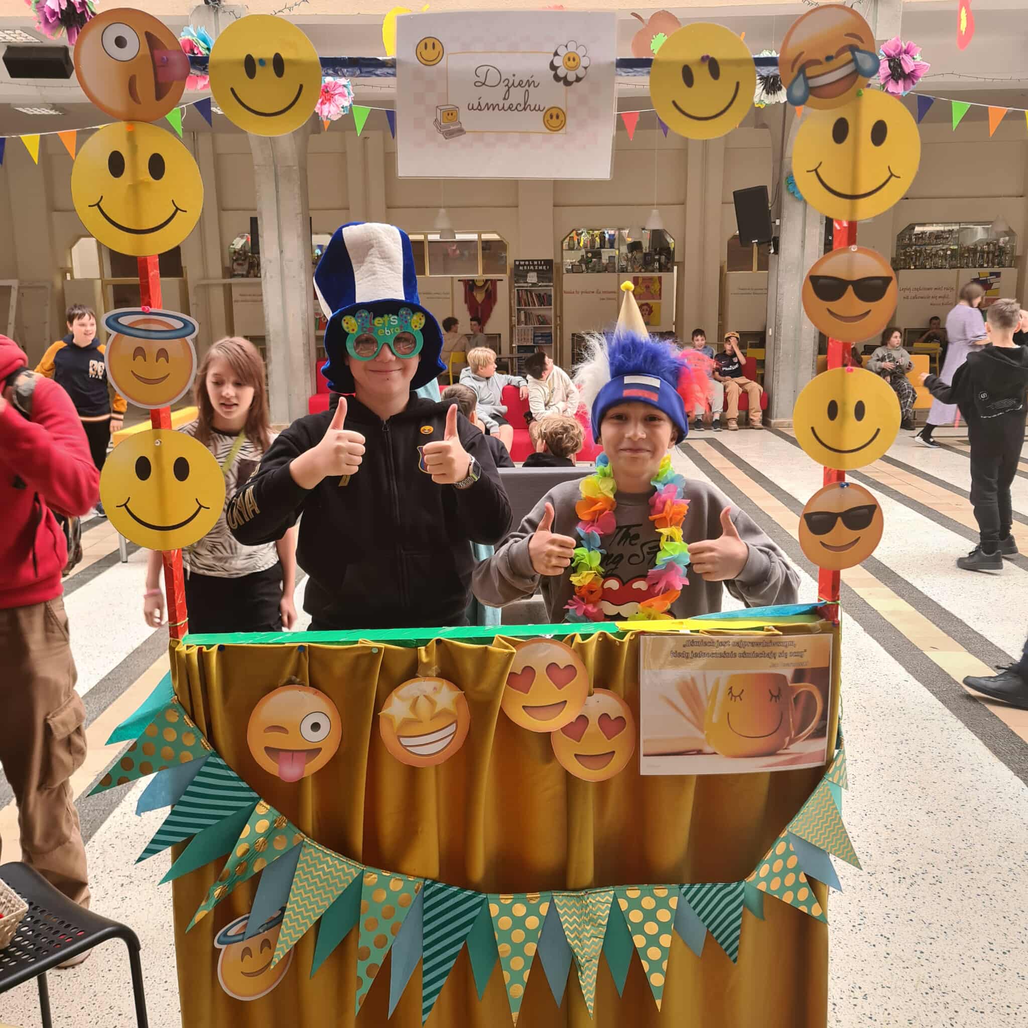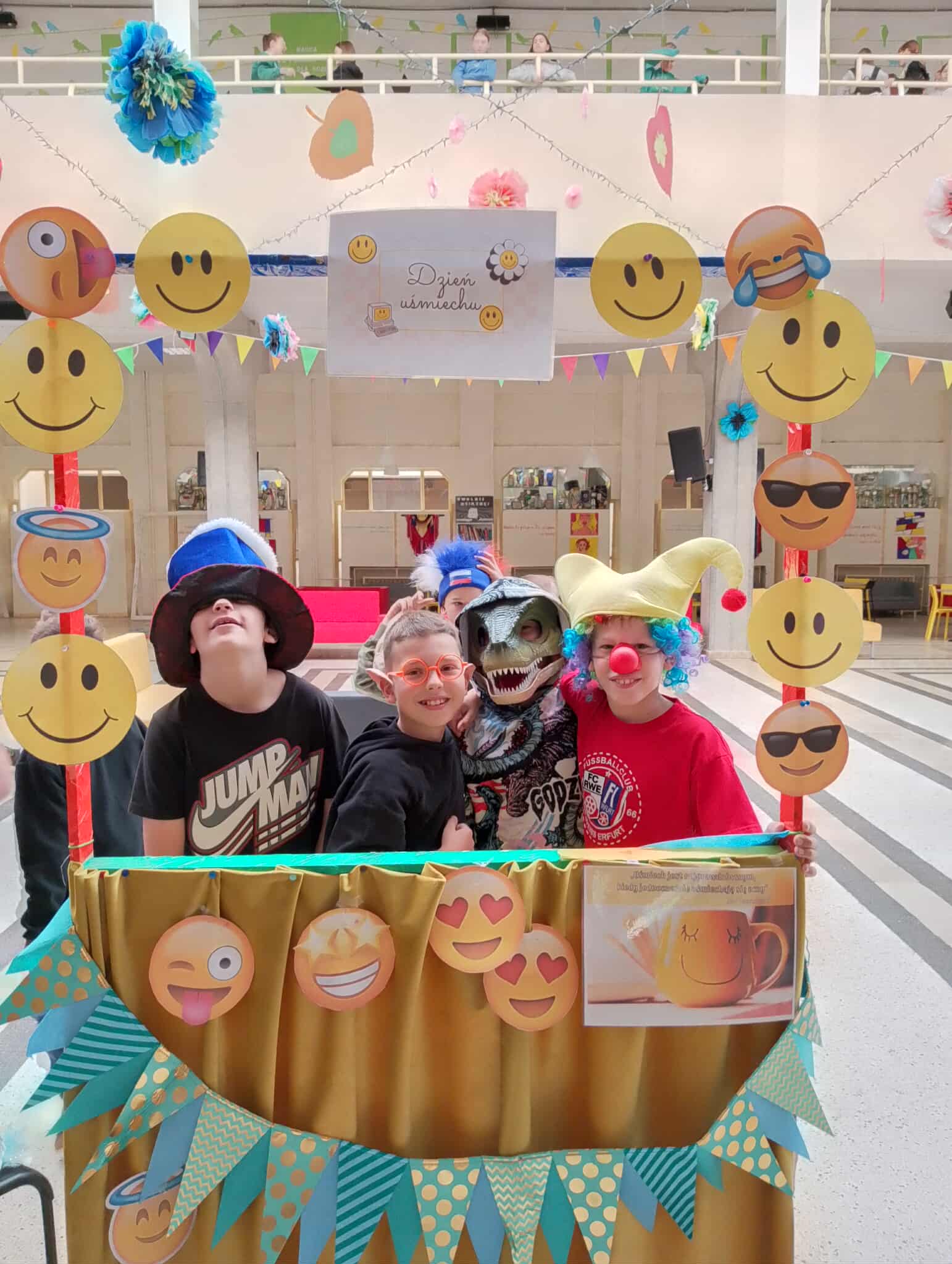 Dziś obchodziliśmy Światowy Dzień Uśmiechu. Z tej okazji w szkolnym holu ustawiona została radosna fotobudka z różnymi akcesoriami.