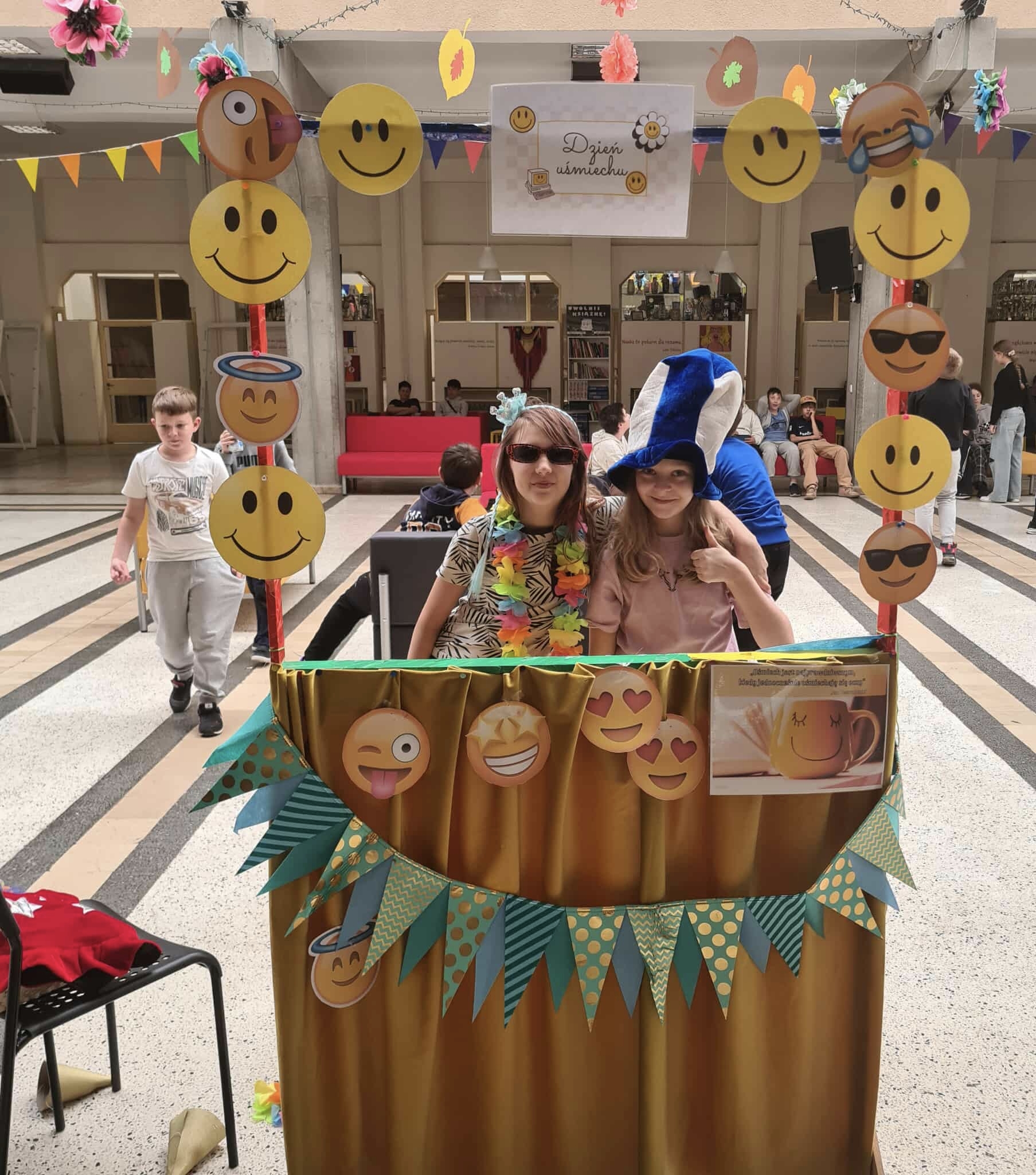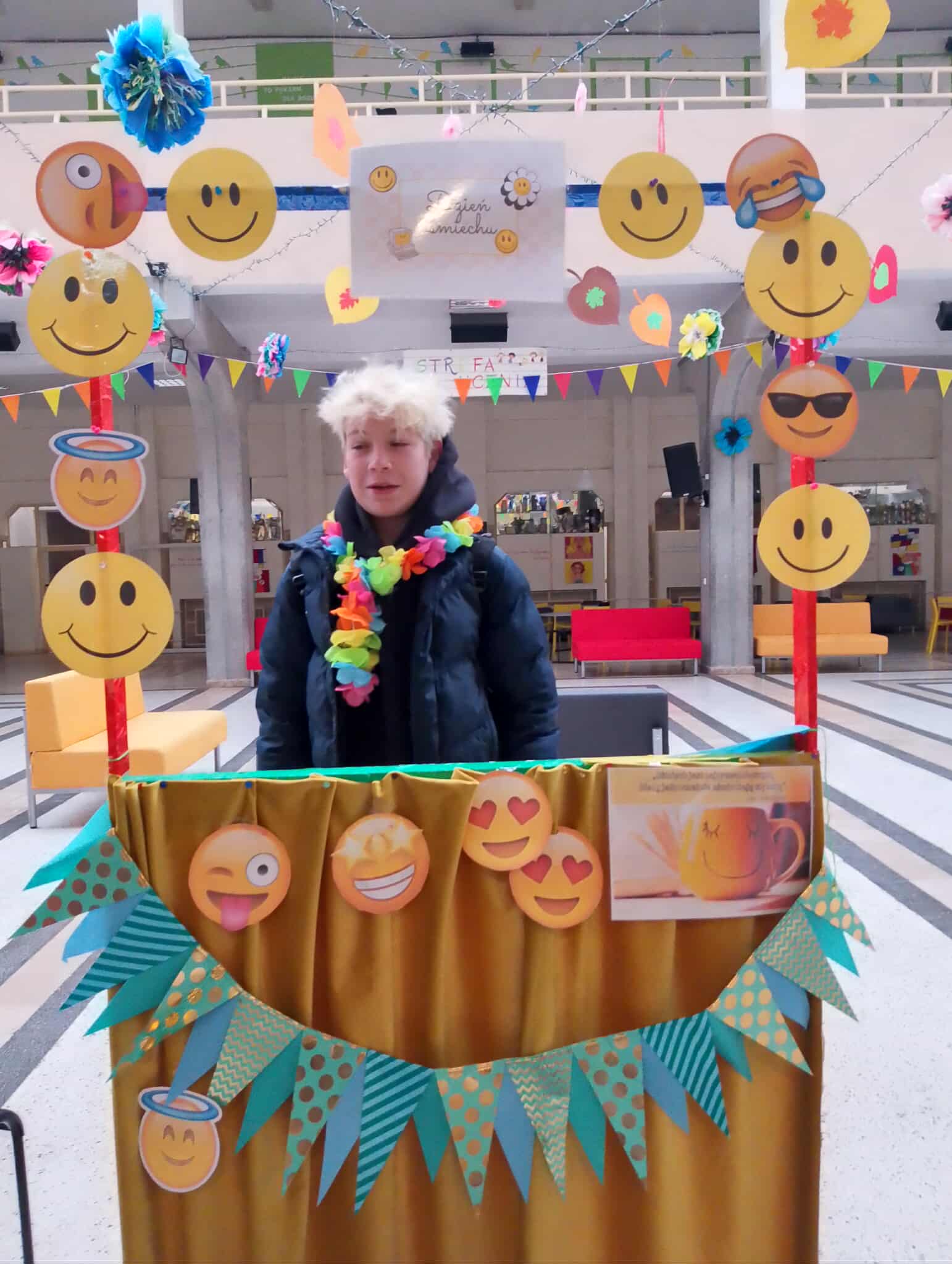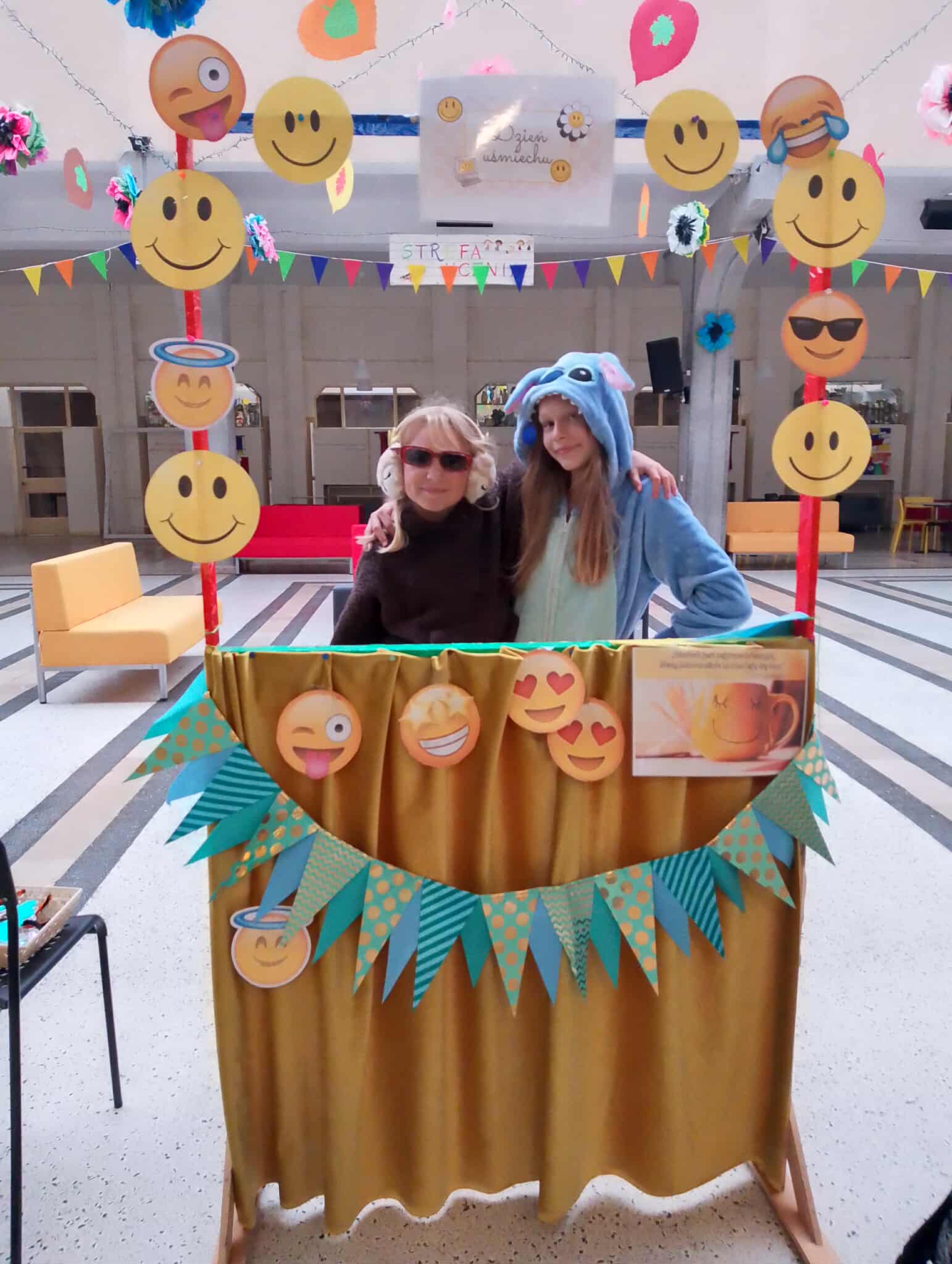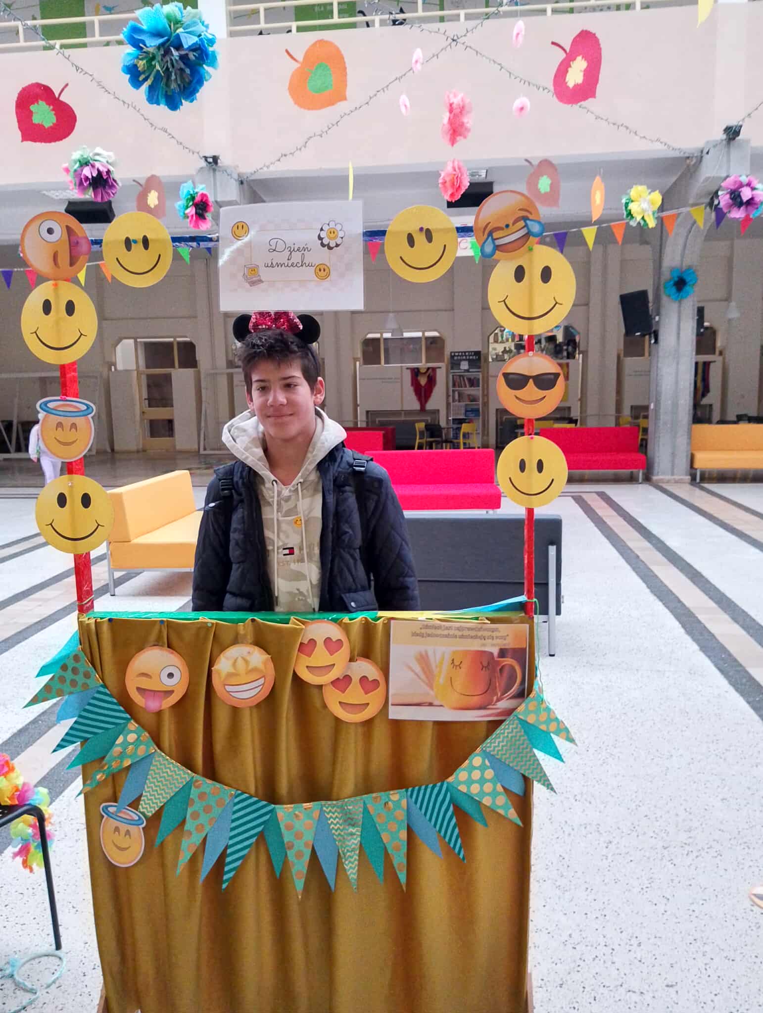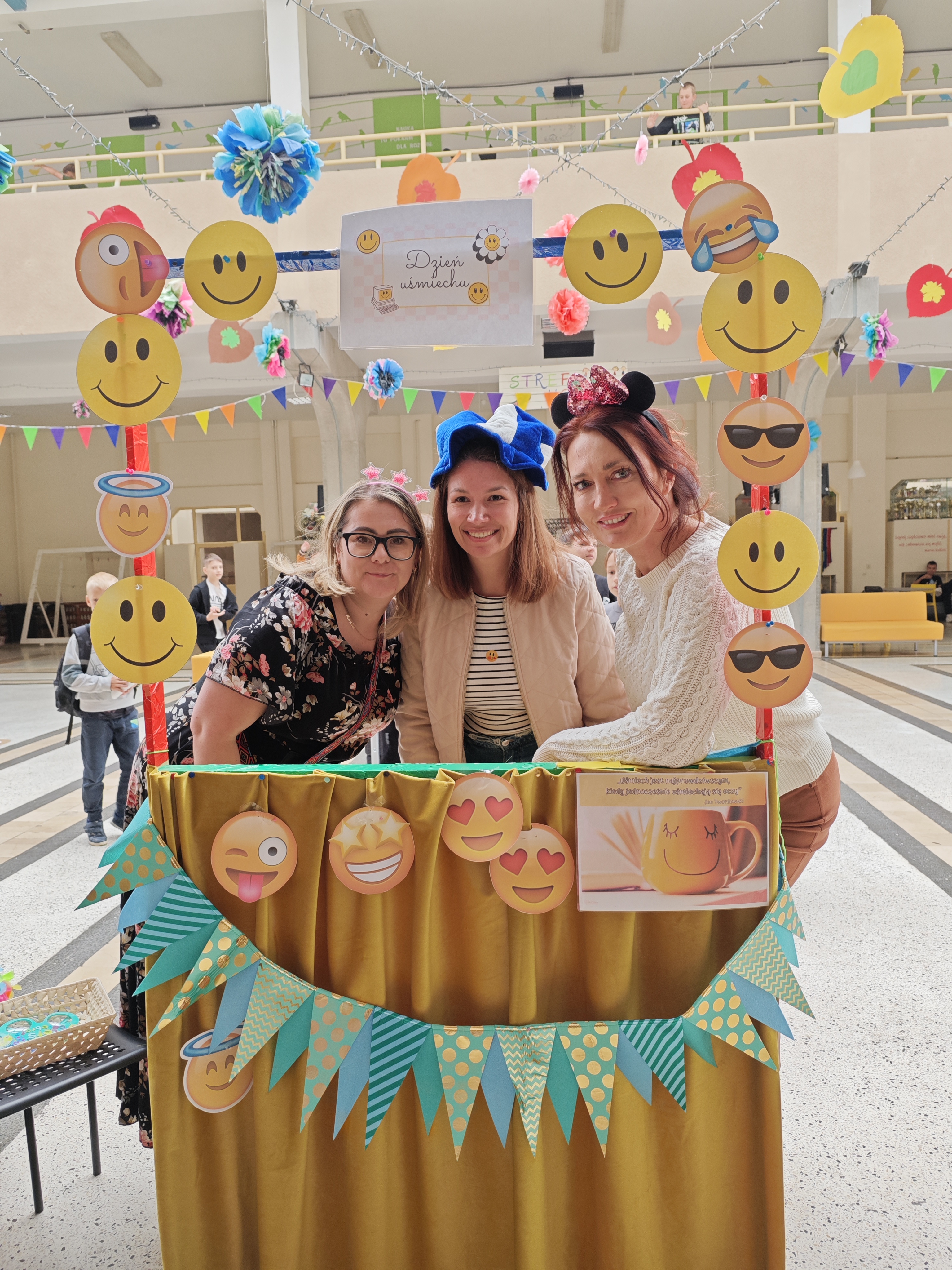 Dziś obchodziliśmy Światowy Dzień Uśmiechu. Z tej okazji w szkolnym holu ustawiona została radosna fotobudka z różnymi akcesoriami.