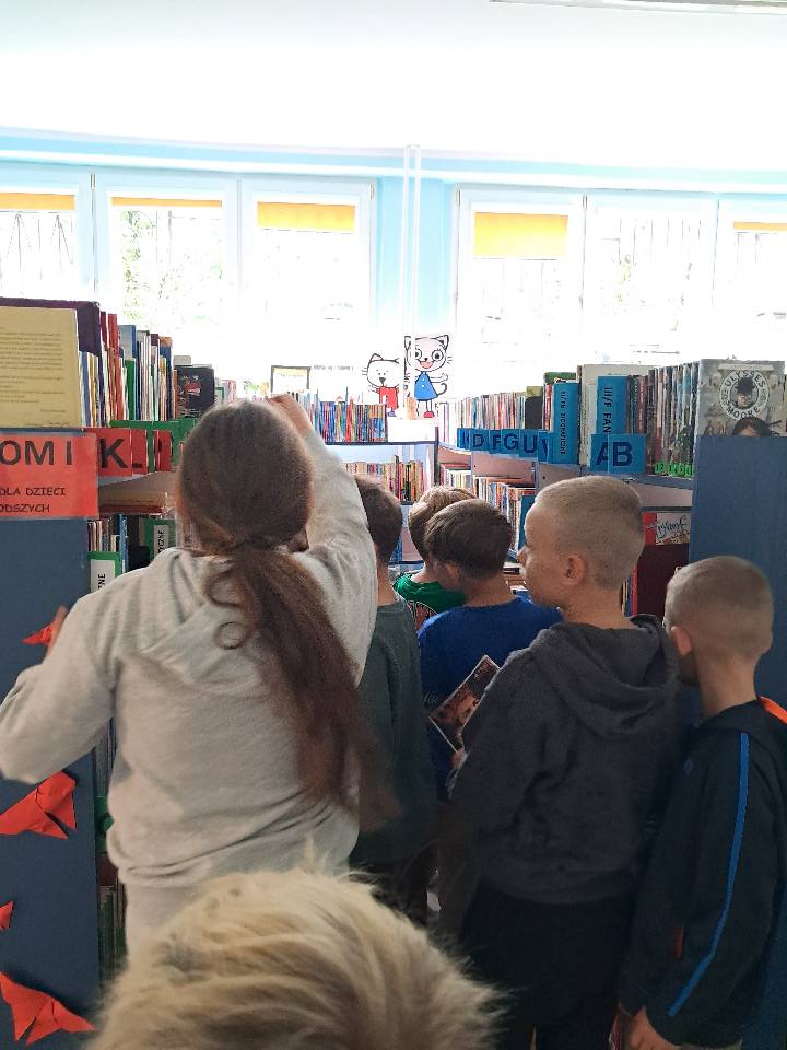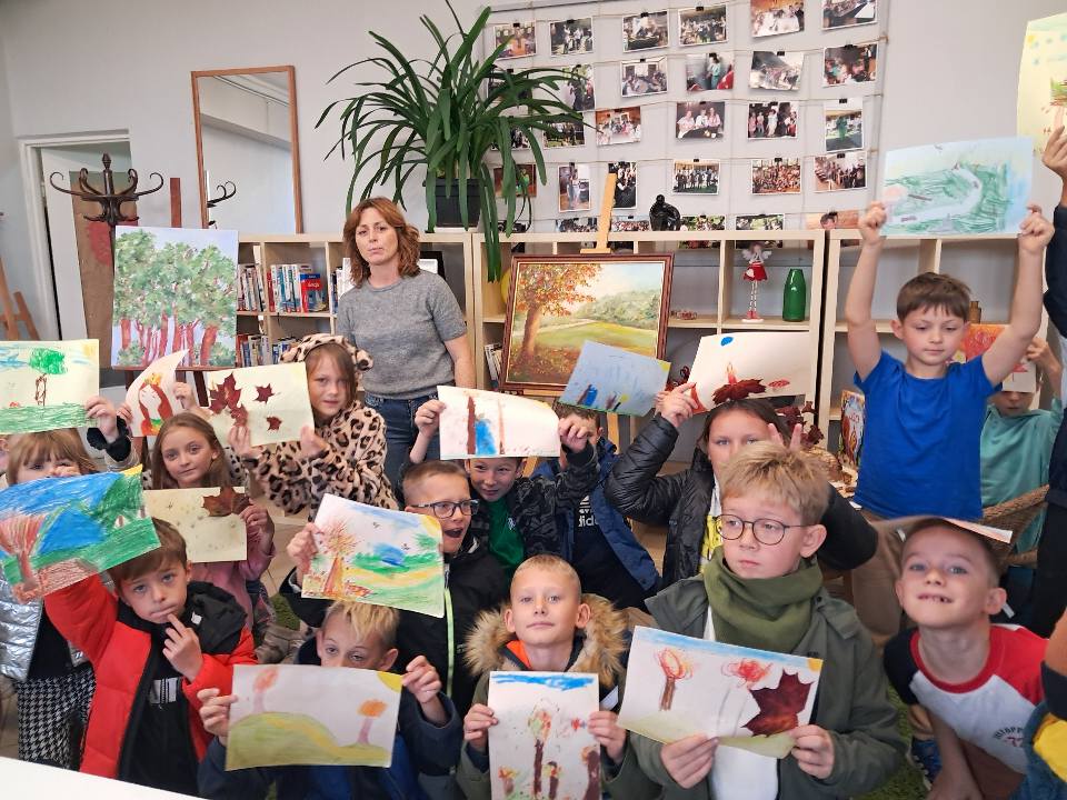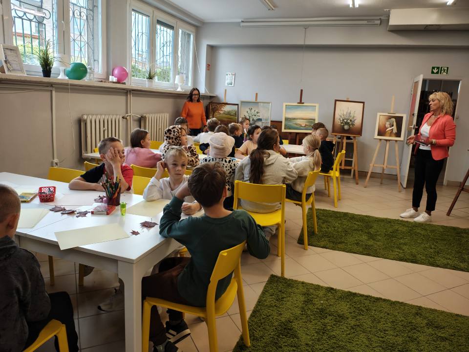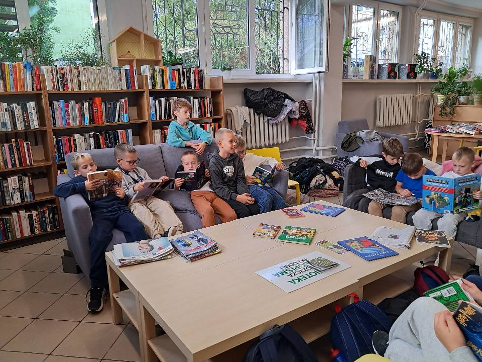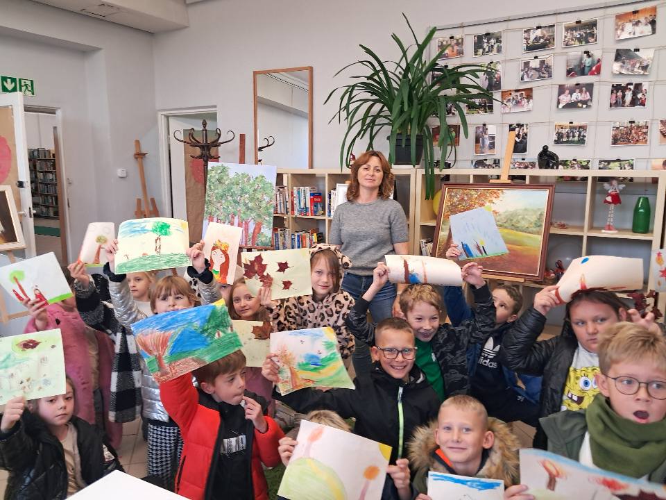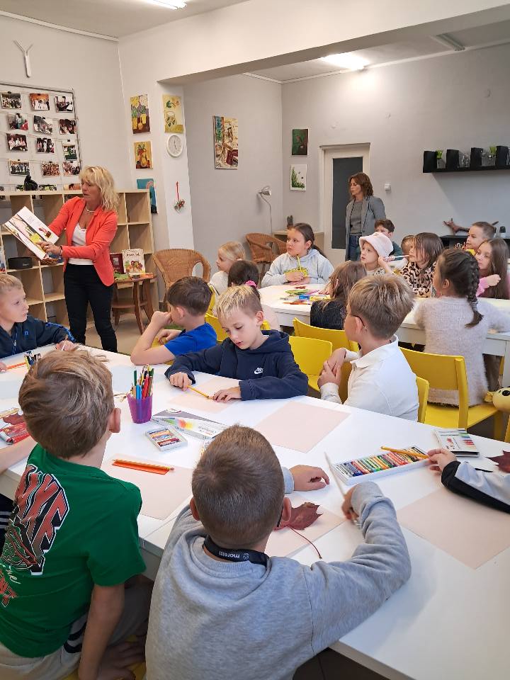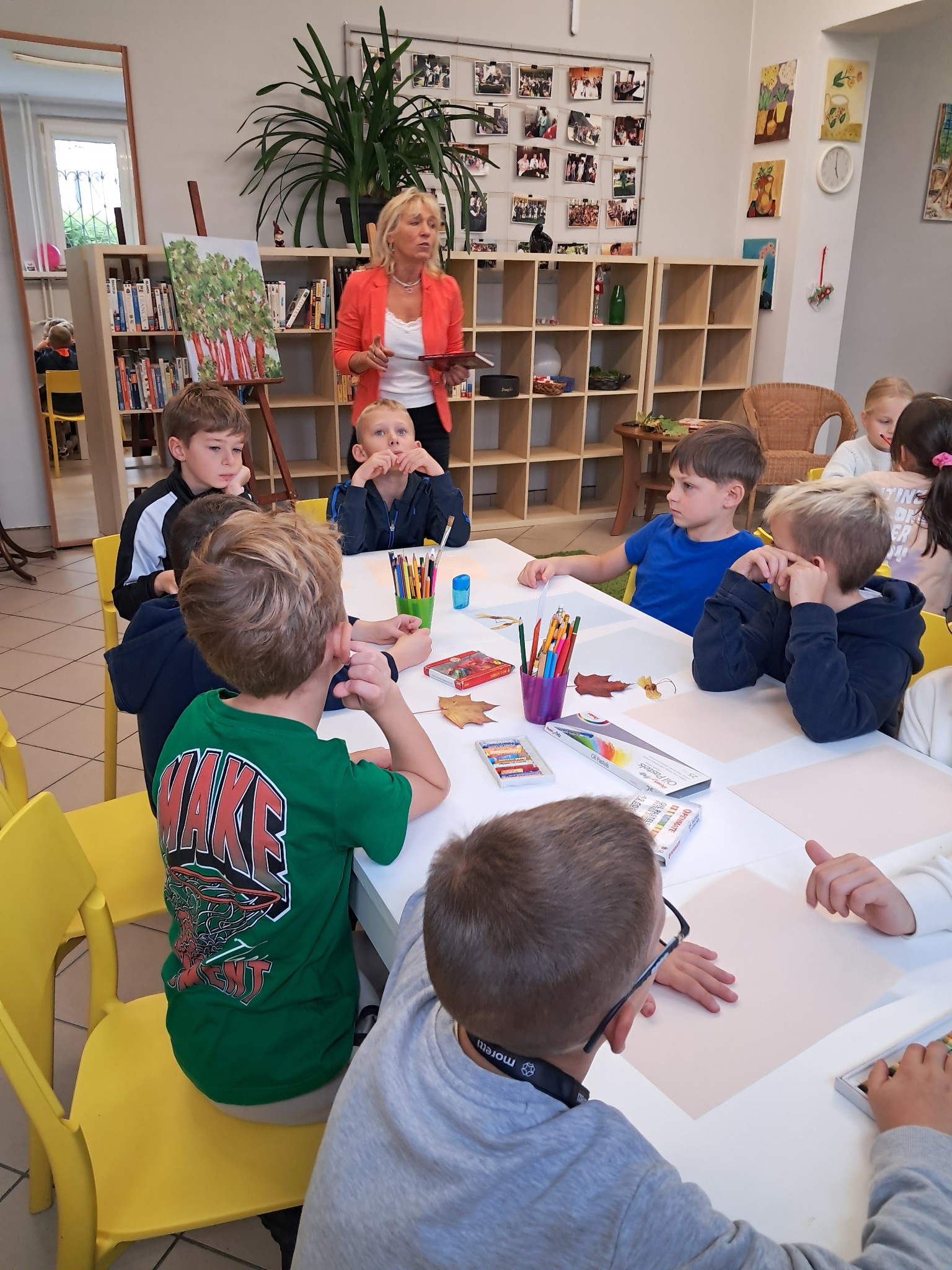 poświęconej literaturze o tematyce jesiennej. Zainspirowani wysłuchanymi tekstami wykonali prace plastyczne, które będzie można podziwiać na wystawie w kąciku czytelniczym. Dzieci obejrzały też pomieszczenia biblioteczne, zwłaszcza nowy kącik dla najmłodszych czytelników oraz zapoznały się ze zbiorami bibliotecznymi. Mogły też poczytać wybraną książkę. Czas upłynął w miłej, twórczej atmosferze, a dzieci obiecały czesto odwiedzać placówkę. Spotkanie zorganizowała szkolna bibliotekarka Mariola Ostrowska, zajęcia poprowadziła bibliotekarka z filii nr8 Pani Barbara Jękorek.