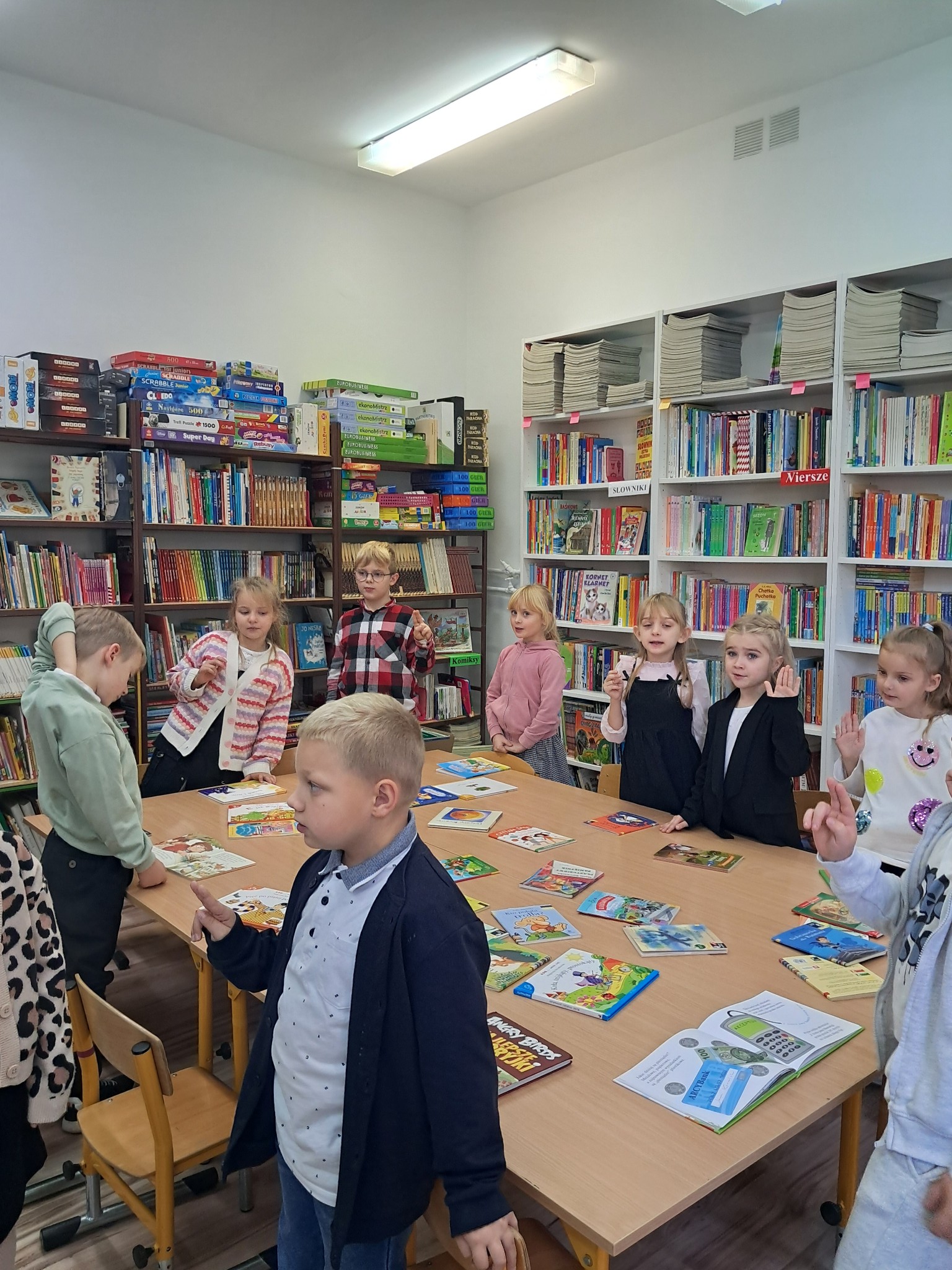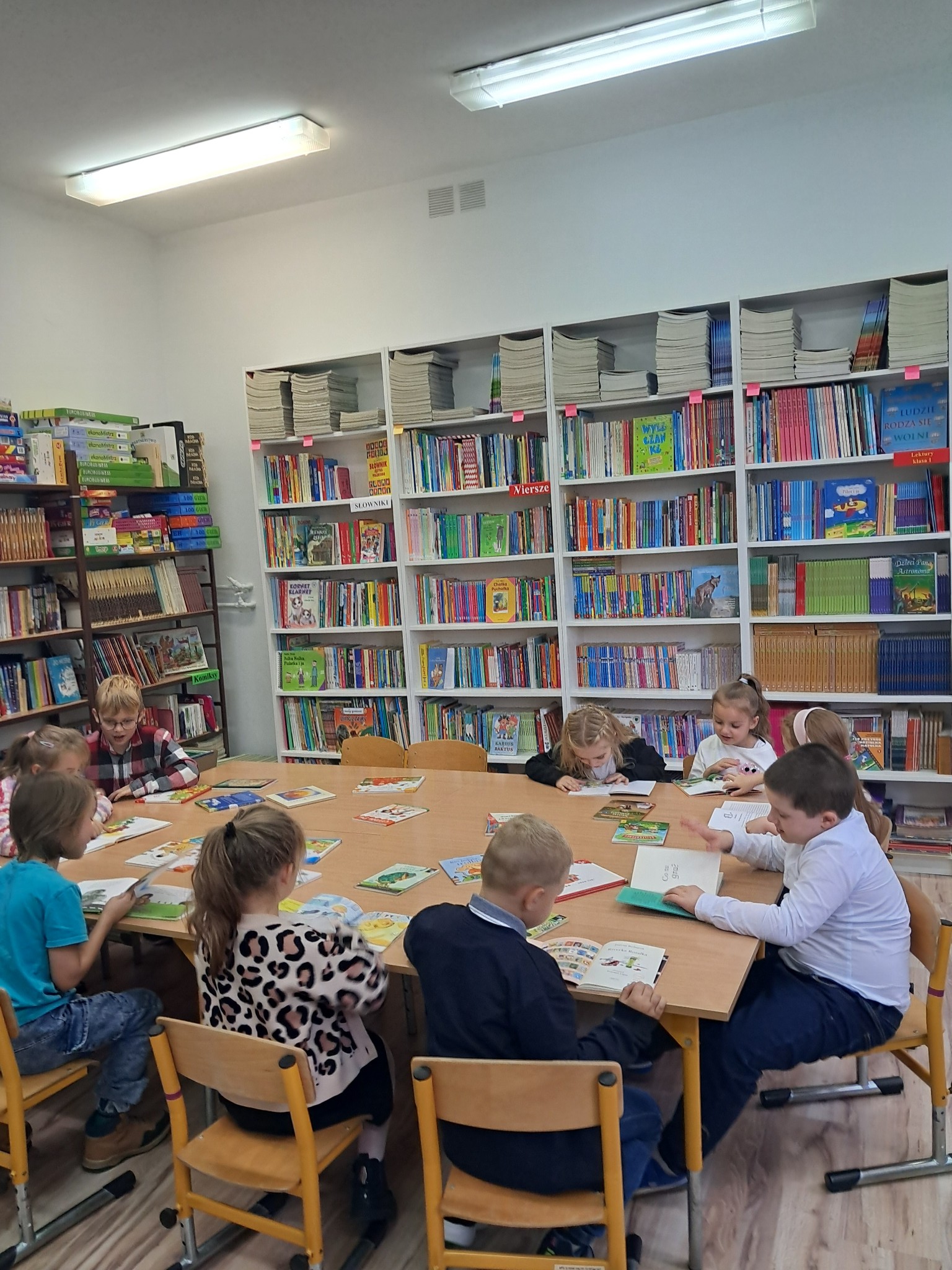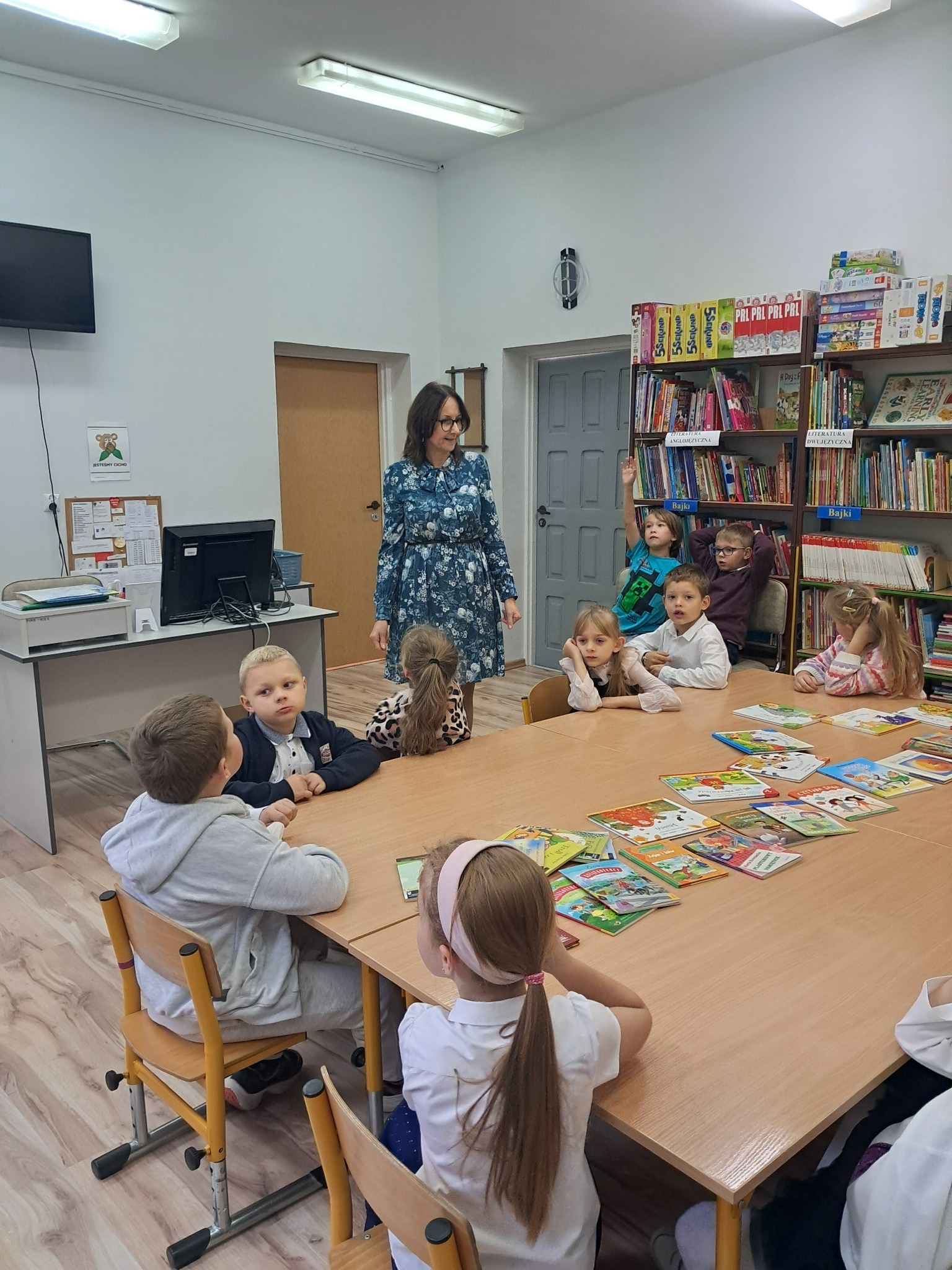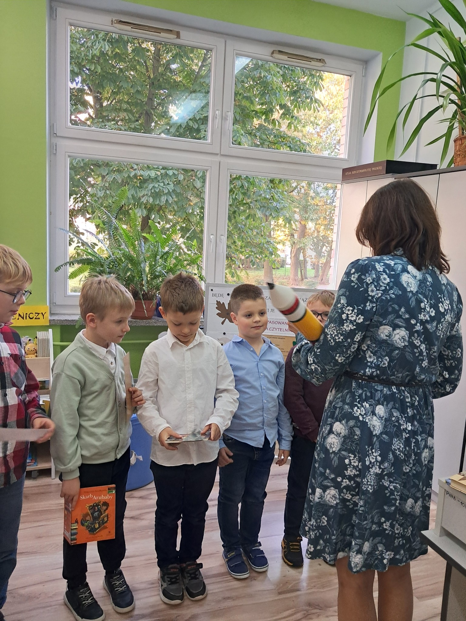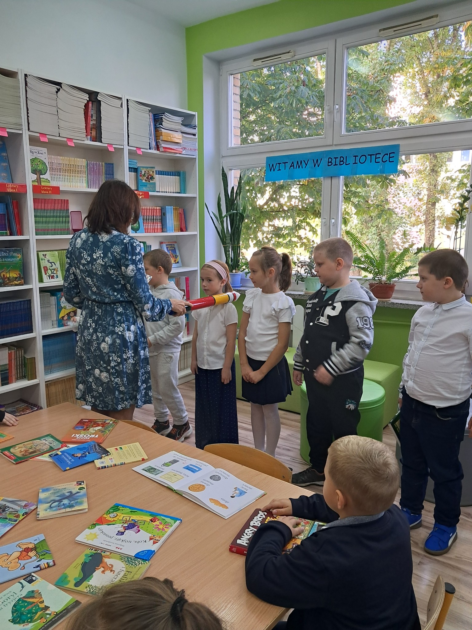 Dzieci poznały zasady korzystania z biblioteki i czytelni oraz zbiory biblioteczne przeznaczone dla ich grupy wiekowej. Następnie złożyły uroczyste przyrzeczenie przestrzegania obowiązków czytelnika. Każdy uczeń otrzymał piękną, kolorową zakładkę wykonaną przez szkolnych wolontariuszy. Na koniec czytelnicy z 1a wypożyczyli wybraną przez siebie książkę. Zajęcia poprowadziła bibliotekarka Mariola Ostrowska.